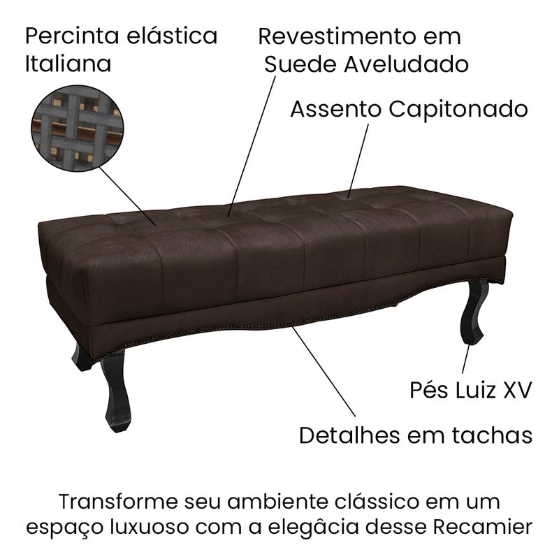 O Puff Recamier Vicenza de 195cm é uma peça de mobiliário elegante e funcional, projetada para adicionar um toque de sofisticação e conforto ao seu ambiente. Sua estrutura é construída com madeira de eucalipto reflorestada mdf, garantindo durabilidade e sustentabilidade ambiental. Os pés são feitos de madeira maciça no estilo Luís XV, proporcionando estabilidade e robustez à peça. A densidade da espuma, classificada como D26, assegura um suporte confortável para o usuário, ideal para momentos de relaxamento e descanso. O tecido em Suede em tom Café confere um acabamento suave e luxuoso, adicionando um toque de requinte ao design. Contém detalhes refinados como as tachinhas em metal fumê na borda, no assento contém detalhes em capitonê onde o estofamento é marcado com fios grossos, costurados ao tecido, formando saliências geométricas, enquanto a presença de percinta elástica italiana assegura suporte adicional e durabilidade. Com uma capacidade de suportar até 120 kg, o Puff Recamier oferece conforto e segurança para diferentes usuários. Quanto ao uso, o Puff Recamier pode ser utilizado em diversos ambientes, desde o quarto como um elegante banco no pé da cama, até a sala de estar como um sofá auxiliar ou até mesmo em espaços comerciais, como recepções ou salas de espera, adicionando conforto e estilo onde quer que esteja. Seja como um elemento decorativo ou como um lugar para relaxar, este móvel é uma escolha versátil e elegante para qualquer ambiente. Dimensões do Produto: Altura total: 45 cm Largura total: 195 cm Profundidade total: 50 cm Peso: 25 kg Altura dos Pés: 24 cm Especificações do Produto: Estrutura: Madeira Eucalipto Reflorestada Tipo de pés: Madeira Maciça no estilo Luís XV Densidade da Espuma: D26 Tecido: Suede Diferenciais: Tachinhas em metal fumê. No assento possui detalhes em capitonê e percinta elástica Italiana Peso suportado: Até 120 Kg Garantia: 90 dias contra defeito de fabricação Montagem: O produto é enviado montado, sendo necessário apenas fixar os pés Instruções de limpeza: Utilizar um pano limpo e levemente úmido Você irá receber: 01 Puff Recamier Entregue em: 01 Volume
