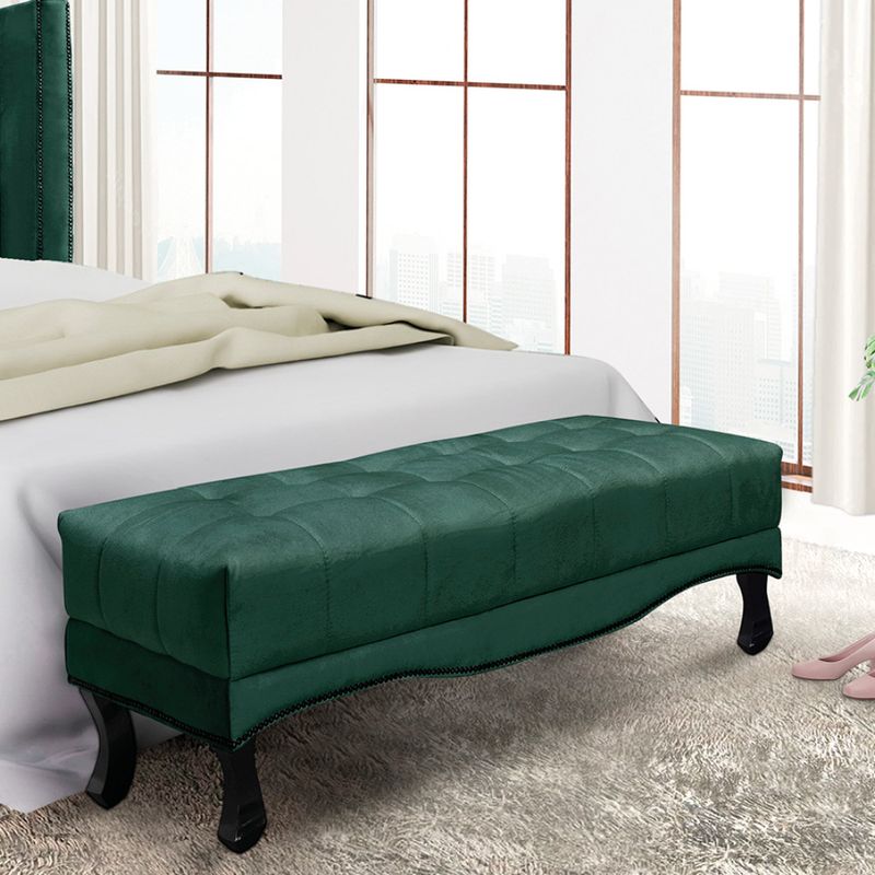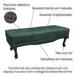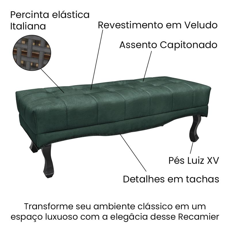 O Puff Recamier Vicenza de 195cm é uma peça de mobiliário elegante e funcional, projetada para adicionar um toque de sofisticação e conforto ao seu ambiente. Sua estrutura é construída com madeira de eucalipto reflorestada mdf, garantindo durabilidade e sustentabilidade ambiental. Os pés são feitos de madeira maciça no estilo Luís XV, proporcionando estabilidade e robustez à peça. A densidade da espuma, classificada como D26, assegura um suporte confortável para o usuário, ideal para momentos de relaxamento e descanso. O tecido em Veludo em tom Verde confere um acabamento suave e luxuoso, adicionando um toque de requinte ao design. Contém detalhes refinados como as tachinhas em metal fumê na borda, no assento contém detalhes em capitonê onde o estofamento é marcado com fios grossos, costurados ao tecido, formando saliências geométricas, enquanto a presença de percinta elástica italiana assegura suporte adicional e durabilidade. Com uma capacidade de suportar até 120 kg, o Puff Recamier oferece conforto e segurança para diferentes usuários. Quanto ao uso, o Puff Recamier pode ser utilizado em diversos ambientes, desde o quarto como um elegante banco no pé da cama, até a sala de estar como um sofá auxiliar ou até mesmo em espaços comerciais, como recepções ou salas de espera, adicionando conforto e estilo onde quer que esteja. Seja como um elemento decorativo ou como um lugar para relaxar, este móvel é uma escolha versátil e elegante para qualquer ambiente. Dimensões do Produto: Altura total: 45 cm Largura total: 195 cm Profundidade total: 50 cm Peso: 26 kg Altura dos Pés: 24 cm Especificações do Produto: Estrutura: Madeira Eucalipto Reflorestada Tipo de pés: Madeira Maciça no estilo Luís XV Densidade da Espuma: D26 Tecido: Veludo Diferenciais: Tachinhas em metal fumê. No assento possui detalhes em capitonê e percinta elástica Italiana Peso suportado: Até 120 Kg Garantia: 90 dias contra defeito de fabricação Montagem: O produto é enviado montado, sendo necessário apenas fixar os pés Instruções de limpeza: Utilizar um pano limpo e levemente úmido Você irá receber: 01 Puff Recamier Entregue em: 01 Volume