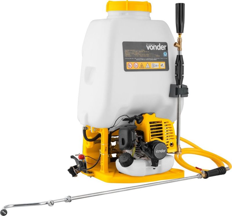 Marca: VonderConteúdo da embalagem: 1 Pulverizador. Acompanha: 1 extensão, 1 lança com 2 bicos leque, 1 lança reta com regulador e bico cônico, 1 mangueira de pressão, 1 empunhadura, 1 kit de vedação, 1 chave de vela, 1 frasco dosador, 1 alça costal, 1 chave allen 10 mm, 1 chave allen 6 mm e 1 chave phillips.Destaques e diferenciais:Possui alça ergonômica regulável, oferecendo maior conforto e ergonomia ao operador. Conta com válvula de ajuste de pressão, permitindo que o equipamento seja regulado de acordo com a necessidade de cada situação de uso/ aplicação.Dicas de uso:Ótimo desempenho e ergonomia para pulverização em áreas agrícolas para prevenção, controle e combate de pragas. Só é permitido usar produtos químicos líquidos que possam ser diluídos em água. É proibido o uso com tintas, álcool, gasolina, solventes, entre outros produtos. O equipamento deve ser utilizado somente com acessórios compatíveis.Detalhes Técnicos:Capacidade do reservatório: 25 L Capacidade do tanque de combustível: 0,7 L Cilindrada do motor: 25,6 cm³ (cc) Dimensões: 410 mm x 320 mm x 650 mm Pressão máxima da bomba: 652 lbf/pol² (4,5 Mpa) Sistema de acionamento: Registro Tipo do pulverizador: Costal agrícola Vazão máxima: 8 litros/min