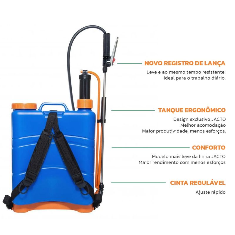 Alta performance para PulverizaçãoA linha JACTO XP é pulverizador costal manual mais leve da Jacto, o que possibilita alta performance com menos esforço e fadiga.Possui design ergonômico e material resistente, ideal tanto para pequenas como grandes propriedades rurais que necessitam de um equipamento profissional para pulverização.Diferenciais:Versões de 12, 16 e 20 litrosGatilho com travaCâmara de Plástico de alta resistênciaAplicações: Hortaliças, Pecuária, Cereais, Pomares, Banana, Cana de açúcar, Tabaco, Uvas, Café e mudasIndicações: Defensivos agrícolas homologadosDimensões: Reservatório 12 litrosPeso bruto: 4,4kgPeso liquido: 3,7kglança: 600mmm Mangueira: 1350mmPressão máxima 75psi (5.1 bar)Volume da câmara: 600ml