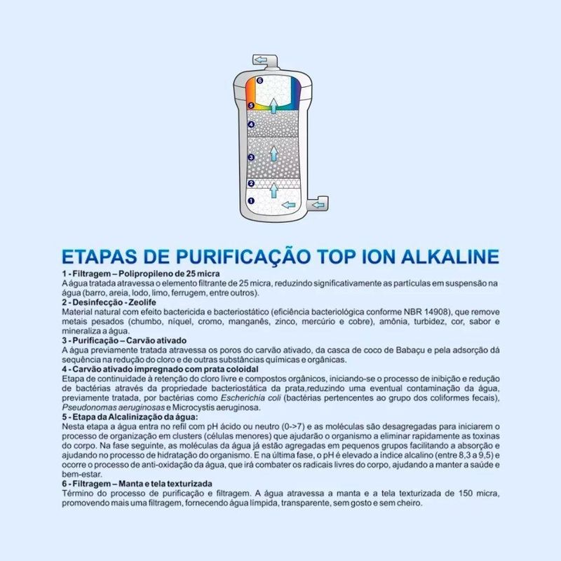 Purificador De água Alcalina Ionizada Com Ozônio Gelada Heoxi - Top Life Branco 110VVocê parou pra pensar na qualidade da água que toma?A água alcalina aumenta a hidratação do corpo; ajuda na eliminação de toxinas; favorece a digestão; auxilia na redução da hiperacidez gástrica; ajuda a combater a retenção de líquidos.Quando acionado o botão, o purificador libera a tecnologia do super Ozônio O³, considerado o bactericida mais poderoso do mundo. O ozonizador de água reduz drasticamente uma série de elementos causadores de doenças, como: impurezas, bactérias, vírus e fungos. É ideal para a purificação dos alimentos, por ser altamente eficiente e simples.Água ozonizada ou alcalina? Você escolhe!Características e benefícios Purificador Água Alcalina e com Ozônio Top Life:1. Redox Negativo: Água antioxidante evita formação de radicais livres, proporciona mais saúde às nossas células e age como rejuvenescedor celular2. Aumenta Condutividade: Todo comando enviado do cérebro para o corpo é transmitido por via aquosa e, quanto maior a condutividade do meio, mais rápido a informação chega ao destino3. Baixa Tensão Supercial: Pela ionização, transforma-se a molécula da água em ângulo hexagonal (unindo 6 moléculas de H2O). A água comum tem de 11 a 14 moléculas de H2O por Cluster e as moléculas ficam no ângulo hexagonal, com formação de apenas 6 moléculas por Cluster, bem mais leve e o corpo absorve mais rápidoElemento Filtrante1 - Filtragem – Polipropileno de 25 micra: A água atravessa o elemento filtrante de 25 micra, reduzindo as partículas em suspensão (barro, areia, lodo, ferrugem, etc)2 - Desinfecção - Zeolife: Material natural com efeito bactericida e bacteriostático, que remove metais pesados, amônia, turbidez, cor, sabor e preserva sais minerais3 - Purificação – Carvão ativado: A água atravessa os poros do carvão ativado, da casca de coco de Babaçu e dá sequência na redução do cloro e de outras substâncias químicas e orgânicas4 - Carvão ativado impregnado com prata coloidal: Continuidade à retenção do cloro livre e compostos orgânicos, iniciando a inibição e redução de bactérias pela propriedade bacteriostática da prata.5 - Alcalinização: A água entra com pH ácido ou neutro (6->7) e as moléculas são desagregadas para iniciarem o processo de organização em clusters, que ajudarão o organismo a eliminar as toxinas do corpo. Depois, as moléculas da água já estão agregadas em pequenos grupos facilitando a absorção e hidratação do organismo. Por fim, o pH é elevado (8,5 a 9,5) e ocorre o processo de anti-oxidação da água6 - Filtragem – Manta e tela texturizada: A água atravessa a manta e a tela texturizada de 150 micra, promovendo mais uma filtragem.Especificações TécnicasMedidas: A 39cm, L 30cm, C 42cm,Peso 12,5 kg,Gás refrigerante R134a (ecológico),Temperatura de trabalho 5C a 32C,Tensão 110V ou 220Vv (não é bivolt) 60Hz,Potência: 100W,Vazão Máxima 0,75 L/min, 45 L/H,Vida útil refil: 3000 litros ou 12 meses Produto estinado à água prétratada de acordo com a portaria 2914 MS.