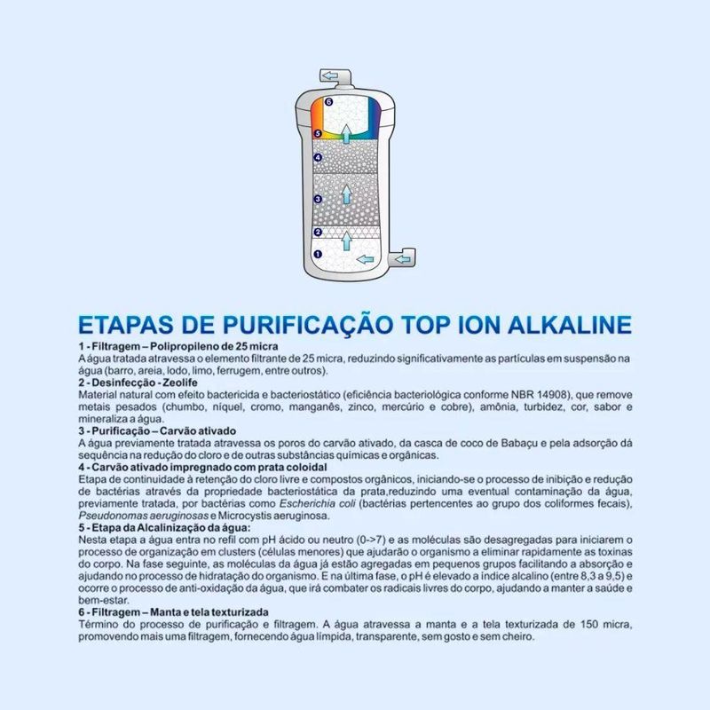 Purificador De água Natural Blue Oxi Branco 220v - Top Life Você já parou para pensar na qualidade da água que você bebe todos os dias? E você sabia que a maioria das águas minerais tem o pH mais ácido do que o seu sangue? Então está na hora de conhecer o FILTRO de ÁGUA ALCALINA! O purificador de água alcalina ionizada de alta performance Health Energy é responsável por deixar a água ALCALINA com pH entre e e IONIZADA quando a entrada tem pH 7 (neutro), além de deixá-la com baixo teor de cloro e flúor. Ele filtra, purifica, mata as bactérias, elimina os metais pesados, remove impurezas e materiais orgânicos e preserva os sais minerais. Quando acionado o botão, o purificador libera a tecnologia do super Ozônio. O gás ozônio O³ é considerado o bactericida mais poderoso do mundo. O ozonizador de água reduz drasticamente uma série de elementos causadores de doenças, como: impurezas, bactérias, vírus e fungos. É ideal para a purificação dos alimentos por ser altamente eficiente e simples. Recomenda-se usar o ozonizador na água com os alimentos em uma bacia. Desta maneira, as impurezas serão completamente eliminadas. Água ozonizada ou alcalina? Você escolhe. Os principais benefícios do consumo da água alcalina são:Prevenção do envelhecimento, pois a água é antioxidanteAumenta a hidratação do corpoAjuda na eliminação de toxinas.Melhora da capacidade cognitiva.Favorece a digestão.Melhora a disposição física.Auxilia na redução da hiperacidez gá a combater a retenção de líquidos.Auxilia na absorção de alimentos. Todos estes benefícios são garantidos porque os filtros de água alcalina da Top Life, a melhor marca de purificador de água alcalina do , possuem as seguintes características: 1- PH ALCALINO:Esse Purificador de água transforma a água comum da torneira em água alcalina com pH entre 8,5 e 9,5.Esta água está muito mais próxima da realidade da fisiologia corporal de todos nós, pois o PH sanguíneo de uma pessoa saudável está entre e , portanto ALCALINO.2- REDOX NEGATIVO:A água antioxidante protege o nosso organismo contra os radicais livres, pois uma água antioxidante doa elétrons para o organismo e desta forma evita a formação dos radicais dando mais saúde a todas as nossas células e não deixe a pele envelhecer rapidamente, agindo como rejuvenescimento .3- CONDUTIVIDADE:Aumentam a condutividade da água, pois, como todo comando enviado do cérebro para o corpo é transmitido por via aquosa, quanto maior a condutividade desse meio, mais rápido a informação chega ao destino final.4- BAIXA TENSÃO SUPERFICIAL:Através da ionização faz uma nova formação na molécula da água, deixando-a em ângulo hexagonal (unindo 6 moléculas de H2O) . Uma água comum tem em média de 11 a 14 moléculas de H2O por Cluster, já a água Ionizada fica com suas moléculas no ângulo hexagonal e com uma formação de apenas 6 moléculas por Cluster, que deixa a água muito mais leve e ajuda o corpo a absorvê-la mais rápido.5 - ANTIOXIDANTEQuando as células de nosso corpo usam o oxigênio, eles naturalmente produzem os radicais livres que podem causar alguns danos ao organismo. Os filtros de água alcalina e ionizada Top Life agem como caçadores destes radicais livres destruindo, inibindo, prevenindo e reparando os danos causados por estes radicais livres.