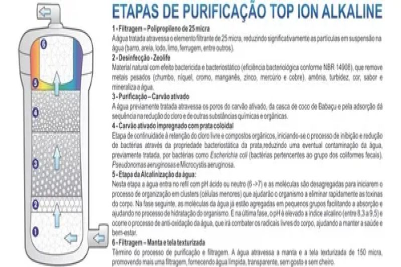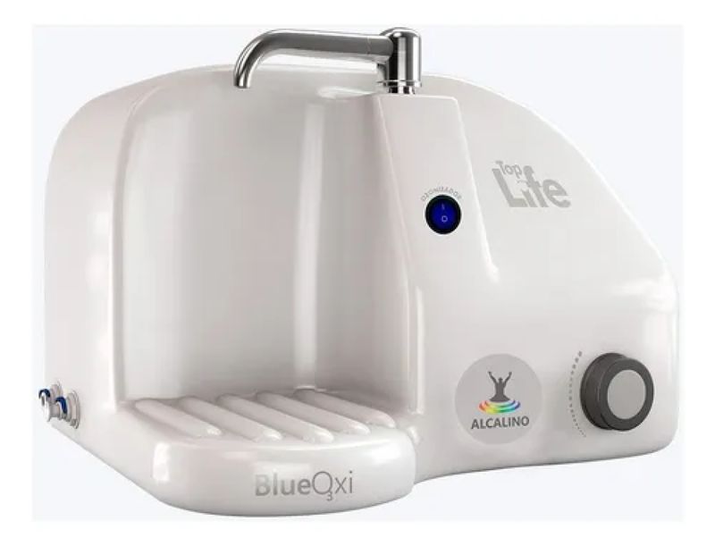 O Purificador de Água Top Life Blueoxi 2 em 1 é um aparelho de alta tecnologia que se destaca por oferecer água natural com duas características especiais em um único dispositivo: água alcalina e água ozonizada. Seu design compacto e na cor branca, voltado para uso doméstico, se integra facilmente em bancadas e cozinhas. A principal inovação do purificador reside em seu sistema de filtragem de oito etapas. A purificação começa com a retenção de partículas e cloro, seguida pela inibição de bactérias através do uso de carvão ativado com prata coloidal. Posteriormente, a água passa por um processo de alcalinização que eleva seu pH para um nível alcalino, variando de 8,5 a 9,5, o que a torna mais leve e com potencial antioxidante. Essa água alcalina ionizada é tida como benéfica para a saúde por ajudar a combater os radicais livres e facilitar a hidratação do organismo. A segunda tecnologia incorporada é a ozonização. O purificador libera ozônio na água para esterilizar e higienizar alimentos, como frutas e verduras, sem a necessidade de produtos químicos. A água ozonizada também pode ser utilizada para lavar utensílios e louças, contribuindo para uma higienização mais profunda. Além das funções de alcalinização e ozonização, o aparelho é eficaz na redução do cloro livre, na eficiência bacteriológica e na retenção de partículas, conforme certificação do Inmetro. Ele funciona em 127V, tem uma vazão máxima de 45 litros por hora e o refil tem uma vida útil de 3.000 litros. O baixo peso e as dimensões compactas tornam o purificador uma opção prática para diferentes espaços, fornecendo água de qualidade de maneira contínua e segura.