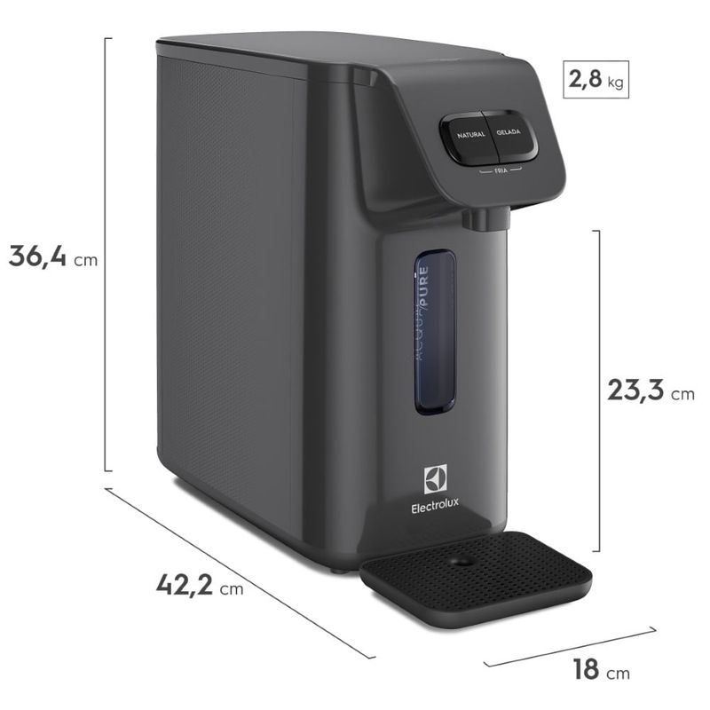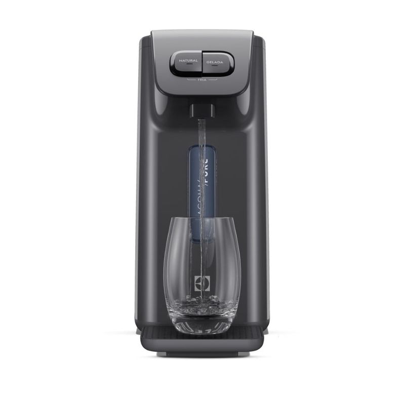 O Purificador de Água Electrolux Efficient (Gelada, Fria e Natural) Grafite é a combinação perfeita entre saúde e modernidade, e conta com um filtro que retém as impurezas, melhorando a qualidade da água. Com o purificador você tem certeza de que sua água estará sempre fresca e livre de impurezas. Ideal para beber ou cozinhar todos os dias, de forma ainda mais prática. A Tecnologia Acqua Pure garante alta eficiência na filtragem através de um filtro composto por carvão ativado com íons de prata e uma barreira de polipropileno que filtra as impurezas sólidas. Inibe o desenvolvimento de bactérias*, retém partículas de 5 a 15µm (partículas invisíveis a olho nu)** e reduz em até 75%** o excesso de cloro livre na água, além de reduzir odores e sabores. Evite o descarte de garrafas pet no meio ambiente com a economia até 2000 garrafas plásticas de 1,5L***. A troca de refil é fácil e simples. Quando necessário, uma luz se acenderá no painel. A recomendação é que a troca seja feita a cada 6 meses, utilizando um filtro original para garantir o desempenho do purificador. Uma das facilidades do Purificador de Água Electrolux Efficient é que você mesmo pode fazer sua limpeza e manutenção, sem a necessidade de acionar um técnico. Além disso, o purificador dispensa o uso de pilhas e possui design compacto e versátil, com a altura ideal para diversos recipientes, como copos, panelas e jarras. Ocupa menos espaço e pode ser instalado na parede.
