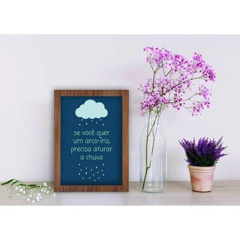 Quadro Decorativo Arco Íris com Frase Motivacional Retangular 20 X 30 em Canvas com Vidro MadeiraDecore e inspire seu ambiente com o quadro decorativo Center Molduras Arco Íris, ideal para levar motivação às paredes de casa ou do escritório. Com frase motivacional, ele ajuda a criar um clima de positividade, coragem e superação no dia a dia. A impressão em alta qualidade em canvas, protegida por vidro e moldura em madeira, valoriza as cores e a mensagem, deixando o visual mais elegante. O formato retangular 20 x 30 cm se adapta facilmente a diferentes espaços, seja em composição com outros quadros ou como peça única. A marca Center Molduras oferece um produto pensado para unir estética e inspiração em um só item decorativo.Vantagens e diferenciais Frase motivacional: mensagem que estimula coragem, resiliência e positividade diária. Impressão em canvas: alta qualidade de imagem para cores mais vivas e detalhadas. Moldura em madeira: acabamento que traz elegância e combina com diversos ambientes. Proteção em vidro: ajuda a preservar a arte e facilita a limpeza do quadro. Tamanho 20 x 30 cm: formato compacto que se encaixa em paredes pequenas ou composições. Uso versátil: ideal para escritório, sala de estar, quarto ou para presentear alguém especial.Especificações Técnicas Marca: Center Molduras Modelo: Arco íris - 20 X 30 Caixa (canvas) Vidro Com Vidro Cor Madeira Tipo de produto: Quadro decorativo Tema: Frases motivacionais Formato do quadro: Retangular Quantidade de peças: 1 Altura do produto: 30 cm Largura do produto: 20 cm Possui moldura: Sim Material da moldura: Madeira Material da arte: Impressão em alta qualidade em canvas Possui vidro: Sim Cor predominante da moldura: Amadeirado Conteúdo da embalagem: 1 quadro decorativo Garantia do fabricante: 3 mesesObservações importantes As cores do produto podem variar de acordo com a calibração e resolução do monitor ou tela utilizada. As imagens são meramente ilustrativas; o produto real pode apresentar pequenas variações de tonalidade, formato ou acabamento.