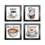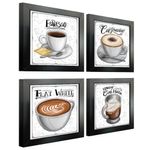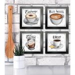Quadro Decorativo Café Expresso Padaria Cozinha 12x12cm 2 Título Moldura PretaQuadro Decorativo Café Expresso Padaria Cozinha 12x12cm 2MEDIDAS- 4 Peças 12x12 cm:MATERIAL- MDF 3mm de espessura:MOLDURA- 1cm de espessura e 2cm de largura, madeira maciça de reflorestamento, laqueada fosca como acabamento, 100% livre de imperfeições. Cantos com acabamento excelente:TIPO DE IMPRESSÃO-Impressão em alta resolução livre de imperfeições;FINALIZAÇÂO E ACABAMENTO- O quadro decorativo é finalizado com grampos e acompanha fita dupla face;OBSERVAÇÕES- Material liso, sem relevos;- Moldura sem vidro (Por que não vai com vidro? Como nossas imagens são impressas em material vinil brilho altamente durável, dispensa o uso do vidro. Fique tranquilo, sua imagem não corre o risco de desbotar);- Fabricação própria;- O produto pode ocorrer de ter uma leve diferença de tom na cor da que está na tela do seu computador ou celular.LIMPEZA APÓS FIXAÇÃO- A limpeza pode ser realizada apenas com um pano seco macio, se desejar pode ser úmido, porém sem conter álcool ou produtos químicos.Os quadros decorativos são muito utilizados por arquitetos e amantes da decoração. Quadros do mesmo tom, que possuam correlação e que "ornem" entre si podem ser utilizados juntos para dar uma personalização maior a um determinado ambiente. Composições podem ser utilizadas em salas, cozinhas, varandas, quartos ou qualquer ambiente que você queira deixar com a sua cara.Sendo assim aArte na Arte criou pra você uma enorme variedade em Quadros Decorativos de cores e desenhos que seguem as últimas tendências de decoração.Transforme seu ambiente, decore sua sala, quarto, cozinha, escritório ou presenteie alguém especial com o Quadro DecorativoArte na Arte.Esperamos que se sinta à vontade e encontre aqui o SEU estilo, e ao olhar pra o seu ambiente, seja ele qual for - possa dizer: "Agora meu ambiente está completo!"Tire todas suas dúvidas conosco, estamos sempre à disposição.Imagem ambiente fornecido por Freepik.