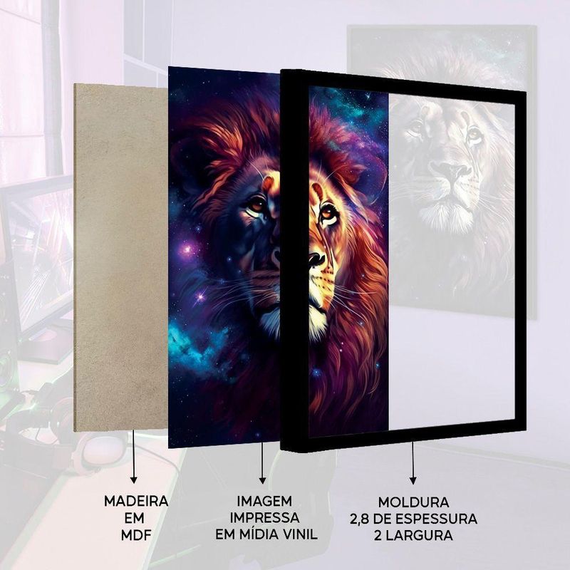 Quadro Leão Judá Estrelas Universo Moldura Cx Alta 40x60 Titulo Moldura PretaQuadro Decorativo Leão Judá Estrelas Universo Cx Alta 40x60MEDIDAS- 40x60 cm.MATERIAL- MDF 3mm de espessura.MOLDURA- Caixa Alta de 2,8cm de espessura e 2cm de largura;- Madeira maciça de reflorestamento;- Revestida com alta qualidade;- 100% livre de imperfeições;- Cantos com acabamento excelente;TIPO DE IMPRESSÃO- Impressão em alta resolução em vinil livre de imperfeições.FINALIZAÇÂO E ACABAMENTO- O quadro decorativo é finalizado com grampos.OBSERVAÇÕES- Material de alta qualidade;- Moldura sem vidro (Por que não vai com vidro? Como nossas imagens são impressas em material vinil altamente durável, dispensa o uso do vidro. Fique tranquilo, sua imagem não corre o risco de desbotar);- Fabricação própria;- O produto pode ocorrer de ter uma leve diferença de tom na cor da que está na tela do seu computador ou celular.LIMPEZA APÓS FIXAÇÃO- A limpeza pode ser realizada apenas com um pano seco macio, se desejar pode ser úmido, porém sem conter álcool ou produtos químicos.Os quadros decorativos são muito utilizados por arquitetos e amantes da decoração. Quadros do mesmo tom, que possuam correlação e que ornem entre si podem ser utilizados juntos para dar uma personalização maior a um determinado ambiente. Composições podem ser utilizadas em salas, cozinhas, varandas, quartos ou qualquer ambiente que você queira deixar com a sua cara.Sendo assim a Arte na Arte criou pra você uma enorme variedade em Quadros Decorativos de cores e desenhos que seguem as últimas tendências de decoração.Transforme seu ambiente, decore sua sala, quarto, cozinha, escritório ou presenteie alguém especial com o Quadro Decorativo Arte na Arte.Esperamos que se sinta à vontade e encontre aqui o SEU estilo, e ao olhar pra o seu ambiente, seja ele qual for - possa dizer: Agora meu ambiente está completo!Tire todas suas dúvidas conosco, estamos sempre à disposição.Imagens meramente ilustrativas que não refletem no tamanho real do produto!Imagem ambiente fornecido por Freepik.