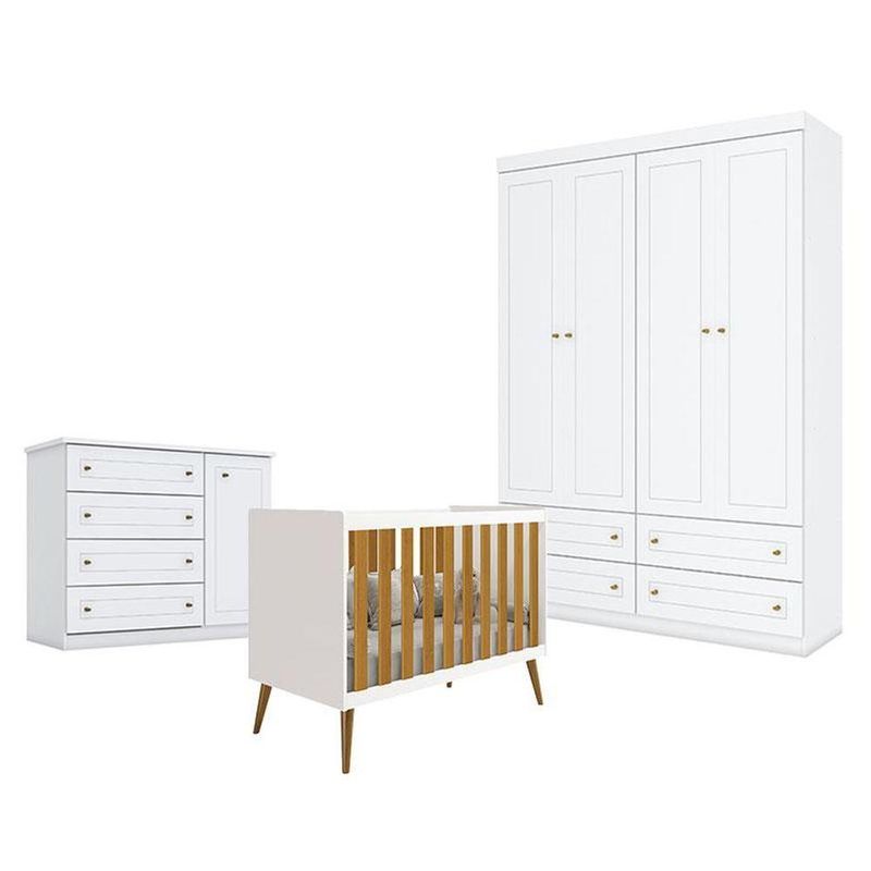 Quarto De Bebê Americano 4 Portas Com Berço Americano Isis Branco Acetinado Savana - Reller - HennQuarto de Bebê Americano 4 Portas com Berço Americano Isis Branco Acetinado Savana - Reller - HennQuarto de bebê composto por Berço Americano Isis Branco Acetinado Savana Reller, Guarda-Roupa Americano 4 Portas Henn e Cômoda Infantil Americano. O berço conta com estrutura firme e acabamento branco acetinado com detalhe Savana, garantindo conforto e segurança para o bebê. O guarda-roupa oferece bom espaço interno para organização do enxoval, enquanto a cômoda complementa o ambiente com praticidade para roupas e acessórios. Ideal para montar um quarto de bebê funcional, elegante e aconchegante.Berço Americano Isis Branco Acetinado Savana - RellerCaracterísticas Técnicas- Material da estrutura em MDF- Acabamento em pintura U.V acetinado- Cantos arredondados- Pés em madeira maciça- Acompanha suporte para mosquiteiro- Possui 3 níveis de altura no estrado- Indicado colchão 70/130 cm ( vendido separadamente)- Certificado pelo Inmetro- Grade fixa- Transforma-se em mini cama- Design modernoDimensõesAltura: 94 cmLargura: 133 cmProfundidade: 77 cmGuarda Roupa Infantil Americano 4 Portas Branco HP – HennCaracterísticas Técnicas:- Desenvolvido em MDP/ MDF- Frentes em MDF- Acabamento em U.V Fosco- 4 Portas- 4 Gavetas com corrediças telescópicas- Portas e gavetas com usinagem em baixo relevo- Puxadores em ABS na cor bronze- Cabideiro em alumínio- Lindo designDimensões:Altura: 218 cmLargura: 155 cmProfundidade: 49 cmCômoda Infantil Americano Branco HP – HennCaracterísticas Técnicas:- Desenvolvido em MDP/ MDF- Frentes em MDF com usinagem em baixo relevo- Pintura na cor Branco HP- Acabamento em U.V Fosco- 1 Porta- 4 Gavetas com corrediças telescópicas- Prateleiras internas- Puxadores na cor bronze- Lindo designDimensões:Altura: 101 cmLargura: 126 cmProfundidade: 51 cmInformações importantes:- Não acompanha decorações e acessórios- Nossas cargas possuem seguro, portanto, no ato da entrega, confira a quantidade de volumes recebida, e também o estado da embalagem. Se houver qualquer inconsistência, não assine o comprovante de entrega;- O armazenamento do produto no endereço de entrega é de responsabilidade do comprador. Evite apoiar o produto na vertical, bem como evite áreas que deixem o produto exposto a chuva ou umidade excessiva;- Pequenas variações de tonalidade são possíveis, em razão da diferença de resolução da tela onde o anúncio está sendo visualizado. Se notar diferença expressiva, comunicar a empresa antes de efetuar a montagem;- O serviço de entrega contratado contempla a entrega até a primeira área coberta ou portaria, não sendo coberto o ato de subir escadas/elevadores ou adentrar nas residências;- Não nos responsabilizamos pela montagem, desmontagem ou instalação do produto.