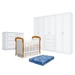 Quarto De Bebê Americano 6 Portas Com Berço Danny Branco Acetinado Savana Reller E Colchão Ortobom - Henn.Quarto de Bebê Americano 6 Portas com Berço Danny Branco Acetinado Savana Reller com com Colchão Ortobom - HennQuarto de bebê composto por Berço Danny Branco Acetinado Savana Reller, Guarda-Roupa Americano 6 Portas Henn e Cômoda Infantil Americano. O berço possui estrutura resistente e acabamento branco acetinado com detalhe Savana, garantindo conforto e segurança para o bebê. O guarda-roupa de 6 portas oferece excelente espaço interno para organização do enxoval, enquanto a cômoda complementa o conjunto com praticidade para armazenar roupas e acessórios. Ideal para montar um quarto de bebê funcional, elegante e bem organizado. Acompanha com Colchão Ortobom.Berço Americano Danny Branco Acetinado Savana – RellerCaracterísticas:-Certificado pelo INMETRO-Transforma-se em sofazinho-Padrão Americano-Cantos arredondados-03 regulagens de altura do estrado-Estrado de madeira reflorestada-Grade Fixa-04 Rodízios, sendo 02 Rodízios com trava-Acompanha suporte para mosquiteiro-Colchão Recomendado:130cm x70cm x 12cm(vendido separadamente);-Acabamento UVDimensões:Altura: 120 cmLargura: 148 cmProfundidade: 78 cmColchão para Berço Americano Phisical 70x130 – OrtobomCaracterísticas técnicas- Tecido plano 100% poliéster- Placa de espuma em 100% poliuretano desempenho do INMETRO aprovada- Revestimento inferior em plástico impermeável- Proteção 100% espuma e tecido contra formação e colonização de ácaros, bactéria e fungos trazendo mais segurança e auxiliando na saúde do bebê- Padrão americano- Produto de origem nacional- Lindo design- Carinho e conforto que o seu bebê mereceDimensõesAltura: 10 cmLargura: 70 cmProfundidade: 130 cmGuarda Roupa Casal Americano 6 Portas Branco HP – HennCaracterísticas Técnicas:- Desenvolvido em MDF/MDP- Frentes em MDF com usinagem baixo relevo e P.U- Pintura na cor Branco HP- Acabamento em U.V Fosco- 6 Portas- 4 Gavetas com corrediças telescópicas- Puxadores bronze- Cabideiros em alumínio- Lindo designDimensões:Altura: 230 cmLargura: 262 cmProfundidade: 54 cmCômoda Infantil Americano Branco HP – HennCaracterísticas Técnicas:- Desenvolvido em MDP/ MDF- Frentes em MDF com usinagem em baixo relevo- Pintura na cor Branco HP- Acabamento em U.V Fosco- 1 Porta- 4 Gavetas com corrediças telescópicas- Prateleiras internas- Puxadores na cor bronze- Lindo designDimensões:Altura: 101 cmLargura: 126 cmProfundidade: 51 cmInformações importantes:- Não acompanha decorações e acessórios- Nossas cargas possuem seguro, portanto, no ato da entrega, confira a quantidade de volumes recebida, e também o estado da embalagem. Se houver qualquer inconsistência, não assine o comprovante de entrega;- O armazenamento do produto no endereço de entrega é de responsabilidade do comprador. Evite apoiar o produto na vertical, bem como evite áreas que deixem o produto exposto a chuva ou umidade excessiva;- Pequenas variações de tonalidade são possíveis, em razão da diferença de resolução da tela onde o anúncio está sendo visualizado. Se notar diferença expressiva, comunicar a empresa antes de efetuar a montagem;- O serviço de entrega contratado contempla a entrega até a primeira área coberta ou portaria, não sendo coberto o ato de subir escadas/elevadores ou adentrar nas residências;- Não nos responsabilizamos pela montagem, desmontagem ou instalação do produto.