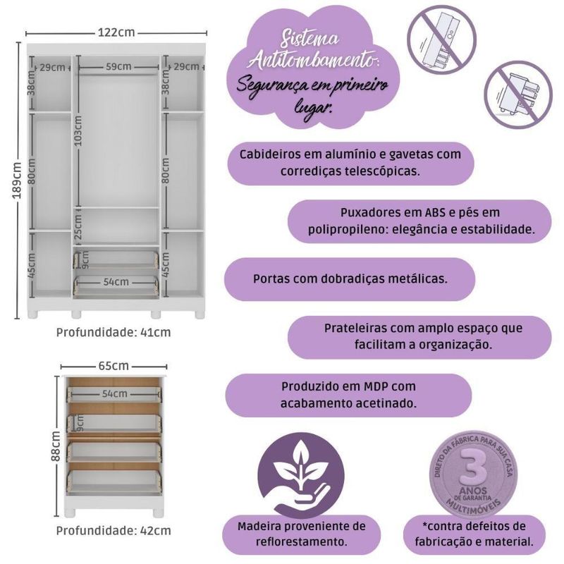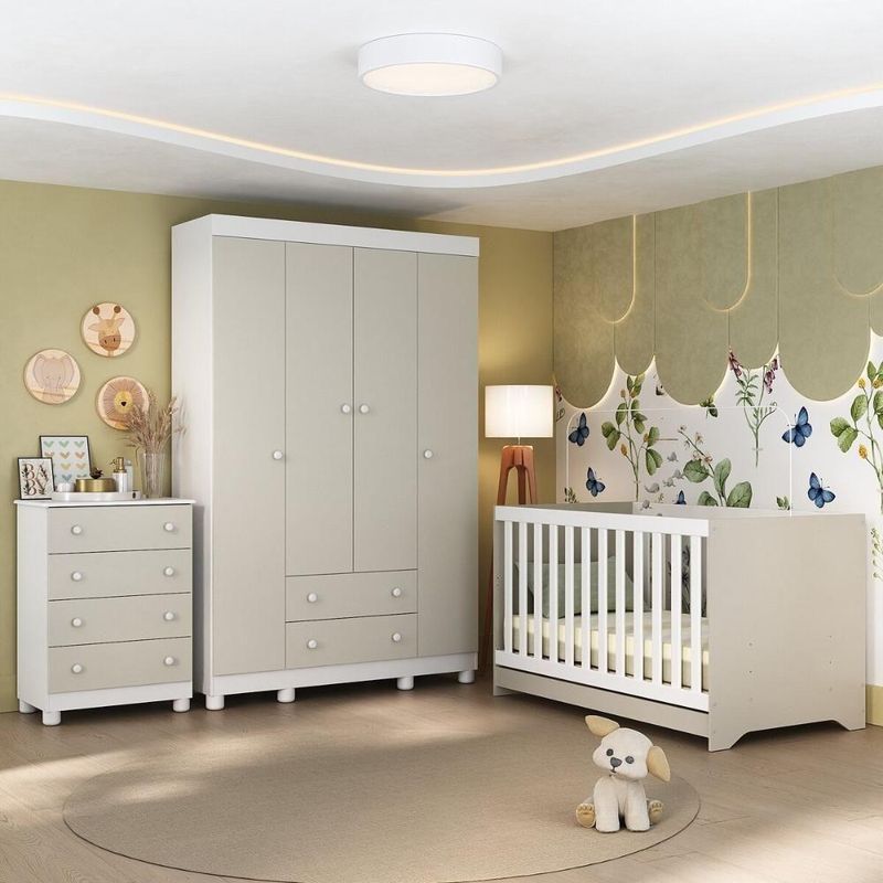 Quarto De Bebê Completo Berço Americano 3 Em 1 Colchão Allegra Multimóveis MP4602 Branco/off WhiteO quarto do seu bebê é o cenário dos sonhos que estão prestes a começar. Com o Quarto de Bebê Completo com Berço Americano 3 em 1 Colchão Incluso Multimóveis MP4602, você cria um ambiente repleto de doçura, praticidade e amor — perfeito para acompanhar cada nova descoberta do seu pequeno.Diferenciais:- 3 anos de garantia contra defeitos de fabricação e material (exceto colchão).- Conjunto produzido em madeira de reflorestamento (MDP 12/15mm) com acabamento acetinado (cerca de 20% de brilho): sustentabilidade e durabilidade.- Berço 3 em 1 que se transforma em sofá e minicama, acompanhando o crescimento do bebê.- Lastro em madeira com 3 regulagens de altura e suporte para mosquiteiro para noites mais tranquilas e protegidas.- Berço certificado pelo INMETRO (Selo nº 0000085/2018).- Padrão americano (tamanho do colchão: 130x70cm).- Colchão D18 incluso: possui tratamento antiácaro, antialérgico, antimofo e um dos lados impermeável.- Grade Soft (PVC): ecologicamente correta, com matéria-prima livre de metais pesados, atóxica e com proteção antiamarelamento.- Guarda-roupa com 4 portas e 2 gavetas: amplo espaço para organizar roupinhas e acessórios.- Cômoda com 4 gavetas.- Corrediças telescópicas: abertura total e silenciosa das gavetas.- Cabideiro em alumínio: permite acomodar roupas longas e curtas para que não amassem.- Puxadores em ABS delicados e práticos.- Pés em polipropileno e rodapés: visual elegante e estabilidade para o guarda-roupa e a cômoda.- Sistema antitombamento no guarda-roupa e cômoda: proporciona segurança para o bebê e tranquilidade aos pais.Conteúdo da Embalagem:1 (um) Berço1 (um) Colchão1 (um) Guarda-roupa1 (uma) CômodaManual de MontagemKit FerragemDimensões do Produto Montado:Berço - Altura: 80,5cm | Largura: 133cm | Profundidade: 77,5cmColchão - Altura: 10cm | Largura: 130cm | Profundidade: 70cmGuarda-roupa - Altura: 189cm | Largura: 122cm | Profundidade: 41cmCômoda - Altura: 88cm | Largura: 65cm | Profundidade: 42cm*Você pode consultar as medidas detalhadas na imagem técnica do produto.Observações Importantes:*As cores dos produtos podem sofrer variações de tonalidade de acordo com as configurações do seu dispositivo.*Aqui na Loja Multimóveis, você pode concluir sua compra facilmente com toda segurança. A entrega é garantida e você está em 1° lugar.*Imagens meramente ilustrativas (decoração não inclusa).*Os produtos serão entregues desmontados e não disponibilizamos o serviço de montagem. Acabamento: Finish Foil/Pintura UV | Tonalidade: Branco | Material: MDP | Referência do Modelo: MP4602 | Coleção: Allegra | Sistema de Montagem: O produto acompanha manual de montagem juntamente com kit ferragem. O produto será entregue desmontado e não disponibilizamos o serviço de montagem. | Instruções de Cuidado: Limpar com pano seco para retirar o pó. Não utilizar produtos químicos ou abrasivos. Não aplicar lustra móveis. | Produto Composto por: 1 berço, 1 colchão, 1 guarda-roupa, 1 cômoda, manual de montagem e kit ferragem. | Altura Montado: 189 | Largura Montado: 122 | Profundidade Montado: 41 | Tamanho (L x A x P): 122 x 189 x 41 | Peso do Produto: 118 | Corrediça: Telescópica | Inclui Berço: Sim | Acompanha Colchão: Sim | Inclui Guarda-Roupa: Sim | Inclui Gaveteiro: Sim | Material do Puxador: ABS | Quantidade de Portas: 4 | Quantidade de Gavetas: 6 | Quantidade de Puxadores: 16 | RBN: 17352335011 | Quantidade de Pés: 12 | Quantidade de Peças: 4 | Material dos Pés: Polipropileno | Produto: Conjunto de Quarto | Portátil: Não | Registro INMETRO: 0000085/2018 | Fabricante: Multimóveis | Regulamentado pelo INMETRO: Sim | Garantia do Fabricante: 3 | Requer Montagem: Sim | Tempo de Garantia: 3 meses | Descrição do Tamanho: (L x A x P): 122 x 189 x 41 cm | Tipo de cama: Berço | Marca: Multimóveis | Tamanho da cama: Berço | Quantidade de criados mudos: 0 | Tipo de madeira: N/A | Comprimento da cama: 77,5 cm | Altura da cama: 80,5 cm | É Kit de fábrica: Sim | Estilo: Moderno | Largura da cama: 133 cm | Idade recomendada: 0-24 meses | Idade: Bebê | Quantidade de caixas de embalagem: 07 | Destaque 1: Produzido em MDP com acabamento acetinado: durabilidade e resistência. | Destaque 2: Berço 3 em 1: transforma-se em sofá e minicama, acompanhando as fases da criança. | Destaque 3: Guarda-roupa com 4 portas, 2 gavetas e cabideiro de alumínio. | Destaque 4: Cômoda com 4 gavetas: amplo espaço interno. | Destaque 5: Corrediças telescópicas: abertura total e silenciosa das gavetas. | Baterias são necessárias?: Não | Certificação de teste externa: 0000085/2018 | Is Fragile: Não | Dimensões do item P x L x A: length#value=41;length#unit=centimeters;width#value=122;width#unit=centimeters;height#value=189;height#unit=centimeters | Quantidade de itens: 1 | Peso do item: unit=kilograms;value=118 | Número da peça: MP4602.697 | Inclui manual de montagem: Sim | Tipo de Garantia: Garantia do Fabricante | Montagem: Necessita Montagem | País de Origem: Brasil | Palavras-chave: berco com colchao, berco pequeno bercos moveis, berco que vira cama, berco mini cama, berco, quarto completo de bebe, berco e guarda roupa, kit quarto bebe, quarto de bebe completo, quarto de bebe, quarto bebe, jogo de quarto bebe, quarto completo bebe, kit quarto bebe moveis, quarto infantil bebe, kit quarto de bebe, berço e guarda roupa | Inclui cômoda trocador: Não | Cor: Branco/Off White