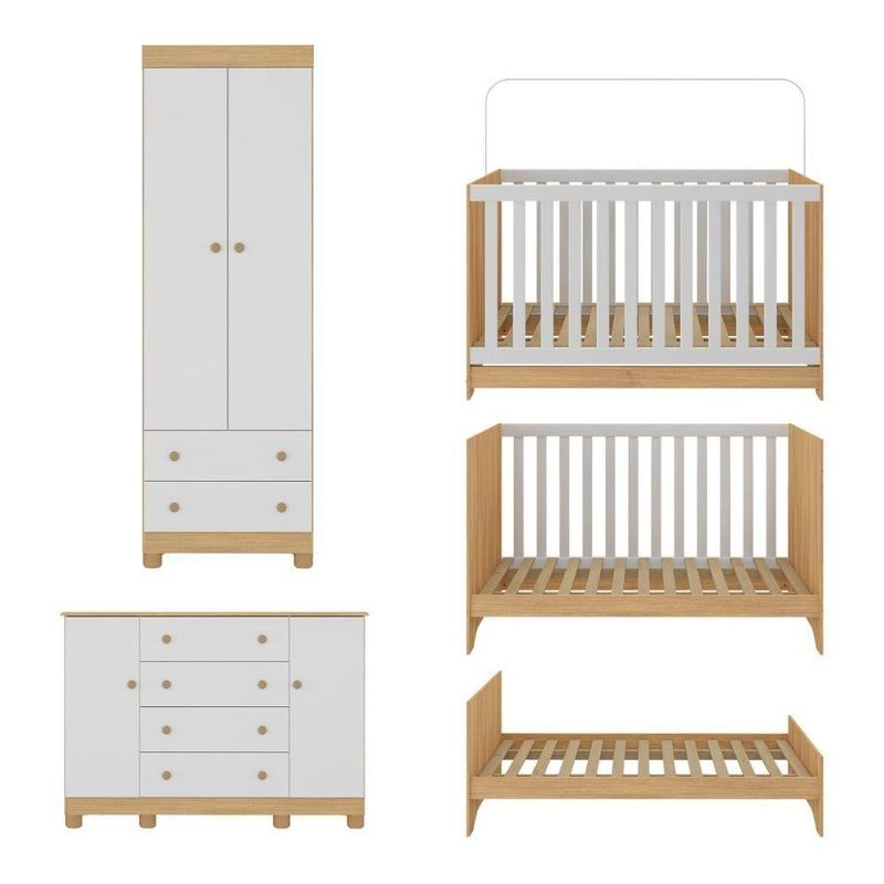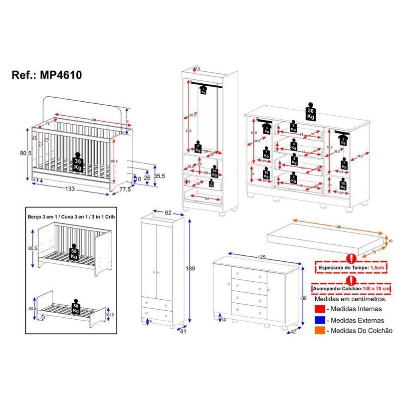 Quarto De Bebê Completo Berço Americano 3 Em 1 Colchão Allegra Multimóveis MP4610 Madeirado/brancoO Quarto de Bebê Completo com Berço Americano 3 em 1 Colchão Incluso Multimóveis MP4610 une design moderno, praticidade e um toque de afeto para tornar o cantinho do seu bebê simplesmente encantador. Cada móvel reflete cuidado e proteção, criando o espaço perfeito para o amor crescer todos os dias.Diferenciais:- 3 anos de garantia contra defeitos de fabricação e material (exceto colchão).- Conjunto produzido em madeira de reflorestamento (MDP 12/15mm) com acabamento acetinado (cerca de 20% de brilho): sustentabilidade e durabilidade.- Berço 3 em 1 que se transforma em sofá e minicama, acompanhando o crescimento do bebê.- Lastro em madeira com 3 regulagens de altura e suporte para mosquiteiro para noites mais tranquilas e protegidas.- Berço certificado pelo INMETRO (Selo nº 0000085/2018).- Padrão americano (tamanho do colchão: 130x70cm).- Colchão D18 incluso: possui tratamento antiácaro, antialérgico, antimofo e um dos lados impermeável.- Grade Soft (PVC): ecologicamente correta, com matéria-prima livre de metais pesados, atóxica e com proteção antiamarelamento.- Guarda-roupa com 2 portas e 2 gavetas: amplo espaço para organizar roupinhas e acessórios.- Cômoda com 2 portas e 4 gavetas.- Corrediças telescópicas: abertura total e silenciosa das gavetas.- Cabideiro em alumínio: permite acomodar roupas longas e curtas para que não amassem.- Puxadores em ABS delicados e práticos.- Pés em polipropileno e rodapés: visual elegante e estabilidade para o guarda-roupa e a cômoda.- Sistema antitombamento no guarda-roupa e cômoda: proporciona segurança para o bebê e tranquilidade aos pais.Conteúdo da Embalagem:1 (um) Berço1 (um) Colchão1 (um) Guarda-roupa1 (uma) CômodaManual de MontagemKit FerragemDimensões do Produto Montado:Berço - Altura: 80,5cm | Largura: 133cm | Profundidade: 77,5cmColchão - Altura: 10cm | Largura: 130cm | Profundidade: 70cmGuarda-roupa - Altura: 189cm | Largura: 62cm | Profundidade: 41cmCômoda - Altura: 88cm | Largura: 125cm | Profundidade: 42cm*Você pode consultar as medidas detalhadas na imagem técnica do produto.Observações Importantes:*As cores dos produtos podem sofrer variações de tonalidade de acordo com as configurações do seu dispositivo.*Aqui na Loja Multimóveis, você pode concluir sua compra facilmente com toda segurança. A entrega é garantida e você está em 1° lugar.*Imagens meramente ilustrativas (decoração não inclusa).*Os produtos serão entregues desmontados e não disponibilizamos o serviço de montagem. Acabamento: Finish Foil/Pintura UV | Tonalidade: Branco | Material: MDP | Referência do Modelo: MP4610 | Coleção: Allegra | Sistema de Montagem: O produto acompanha manual de montagem juntamente com kit ferragem. O produto será entregue desmontado e não disponibilizamos o serviço de montagem. | Instruções de Cuidado: Limpar com pano seco para retirar o pó. Não utilizar produtos químicos ou abrasivos. Não aplicar lustra móveis. | Produto Composto por: 1 berço, 1 colchão, 1 guarda-roupa, 1 cômoda, manual de montagem e kit ferragem. | Altura Montado: 189 | Largura Montado: 62 | Profundidade Montado: 41 | Tamanho (L x A x P): 62 x 189 x 41 | Peso do Produto: 103 | Corrediça: Telescópica | Inclui Berço: Sim | Acompanha Colchão: Sim | Inclui Guarda-Roupa: Sim | Inclui Gaveteiro: Sim | Material do Puxador: ABS | Quantidade de Portas: 4 | Quantidade de Gavetas: 6 | Quantidade de Puxadores: 16 | RBN: 17352335011 | Quantidade de Pés: 10 | Quantidade de Peças: 4 | Material dos Pés: Polipropileno | Produto: Conjunto de Quarto | Portátil: Não | Registro INMETRO: 0000085/2018 | Fabricante: Multimóveis | Regulamentado pelo INMETRO: Sim | Garantia do Fabricante: 3 | Requer Montagem: Sim | Tempo de Garantia: 3 meses | Descrição do Tamanho: (L x A x P): 62 x 189 x 41 cm | Tipo de cama: Berço | Marca: Multimóveis | Tamanho da cama: Berço | Quantidade de criados mudos: 0 | Tipo de madeira: N/A | Comprimento da cama: 77,5 cm | Altura da cama: 80,5 cm | É Kit de fábrica: Sim | Estilo: Moderno | Largura da cama: 133 cm | Idade recomendada: 0-24 meses | Idade: Bebê | Quantidade de caixas de embalagem: 06 | Destaque 1: Produzido em MDP com acabamento acetinado: durabilidade e resistência. | Destaque 2: Berço 3 em 1: transforma-se em sofá e minicama, acompanhando as fases da criança. | Destaque 3: Guarda-roupa com 2 portas, 2 gavetas e cabideiro de alumínio. | Destaque 4: Cômoda com 2 portas e 4 gavetas: amplo espaço interno. | Destaque 5: Corrediças telescópicas: abertura total e silenciosa das gavetas. | Baterias são necessárias?: Não | Certificação de teste externa: 0000085/2018 | Is Fragile: Não | Dimensões do item P x L x A: length#value=41;length#unit=centimeters;width#value=62;width#unit=centimeters;height#value=189;height#unit=centimeters | Quantidade de itens: 1 | Peso do item: unit=kilograms;value=103 | Número da peça: MP4610.697 | Inclui manual de montagem: Sim | Tipo de Garantia: Garantia do Fabricante | Montagem: Necessita Montagem | País de Origem: Brasil | Palavras-chave: berco com colchao, berco pequeno bercos moveis, berco que vira cama, berco mini cama, berco, quarto completo de bebe, berco e guarda roupa, kit quarto bebe, quarto de bebe completo, quarto de bebe, quarto bebe, jogo de quarto bebe, quarto completo bebe, kit quarto bebe moveis, quarto infantil bebe, kit quarto de bebe, berço e guarda roupa | Inclui cômoda trocador: Não | Cor: Madeirado/Branco