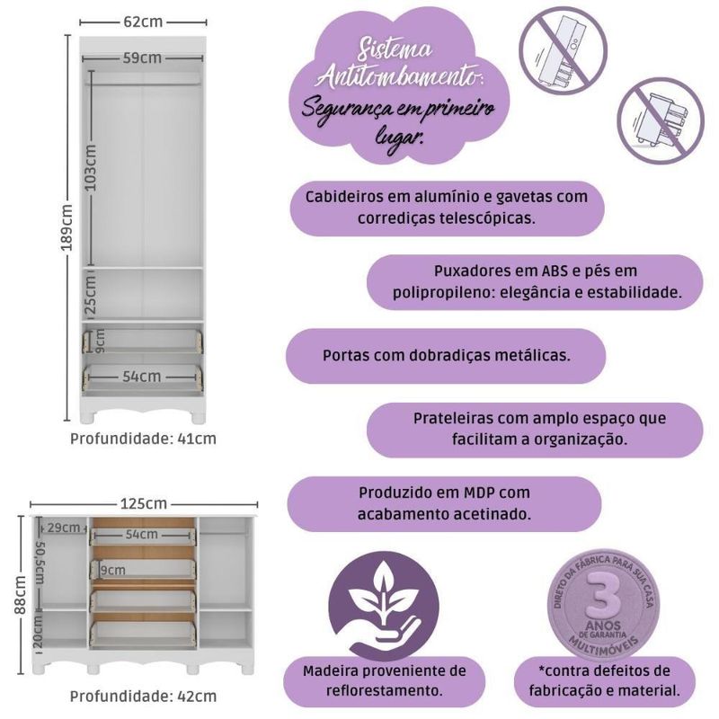 Quarto De Bebê Completo Berço Americano 3 Em 1 Colchão Dengo Multimóveis MP4612 Branco/madeiradoO Quarto de Bebê Completo com Berço Americano 3 em 1 Colchão Incluso Multimóveis MP4612 une design moderno, praticidade e um toque de afeto para tornar o cantinho do seu bebê simplesmente encantador. Cada móvel reflete cuidado e proteção, criando o espaço perfeito para o amor crescer todos os dias.Diferenciais:- 3 anos de garantia contra defeitos de fabricação e material (exceto colchão).- Conjunto produzido em madeira de reflorestamento (MDP 12/15mm) com acabamento acetinado (cerca de 20% de brilho): sustentabilidade e durabilidade.- Berço 3 em 1 que se transforma em sofá e minicama, acompanhando o crescimento do bebê.- Lastro em madeira com 3 regulagens de altura e suporte para mosquiteiro para noites mais tranquilas e protegidas.- Berço certificado pelo INMETRO (Selo nº 0000085/2018).- Padrão americano (tamanho do colchão: 130x70cm).- Colchão D18 incluso: possui tratamento antiácaro, antialérgico, antimofo e um dos lados impermeável.- Grade Soft (PVC): ecologicamente correta, com matéria-prima livre de metais pesados, atóxica e com proteção antiamarelamento.- Guarda-roupa com 2 portas e 2 gavetas: amplo espaço para organizar roupinhas e acessórios.- Cômoda com 2 portas e 4 gavetas.- Corrediças telescópicas: abertura total e silenciosa das gavetas.- Cabideiro em alumínio: permite acomodar roupas longas e curtas para que não amassem.- Puxadores em ABS delicados e práticos.- Pés em polipropileno e rodapés usinados em MDF: visual elegante e estabilidade para o guarda-roupa e a cômoda.- Sistema antitombamento no guarda-roupa e cômoda: proporciona segurança para o bebê e tranquilidade aos pais.Conteúdo da Embalagem:1 (um) Berço1 (um) Colchão1 (um) Guarda-roupa1 (uma) CômodaManual de MontagemKit FerragemDimensões do Produto Montado:Berço - Altura: 80,5cm | Largura: 133cm | Profundidade: 77,5cmColchão - Altura: 10cm | Largura: 130cm | Profundidade: 70cmGuarda-roupa - Altura: 189cm | Largura: 62cm | Profundidade: 41cmCômoda - Altura: 88cm | Largura: 125cm | Profundidade: 42cm*Você pode consultar as medidas detalhadas na imagem técnica do produto.Observações Importantes:*As cores dos produtos podem sofrer variações de tonalidade de acordo com as configurações do seu dispositivo.*Aqui na Loja Multimóveis, você pode concluir sua compra facilmente com toda segurança. A entrega é garantida e você está em 1° lugar.*Imagens meramente ilustrativas (decoração não inclusa).*Os produtos serão entregues desmontados e não disponibilizamos o serviço de montagem. Acabamento: Finish Foil/Pintura UV | Tonalidade: Branco | Material: MDP | Referência do Modelo: MP4612 | Coleção: Dengo | Sistema de Montagem: O produto acompanha manual de montagem juntamente com kit ferragem. O produto será entregue desmontado e não disponibilizamos o serviço de montagem. | Instruções de Cuidado: Limpar com pano seco para retirar o pó. Não utilizar produtos químicos ou abrasivos. Não aplicar lustra móveis. | Produto Composto por: 1 berço, 1 colchão, 1 guarda-roupa, 1 cômoda, manual de montagem e kit ferragem. | Altura Montado: 189 | Largura Montado: 62 | Profundidade Montado: 41 | Tamanho (L x A x P): 62 x 189 x 41 | Peso do Produto: 103 | Corrediça: Telescópica | Inclui Berço: Sim | Acompanha Colchão: Sim | Inclui Guarda-Roupa: Sim | Inclui Gaveteiro: Sim | Material do Puxador: ABS | Quantidade de Portas: 4 | Quantidade de Gavetas: 6 | Quantidade de Puxadores: 16 | RBN: 17352335011 | Quantidade de Pés: 10 | Quantidade de Peças: 4 | Material dos Pés: Polipropileno | Produto: Conjunto de Quarto | Portátil: Não | Registro INMETRO: 0000085/2018 | Fabricante: Multimóveis | Regulamentado pelo INMETRO: Sim | Garantia do Fabricante: 3 | Requer Montagem: Sim | Tempo de Garantia: 3 meses | Descrição do Tamanho: (L x A x P): 62 x 189 x 41 cm | Tipo de cama: Berço | Marca: Multimóveis | Tamanho da cama: Berço | Quantidade de criados mudos: 0 | Tipo de madeira: N/A | Comprimento da cama: 77,5 cm | Altura da cama: 80,5 cm | É Kit de fábrica: Sim | Estilo: Moderno | Largura da cama: 133 cm | Idade recomendada: 0-24 meses | Idade: Bebê | Quantidade de caixas de embalagem: 06 | Destaque 1: Produzido em MDP com acabamento acetinado: durabilidade e resistência. | Destaque 2: Berço 3 em 1: transforma-se em sofá e minicama, acompanhando as fases da criança. | Destaque 3: Guarda-roupa com 2 portas, 2 gavetas e cabideiro de alumínio. | Destaque 4: Cômoda com 2 portas e 4 gavetas: amplo espaço interno. | Destaque 5: Corrediças telescópicas: abertura total e silenciosa das gavetas. | Baterias são necessárias?: Não | Certificação de teste externa: 0000085/2018 | Is Fragile: Não | Dimensões do item P x L x A: length#value=41;length#unit=centimeters;width#value=62;width#unit=centimeters;height#value=189;height#unit=centimeters | Quantidade de itens: 1 | Peso do item: unit=kilograms;value=103 | Número da peça: MP4612.697 | Inclui manual de montagem: Sim | Tipo de Garantia: Garantia do Fabricante | Montagem: Necessita Montagem | País de Origem: Brasil | Palavras-chave: berco com colchao, berco pequeno bercos moveis, berco que vira cama, berco mini cama, berco, quarto completo de bebe, berco e guarda roupa, kit quarto bebe, quarto de bebe completo, quarto de bebe, quarto bebe, jogo de quarto bebe, quarto completo bebe, kit quarto bebe moveis, quarto infantil bebe, kit quarto de bebe, berço e guarda roupa | Inclui cômoda trocador: Não | Cor: Branco/Madeirado