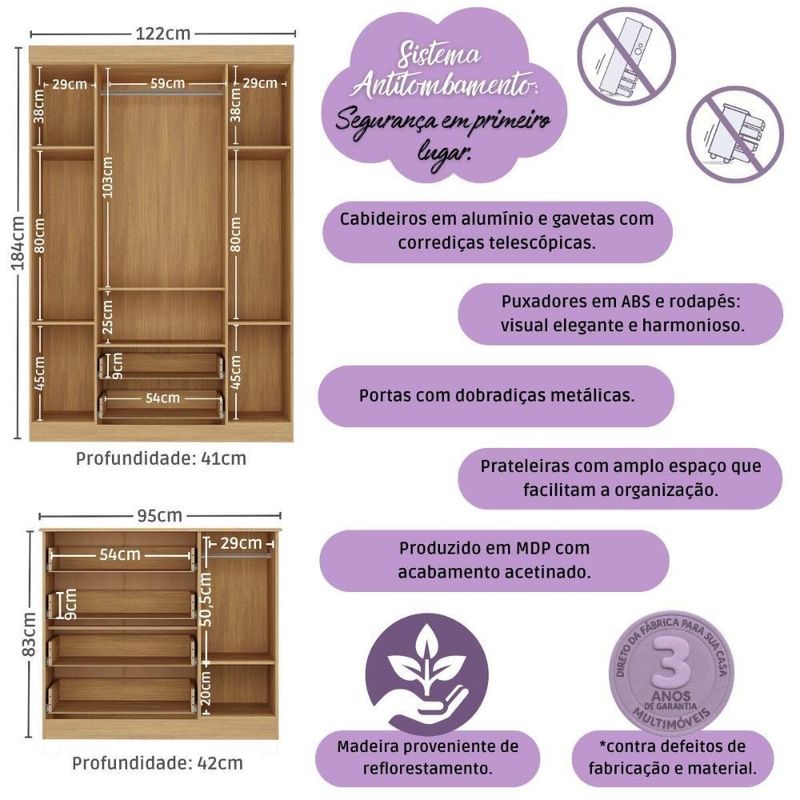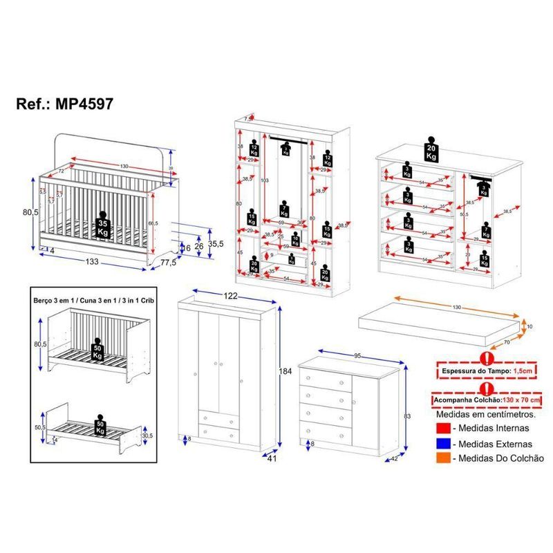 Quarto De Bebê Completo Berço Americano 3 Em 1 Colchão Encanto Multimóveis MP4597 MadeiradoCada detalhe do Quarto de Bebê Completo com Berço Americano 3 em 1 Colchão Incluso Multimóveis MP4597 foi pensado para acolher o seu pequeno com amor, conforto e segurança. Um espaço encantador que transmite tranquilidade e transforma os primeiros momentos do bebê em lembranças cheias de ternura.Diferenciais:- 3 anos de garantia contra defeitos de fabricação e material (exceto colchão).- Conjunto produzido em madeira de reflorestamento (MDP 12/15mm) com acabamento acetinado (cerca de 20% de brilho): sustentabilidade e durabilidade.- Berço 3 em 1 que se transforma em sofá e minicama, acompanhando o crescimento do bebê.- Lastro em madeira com 3 regulagens de altura e suporte para mosquiteiro para noites mais tranquilas e protegidas.- Grade Soft (PVC): ecologicamente correta, com matéria-prima livre de metais pesados, atóxica e com proteção antiamarelamento.- Berço certificado pelo INMETRO (Selo nº 0000085/2018).- Padrão americano (tamanho do colchão: 130x70cm).- Colchão D18 incluso: possui tratamento antiácaro, antialérgico, antimofo e um dos lados impermeável.- Guarda-roupa com 4 portas e 2 gavetas: amplo espaço para organizar roupinhas e acessórios.- Cômoda com 1 porta e 4 gavetas.- Corrediças telescópicas: abertura total e silenciosa das gavetas.- Cabideiro em alumínio: permite acomodar roupas longas e curtas para que não amassem.- Puxadores em ABS delicados e práticos.- Rodapés: visual elegante para o guarda-roupa e a cômoda.- Sistema antitombamento no guarda-roupa e cômoda: proporciona segurança para o bebê e tranquilidade aos pais.Conteúdo da Embalagem:1 (um) Berço1 (um) Colchão1 (um) Guarda-roupa1 (uma) CômodaManual de MontagemKit FerragemDimensões do Produto Montado:Berço - Altura: 80,5cm | Largura: 133cm | Profundidade: 77,5cmColchão - Altura: 10cm | Largura: 130cm | Profundidade: 70cmGuarda-roupa - Altura: 184cm | Largura: 122cm | Profundidade: 41cmCômoda - Altura: 83cm | Largura: 95cm | Profundidade: 42cm*Você pode consultar as medidas detalhadas na imagem técnica do produto.Observações Importantes:*As cores dos produtos podem sofrer variações de tonalidade de acordo com as configurações do seu dispositivo.*Aqui na Loja Multimóveis, você pode concluir sua compra facilmente com toda segurança. A entrega é garantida e você está em 1° lugar.*Imagens meramente ilustrativas (decoração não inclusa).*Os produtos serão entregues desmontados e não disponibilizamos o serviço de montagem. Acabamento: Finish Foil/Pintura UV | Tonalidade: Branco | Material: MDP | Referência do Modelo: MP4597 | Coleção: Encanto | Sistema de Montagem: O produto acompanha manual de montagem juntamente com kit ferragem. O produto será entregue desmontado e não disponibilizamos o serviço de montagem. | Instruções de Cuidado: Limpar com pano seco para retirar o pó. Não utilizar produtos químicos ou abrasivos. Não aplicar lustra móveis. | Produto Composto por: 1 berço, 1 colchão, 1 guarda-roupa, 1 cômoda, manual de montagem e kit ferragem. | Altura Montado: 184 | Largura Montado: 122 | Profundidade Montado: 41 | Tamanho (L x A x P): 122 x 184 x 41 | Peso do Produto: 126 | Corrediça: Telescópica | Inclui Berço: Sim | Acompanha Colchão: Sim | Inclui Guarda-Roupa: Sim | Inclui Gaveteiro: Sim | Material do Puxador: ABS | Quantidade de Portas: 5 | Quantidade de Gavetas: 6 | Quantidade de Puxadores: 17 | RBN: 17352335011 | Quantidade de Pés: 0 | Quantidade de Peças: 4 | Material dos Pés: N/A | Produto: Conjunto de Quarto | Portátil: Não | Registro INMETRO: 0000085/2018 | Fabricante: Multimóveis | Regulamentado pelo INMETRO: Sim | Garantia do Fabricante: 3 | Requer Montagem: Sim | Tempo de Garantia: 3 meses | Descrição do Tamanho: (L x A x P): 122 x 184 x 41 cm | Tipo de cama: Berço | Marca: Multimóveis | Tamanho da cama: Berço | Quantidade de criados mudos: 0 | Tipo de madeira: N/A | Comprimento da cama: 77,5 cm | Altura da cama: 80,5 cm | É Kit de fábrica: Sim | Estilo: Moderno | Largura da cama: 133 cm | Idade recomendada: 0-24 meses | Idade: Bebê | Quantidade de caixas de embalagem: 07 | Destaque 1: Produzido em MDP com acabamento acetinado: durabilidade e resistência. | Destaque 2: Berço 3 em 1: transforma-se em sofá e minicama, acompanhando as fases da criança. | Destaque 3: Guarda-roupa com 4 portas, 2 gavetas e cabideiro de alumínio. | Destaque 4: Cômoda com 1 porta e 4 gavetas: amplo espaço interno. | Destaque 5: Corrediças telescópicas: abertura total e silenciosa das gavetas. | Baterias são necessárias?: Não | Certificação de teste externa: 0000085/2018 | Is Fragile: Não | Dimensões do item P x L x A: length#value=41;length#unit=centimeters;width#value=122;width#unit=centimeters;height#value=184;height#unit=centimeters | Quantidade de itens: 1 | Peso do item: unit=kilograms;value=126 | Número da peça: MP4597.697 | Inclui manual de montagem: Sim | Tipo de Garantia: Garantia do Fabricante | Montagem: Necessita Montagem | País de Origem: Brasil | Palavras-chave: berco com colchao, berco pequeno bercos moveis, berco que vira cama, berco mini cama, berco, quarto completo de bebe, berco e guarda roupa, kit quarto bebe, quarto de bebe completo, quarto de bebe, quarto bebe, jogo de quarto bebe, quarto completo bebe, kit quarto bebe moveis, quarto infantil bebe, kit quarto de bebe, berço e guarda roupa | Inclui cômoda trocador: Não | Cor: Madeirado