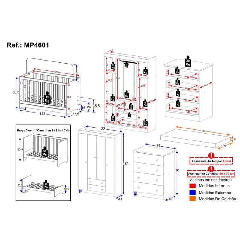 Quarto De Bebê Completo Berço Americano 3 Em 1 Colchão Encanto Multimóveis MP4601 MadeiradoO quarto do seu bebê é o cenário dos sonhos que estão prestes a começar. Com o Quarto de Bebê Completo com Berço Americano 3 em 1 Colchão Incluso Multimóveis MP4601, você cria um ambiente repleto de doçura, praticidade e amor — perfeito para acompanhar cada nova descoberta do seu pequeno.Diferenciais:- 3 anos de garantia contra defeitos de fabricação e material (exceto colchão).- Conjunto produzido em madeira de reflorestamento (MDP 12/15mm) com acabamento acetinado (cerca de 20% de brilho): sustentabilidade e durabilidade.- Berço 3 em 1 que se transforma em sofá e minicama, acompanhando o crescimento do bebê.- Lastro em madeira com 3 regulagens de altura e suporte para mosquiteiro para noites mais tranquilas e protegidas.- Berço certificado pelo INMETRO (Selo nº 0000085/2018).- Padrão americano (tamanho do colchão: 130x70cm).- Colchão D18 incluso: possui tratamento antiácaro, antialérgico, antimofo e um dos lados impermeável.- Grade Soft (PVC): ecologicamente correta, com matéria-prima livre de metais pesados, atóxica e com proteção antiamarelamento.- Guarda-roupa com 4 portas e 2 gavetas: amplo espaço para organizar roupinhas e acessórios.- Cômoda com 4 gavetas.- Corrediças telescópicas: abertura total e silenciosa das gavetas.- Cabideiro em alumínio: permite acomodar roupas longas e curtas para que não amassem.- Puxadores em ABS delicados e práticos.- Rodapés: visual elegante para o guarda-roupa e a cômoda.- Sistema antitombamento no guarda-roupa e cômoda: proporciona segurança para o bebê e tranquilidade aos pais.Conteúdo da Embalagem:1 (um) Berço1 (um) Colchão1 (um) Guarda-roupa1 (uma) CômodaManual de MontagemKit FerragemDimensões do Produto Montado:Berço - Altura: 80,5cm | Largura: 133cm | Profundidade: 77,5cmColchão - Altura: 10cm | Largura: 130cm | Profundidade: 70cmGuarda-roupa - Altura: 184cm | Largura: 122cm | Profundidade: 41cmCômoda - Altura: 83cm | Largura: 65cm | Profundidade: 42cm*Você pode consultar as medidas detalhadas na imagem técnica do produto.Observações Importantes:*As cores dos produtos podem sofrer variações de tonalidade de acordo com as configurações do seu dispositivo.*Aqui na Loja Multimóveis, você pode concluir sua compra facilmente com toda segurança. A entrega é garantida e você está em 1° lugar.*Imagens meramente ilustrativas (decoração não inclusa).*Os produtos serão entregues desmontados e não disponibilizamos o serviço de montagem. Acabamento: Finish Foil/Pintura UV | Tonalidade: Branco | Material: MDP | Referência do Modelo: MP4601 | Coleção: Encanto | Sistema de Montagem: O produto acompanha manual de montagem juntamente com kit ferragem. O produto será entregue desmontado e não disponibilizamos o serviço de montagem. | Instruções de Cuidado: Limpar com pano seco para retirar o pó. Não utilizar produtos químicos ou abrasivos. Não aplicar lustra móveis. | Produto Composto por: 1 berço, 1 colchão, 1 guarda-roupa, 1 cômoda, manual de montagem e kit ferragem. | Altura Montado: 184 | Largura Montado: 122 | Profundidade Montado: 41 | Tamanho (L x A x P): 122 x 184 x 41 | Peso do Produto: 118 | Corrediça: Telescópica | Inclui Berço: Sim | Acompanha Colchão: Sim | Inclui Guarda-Roupa: Sim | Inclui Gaveteiro: Sim | Material do Puxador: ABS | Quantidade de Portas: 4 | Quantidade de Gavetas: 6 | Quantidade de Puxadores: 16 | RBN: 17352335011 | Quantidade de Pés: 0 | Quantidade de Peças: 4 | Material dos Pés: N/A | Produto: Conjunto de Quarto | Portátil: Não | Registro INMETRO: 0000085/2018 | Fabricante: Multimóveis | Regulamentado pelo INMETRO: Sim | Garantia do Fabricante: 3 | Requer Montagem: Sim | Tempo de Garantia: 3 meses | Descrição do Tamanho: (L x A x P): 122 x 184 x 41 cm | Tipo de cama: Berço | Marca: Multimóveis | Tamanho da cama: Berço | Quantidade de criados mudos: 0 | Tipo de madeira: N/A | Comprimento da cama: 77,5 cm | Altura da cama: 80,5 cm | É Kit de fábrica: Sim | Estilo: Moderno | Largura da cama: 133 cm | Idade recomendada: 0-24 meses | Idade: Bebê | Quantidade de caixas de embalagem: 07 | Destaque 1: Produzido em MDP com acabamento acetinado: durabilidade e resistência. | Destaque 2: Berço 3 em 1: transforma-se em sofá e minicama, acompanhando as fases da criança. | Destaque 3: Guarda-roupa com 4 portas, 2 gavetas e cabideiro de alumínio. | Destaque 4: Cômoda com 4 gavetas: amplo espaço interno. | Destaque 5: Corrediças telescópicas: abertura total e silenciosa das gavetas. | Baterias são necessárias?: Não | Certificação de teste externa: 0000085/2018 | Is Fragile: Não | Dimensões do item P x L x A: length#value=41;length#unit=centimeters;width#value=122;width#unit=centimeters;height#value=184;height#unit=centimeters | Quantidade de itens: 1 | Peso do item: unit=kilograms;value=118 | Número da peça: MP4601.697 | Inclui manual de montagem: Sim | Tipo de Garantia: Garantia do Fabricante | Montagem: Necessita Montagem | País de Origem: Brasil | Palavras-chave: berco com colchao, berco pequeno bercos moveis, berco que vira cama, berco mini cama, berco, quarto completo de bebe, berco e guarda roupa, kit quarto bebe, quarto de bebe completo, quarto de bebe, quarto bebe, jogo de quarto bebe, quarto completo bebe, kit quarto bebe moveis, quarto infantil bebe, kit quarto de bebe, berço e guarda roupa | Inclui cômoda trocador: Não | Cor: Madeirado