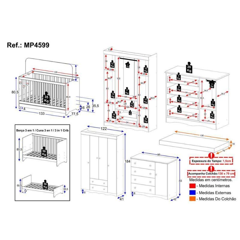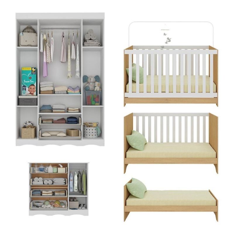 Quarto De Bebê Completo Berço Americano 3 Em 1 Colchão Realeza Multimóveis MP4599 Branco/madeiradoCada detalhe do Quarto de Bebê Completo com Berço Americano 3 em 1 Colchão Incluso Multimóveis MP4599 foi pensado para acolher o seu pequeno com amor, conforto e segurança. Um espaço encantador que transmite tranquilidade e transforma os primeiros momentos do bebê em lembranças cheias de ternura.Diferenciais:- 3 anos de garantia contra defeitos de fabricação e material (exceto colchão).- Conjunto produzido em madeira de reflorestamento (MDP 12/15mm) com acabamento acetinado (cerca de 20% de brilho): sustentabilidade e durabilidade.- Berço 3 em 1 que se transforma em sofá e minicama, acompanhando o crescimento do bebê.- Lastro em madeira com 3 regulagens de altura e suporte para mosquiteiro para noites mais tranquilas e protegidas.- Grade Soft (PVC): ecologicamente correta, com matéria-prima livre de metais pesados, atóxica e com proteção antiamarelamento.- Berço certificado pelo INMETRO (Selo nº 0000085/2018).- Padrão americano (tamanho do colchão: 130x70cm).- Colchão D18 incluso: possui tratamento antiácaro, antialérgico, antimofo e um dos lados impermeável.- Guarda-roupa com 4 portas e 2 gavetas: amplo espaço para organizar roupinhas e acessórios.- Cômoda com 1 porta e 4 gavetas.- Corrediças telescópicas: abertura total e silenciosa das gavetas.- Cabideiro em alumínio: permite acomodar roupas longas e curtas para que não amassem.- Puxadores em ABS delicados e práticos.- Rodapés usinados em MDF: visual elegante para o guarda-roupa e a cômoda.- Sistema antitombamento no guarda-roupa e cômoda: proporciona segurança para o bebê e tranquilidade aos pais.Conteúdo da Embalagem:1 (um) Berço1 (um) Colchão1 (um) Guarda-roupa1 (uma) CômodaManual de MontagemKit FerragemDimensões do Produto Montado:Berço - Altura: 80,5cm | Largura: 133cm | Profundidade: 77,5cmColchão - Altura: 10cm | Largura: 130cm | Profundidade: 70cmGuarda-roupa - Altura: 184cm | Largura: 122cm | Profundidade: 41cmCômoda - Altura: 83cm | Largura: 95cm | Profundidade: 42cm*Você pode consultar as medidas detalhadas na imagem técnica do produto.Observações Importantes:*As cores dos produtos podem sofrer variações de tonalidade de acordo com as configurações do seu dispositivo.*Aqui na Loja Multimóveis, você pode concluir sua compra facilmente com toda segurança. A entrega é garantida e você está em 1° lugar.*Imagens meramente ilustrativas (decoração não inclusa).*Os produtos serão entregues desmontados e não disponibilizamos o serviço de montagem. Acabamento: Finish Foil/Pintura UV | Tonalidade: Branco | Material: MDP | Referência do Modelo: MP4599 | Coleção: Realeza | Sistema de Montagem: O produto acompanha manual de montagem juntamente com kit ferragem. O produto será entregue desmontado e não disponibilizamos o serviço de montagem. | Instruções de Cuidado: Limpar com pano seco para retirar o pó. Não utilizar produtos químicos ou abrasivos. Não aplicar lustra móveis. | Produto Composto por: 1 berço, 1 colchão, 1 guarda-roupa, 1 cômoda, manual de montagem e kit ferragem. | Altura Montado: 184 | Largura Montado: 122 | Profundidade Montado: 41 | Tamanho (L x A x P): 122 x 184 x 41 | Peso do Produto: 126 | Corrediça: Telescópica | Inclui Berço: Sim | Acompanha Colchão: Sim | Inclui Guarda-Roupa: Sim | Inclui Gaveteiro: Sim | Material do Puxador: ABS | Quantidade de Portas: 5 | Quantidade de Gavetas: 6 | Quantidade de Puxadores: 17 | RBN: 17352335011 | Quantidade de Pés: 0 | Quantidade de Peças: 4 | Material dos Pés: N/A | Produto: Conjunto de Quarto | Portátil: Não | Registro INMETRO: 0000085/2018 | Fabricante: Multimóveis | Regulamentado pelo INMETRO: Sim | Garantia do Fabricante: 3 | Requer Montagem: Sim | Tempo de Garantia: 3 meses | Descrição do Tamanho: (L x A x P): 122 x 184 x 41 cm | Tipo de cama: Berço | Marca: Multimóveis | Tamanho da cama: Berço | Quantidade de criados mudos: 0 | Tipo de madeira: N/A | Comprimento da cama: 77,5 cm | Altura da cama: 80,5 cm | É Kit de fábrica: Sim | Estilo: Moderno | Largura da cama: 133 cm | Idade recomendada: 0-24 meses | Idade: Bebê | Quantidade de caixas de embalagem: 07 | Destaque 1: Produzido em MDP com acabamento acetinado: durabilidade e resistência. | Destaque 2: Berço 3 em 1: transforma-se em sofá e minicama, acompanhando as fases da criança. | Destaque 3: Guarda-roupa com 4 portas, 2 gavetas e cabideiro de alumínio. | Destaque 4: Cômoda com 1 porta e 4 gavetas: amplo espaço interno. | Destaque 5: Corrediças telescópicas: abertura total e silenciosa das gavetas. | Baterias são necessárias?: Não | Certificação de teste externa: 0000085/2018 | Is Fragile: Não | Dimensões do item P x L x A: length#value=41;length#unit=centimeters;width#value=122;width#unit=centimeters;height#value=184;height#unit=centimeters | Quantidade de itens: 1 | Peso do item: unit=kilograms;value=126 | Número da peça: MP4599.697 | Inclui manual de montagem: Sim | Tipo de Garantia: Garantia do Fabricante | Montagem: Necessita Montagem | País de Origem: Brasil | Palavras-chave: berco com colchao, berco pequeno bercos moveis, berco que vira cama, berco mini cama, berco, quarto completo de bebe, berco e guarda roupa, kit quarto bebe, quarto de bebe completo, quarto de bebe, quarto bebe, jogo de quarto bebe, quarto completo bebe, kit quarto bebe moveis, quarto infantil bebe, kit quarto de bebe, berço e guarda roupa | Inclui cômoda trocador: Não | Cor: Branco/Madeirado
