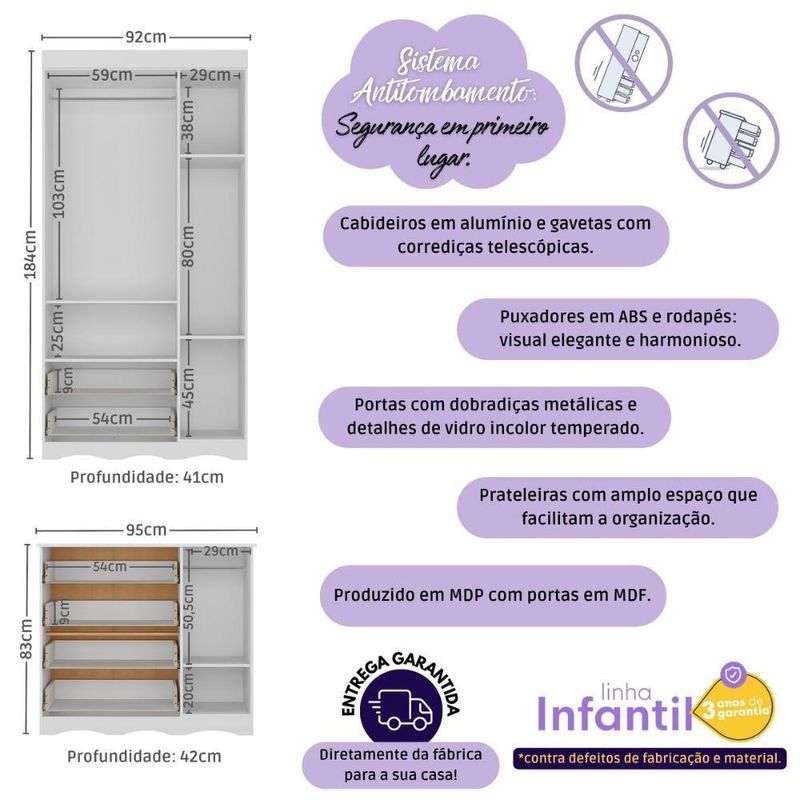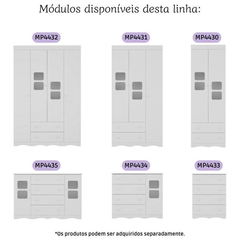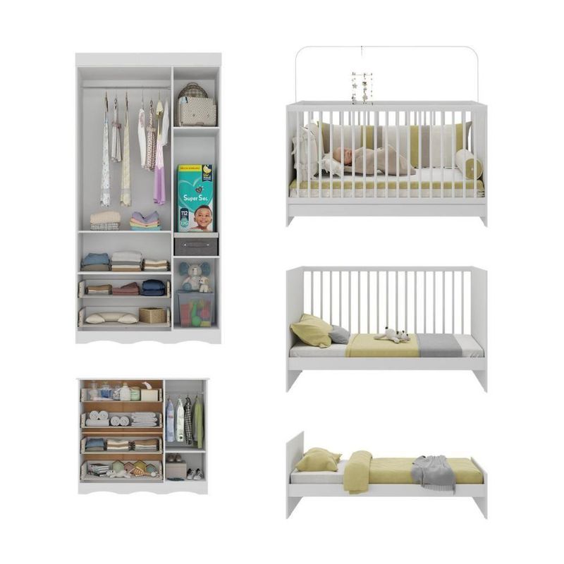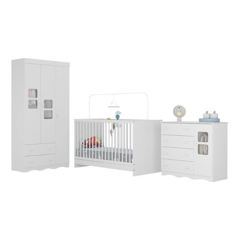 Quarto De Bebê Completo Com Berço 3 Em 1 Para Colchão 130x60cm Serena Multimóveis MP4527 BrancoCada detalhe do Quarto de Bebê Completo com Berço 3 em 1 para Colchão 130x60cm Serena Multimóveis MP4527 foi pensado para receber seu pequeno com carinho e segurança. Um conjunto que une charme, organização e qualidade, criando o cenário perfeito para os primeiros sorrisos, descobertas e sonhos do bebê.Diferenciais:- Conjunto produzido em MDP/MDF (12/15mm) de reflorestamento com acabamento acetinado (cerca de 20% de brilho): sustentabilidade e durabilidade.- Berço 3 em 1 que se transforma em sofá e minicama, acompanhando o crescimento do bebê.- Lastro em madeira com 3 regulagens de altura e suporte para mosquiteiro para noites mais tranquilas e protegidas.- Berço certificado pelo INMETRO (Selo nº 000332/2025).- Padrão nacional (tamanho do colchão indicado: 130x60cm). Colchão não incluso.- Frentes e rodapés (guarda-roupa e cômoda) produzidos em MDF.- Guarda-roupa com 3 portas e 2 gavetas: amplo espaço para organizar roupinhas e acessórios.- Cômoda com 1 porta e 4 gavetas.- Detalhes de vidro incolor temperado 3mm nas portas: toque charmoso que permite visualizar o interior dos móveis.- Corrediças telescópicas: abertura total e silenciosa das gavetas.- Cabideiro em alumínio: permite acomodar roupas longas e curtas para que não amassem.- Puxadores em ABS delicados e práticos.- Rodapés usinados: visual elegante para o guarda-roupa e a cômoda.- Sistema antitombamento no guarda-roupa e cômoda: proporciona segurança para o bebê e tranquilidade aos pais.Conteúdo da Embalagem:1 (um) Berço1 (um) Guarda-roupa1 (uma) CômodaManual de MontagemKit FerragemDimensões do Produto Montado:Berço - Altura: 80,5cm | Largura: 133cm | Profundidade: 66cmGuarda-roupa - Altura: 184cm | Largura: 92cm | Profundidade: 41cmCômoda - Altura: 83cm | Largura: 95cm | Profundidade: 42cm*Você pode consultar as medidas detalhadas na imagem técnica do produto.Observações Importantes:*As cores dos produtos podem sofrer variações de tonalidade de acordo com as configurações do seu dispositivo.*Obrigatório fixar o guarda-roupa e a cômoda na parede.*Imagens meramente ilustrativas (decoração não inclusa).*Os produtos serão entregues desmontados e não disponibilizamos o serviço de montagem. Acabamento: Finish Foil/Pintura UV | Tonalidade: Branco | Material: MDF/MDP | Referência do Modelo: MP4527 | Coleção: Serena | Sistema de Montagem: O produto acompanha manual de montagem juntamente com kit ferragem. O produto será entregue desmontado e não disponibilizamos o serviço de montagem. | Instruções de Cuidado: Limpar com pano seco para retirar o pó. Não utilizar produtos químicos ou abrasivos. Não aplicar lustra móveis. | Produto Composto por: 1 berço, 1 guarda-roupa, 1 cômoda, manual de montagem e kit ferragem. | Altura Montado: 184 | Largura Montado: 92 | Profundidade Montado: 41 | Tamanho (L x A x P): 92 x 184 x 41 | Peso do Produto: 108 | Corrediça: Telescópica | Inclui Berço: Sim | Acompanha Colchão: Não | Inclui Guarda-Roupa: Sim | Inclui Gaveteiro: Sim | Material do Puxador: ABS | Quantidade de Portas: 4 | Quantidade de Gavetas: 6 | Quantidade de Puxadores: 16 | RBN: 17352335011 | Quantidade de Pés: 0 | Quantidade de Peças: 3 | Material dos Pés: N/A | Produto: Conjunto de Quarto | Portátil: Não | Registro INMETRO: 000332/2025 | Fabricante: Multimóveis | Regulamentado pelo INMETRO: Sim | Garantia do Fabricante: 3 | Requer Montagem: Sim | Altura do Produto com Embalagem: 49 | Largura do Produto com Embalagem: 74 | Comprimento do Produto com Embalagem: 188 | Peso do Produto com Embalagem: 108 | Nome do Produto no Fornecedor: Quarto de Bebê Completo com Berço 3 em 1 para Colchão 130x60cm Serena Multimóveis MP4527 Branco | Estado de Origem: RS | Produto precisa de Montagem?: Sim, sugerimos a contratação do nosso serviço de montagem (para os CEPs em que o serviço está disponível) ou de algum profissional experiente de sua preferência | Tempo de Garantia: 3 meses | Descrição do Tamanho: (L x A x P): 92 x 184 x 41 cm | Tipo de cama: Berço | Marca: Multimóveis | Tamanho da cama: Berço | Quantidade de criados mudos: 0 | Tipo de madeira: N/A | Comprimento da cama: 66 cm | Altura da cama: 80,5 cm | É Kit de fábrica: Sim | Estilo: Moderno | Largura da cama: 133 cm | Idade recomendada: 0-24 meses | Idade: Bebê | Quantidade de caixas de embalagem: 05 | Destaque 1: Produzido em MDP/MDF com acabamento acetinado: durabilidade e resistência. | Destaque 2: Berço 3 em 1: transforma-se em sofá e minicama, acompanhando as fases da criança. | Destaque 3: Guarda-roupa com 3 portas e 2 gavetas, cômoda com 1 porta e 4 gavetas: amplo espaço interno. | Destaque 4: Detalhes de vidro nas portas: permitem enxergar as roupas no interior, oferecendo um visual elegante e descontraído ao ambiente. | Destaque 5: Corrediças telescópicas: abertura total e silenciosa das gavetas. | Baterias são necessárias?: Não | Certificação de teste externa: 000332/2025 | Is Fragile: Sim | Dimensões do item P x L x A: length#value=41;length#unit=centimeters;width#value=92;width#unit=centimeters;height#value=184;height#unit=centimeters | Quantidade de itens: 1 | Peso do item: unit=kilograms;value=108 | Número da peça: MP4527.697 | Inclui manual de montagem: Sim | Tipo de Garantia: Garantia do Fabricante | Montagem: Necessita Montagem | País de Origem: Brasil | Palavras-chave: berco com colchao, berco pequeno bercos moveis, berco que vira cama, berco mini cama, berco, quarto completo de bebe, berco e guarda roupa, kit quarto bebe, quarto de bebe completo, quarto de bebe, quarto bebe, jogo de quarto bebe, quarto completo bebe, kit quarto bebe moveis, quarto infantil bebe, kit quarto de bebe, berço e guarda roupa | Inclui cômoda trocador: Não | Cor: Branco