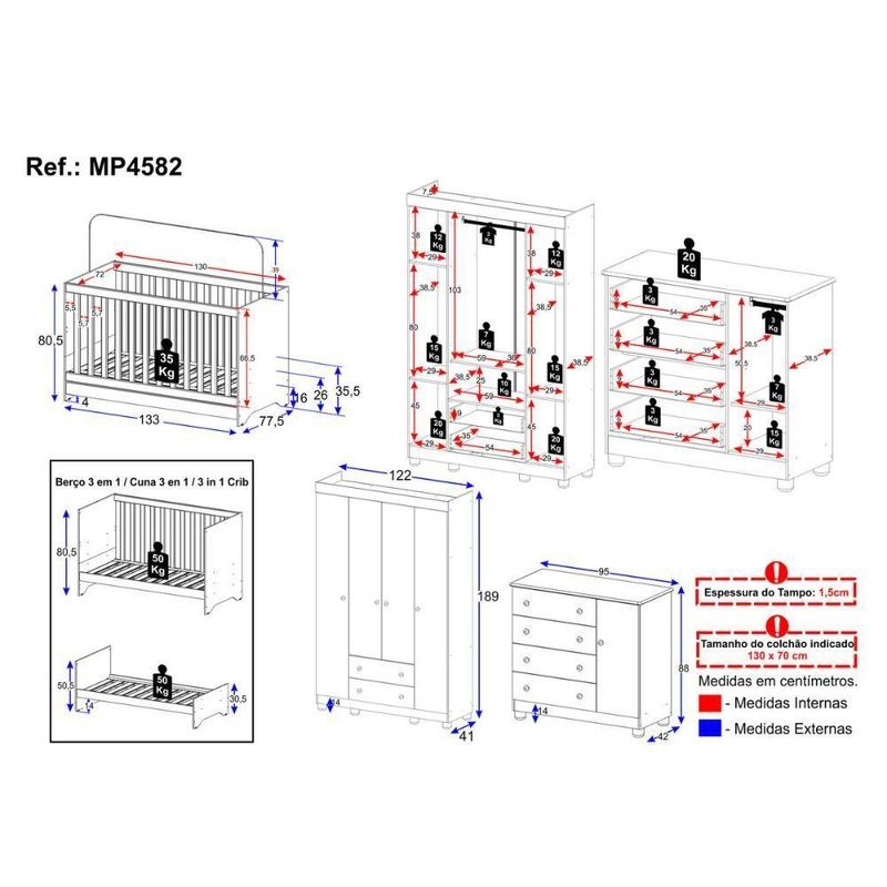 Quarto De Bebê Completo Com Berço Americano 3 Em 1 Allegra Multimóveis MP4582 Madeirado/brancoCada detalhe do Quarto de Bebê Completo com Berço Americano 3 em 1 p/Colchão 130x70cm Multimóveis MP4582 foi pensado para acolher o seu pequeno com amor, conforto e segurança. Um espaço encantador que transmite tranquilidade e transforma os primeiros momentos do bebê em lembranças cheias de ternura.Diferenciais:- 3 anos de garantia contra defeitos de fabricação e material.- Conjunto produzido em madeira de reflorestamento (MDP 12/15mm) com acabamento acetinado (cerca de 20% de brilho): sustentabilidade e durabilidade.- Berço 3 em 1 que se transforma em sofá e minicama, acompanhando o crescimento do bebê.- Lastro em madeira com 3 regulagens de altura e suporte para mosquiteiro para noites mais tranquilas e protegidas.- Berço certificado pelo INMETRO (Selo nº 0000085/2018).- Padrão americano (tamanho do colchão indicado: 130x70cm). Colchão não incluso.- Grade Soft (PVC): ecologicamente correta, com matéria-prima livre de metais pesados, atóxica e com proteção antiamarelamento.- Guarda-roupa com 4 portas e 2 gavetas: amplo espaço para organizar roupinhas e acessórios.- Cômoda com 1 porta e 4 gavetas.- Corrediças telescópicas: abertura total e silenciosa das gavetas.- Cabideiro em alumínio: permite acomodar roupas longas e curtas para que não amassem.- Puxadores em ABS delicados e práticos.- Pés em polipropileno e rodapés: visual elegante e estabilidade para o guarda-roupa e a cômoda.- Sistema antitombamento no guarda-roupa e cômoda: proporciona segurança para o bebê e tranquilidade aos pais.Conteúdo da Embalagem:1 (um) Berço1 (um) Guarda-roupa1 (uma) CômodaManual de MontagemKit FerragemDimensões do Produto Montado:Berço - Altura: 80,5cm | Largura: 133cm | Profundidade: 77,5cmGuarda-roupa - Altura: 189cm | Largura: 122cm | Profundidade: 41cmCômoda - Altura: 88cm | Largura: 95cm | Profundidade: 42cm*Você pode consultar as medidas detalhadas na imagem técnica do produto.Observações Importantes:*As cores dos produtos podem sofrer variações de tonalidade de acordo com as configurações do seu dispositivo.*Aqui na Loja Multimóveis, você pode concluir sua compra facilmente com toda segurança. A entrega é garantida e você está em 1° lugar.*Imagens meramente ilustrativas (decoração não inclusa).*Os produtos serão entregues desmontados e não disponibilizamos o serviço de montagem. Acabamento: Finish Foil/Pintura UV | Tonalidade: Branco | Material: MDP | Referência do Modelo: MP4582 | Coleção: Allegra | Sistema de Montagem: O produto acompanha manual de montagem juntamente com kit ferragem. O produto será entregue desmontado e não disponibilizamos o serviço de montagem. | Instruções de Cuidado: Limpar com pano seco para retirar o pó. Não utilizar produtos químicos ou abrasivos. Não aplicar lustra móveis. | Produto Composto por: 1 berço, 1 guarda-roupa, 1 cômoda, manual de montagem e kit ferragem. | Altura Montado: 189 | Largura Montado: 122 | Profundidade Montado: 41 | Tamanho (L x A x P): 122 x 189 x 41 | Peso do Produto: 125 | Corrediça: Telescópica | Inclui Berço: Sim | Acompanha Colchão: Não | Inclui Guarda-Roupa: Sim | Inclui Gaveteiro: Sim | Material do Puxador: ABS | Quantidade de Portas: 5 | Quantidade de Gavetas: 6 | Quantidade de Puxadores: 17 | RBN: 17352335011 | Quantidade de Pés: 13 | Quantidade de Peças: 3 | Material dos Pés: Polipropileno | Produto: Conjunto de Quarto | Portátil: Não | Registro INMETRO: 0000085/2018 | Fabricante: Multimóveis | Regulamentado pelo INMETRO: Sim | Garantia do Fabricante: 3 | Requer Montagem: Sim | Tempo de Garantia: 3 meses | Descrição do Tamanho: (L x A x P): 122 x 189 x 41 cm | Tipo de cama: Berço | Marca: Multimóveis | Tamanho da cama: Berço | Quantidade de criados mudos: 0 | Tipo de madeira: N/A | Comprimento da cama: 77,5 cm | Altura da cama: 80,5 cm | É Kit de fábrica: Sim | Estilo: Moderno | Largura da cama: 133 cm | Idade recomendada: 0-24 meses | Idade: Bebê | Quantidade de caixas de embalagem: 06 | Destaque 1: Produzido em MDP com acabamento acetinado: durabilidade e resistência. | Destaque 2: Berço 3 em 1: transforma-se em sofá e minicama, acompanhando as fases da criança. | Destaque 3: Guarda-roupa com 4 portas, 2 gavetas e cabideiro de alumínio. | Destaque 4: Cômoda com 1 porta e 4 gavetas: amplo espaço interno. | Destaque 5: Corrediças telescópicas: abertura total e silenciosa das gavetas. | Baterias são necessárias?: Não | Certificação de teste externa: 0000085/2018 | Is Fragile: Não | Dimensões do item P x L x A: length#value=41;length#unit=centimeters;width#value=122;width#unit=centimeters;height#value=189;height#unit=centimeters | Quantidade de itens: 1 | Peso do item: unit=kilograms;value=125 | Número da peça: MP4582.697 | Inclui manual de montagem: Sim | Tipo de Garantia: Garantia do Fabricante | Montagem: Necessita Montagem | País de Origem: Brasil | Palavras-chave: berco com colchao, berco pequeno bercos moveis, berco que vira cama, berco mini cama, berco, quarto completo de bebe, berco e guarda roupa, kit quarto bebe, quarto de bebe completo, quarto de bebe, quarto bebe, jogo de quarto bebe, quarto completo bebe, kit quarto bebe moveis, quarto infantil bebe, kit quarto de bebe, berço e guarda roupa | Inclui cômoda trocador: Não | Cor: Madeirado/Branco