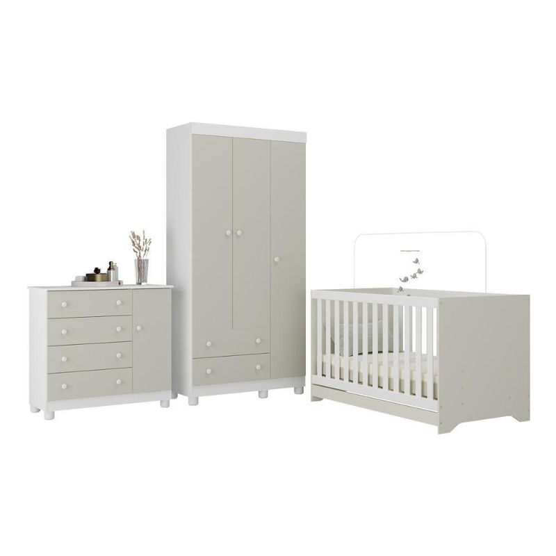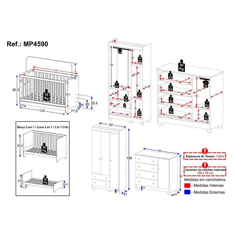 Quarto De Bebê Completo Com Berço Americano 3 Em 1 Allegra Multimóveis MP4590 Branco/off WhiteMais do que um conjunto de móveis, o Quarto de Bebê Completo com Berço Americano 3 em 1 p/Colchão 130x70cm Multimóveis MP4590 é um abraço em forma de ambiente. Feito para garantir segurança, conforto e funcionalidade, ele envolve o bebê com o carinho que todo início de vida merece.Diferenciais:- 3 anos de garantia contra defeitos de fabricação e material.- Conjunto produzido em madeira de reflorestamento (MDP 12/15mm) com acabamento acetinado (cerca de 20% de brilho): sustentabilidade e durabilidade.- Berço 3 em 1 que se transforma em sofá e minicama, acompanhando o crescimento do bebê.- Lastro em madeira com 3 regulagens de altura e suporte para mosquiteiro para noites mais tranquilas e protegidas.- Berço certificado pelo INMETRO (Selo nº 0000085/2018).- Padrão americano (tamanho do colchão indicado: 130x70cm). Colchão não incluso. - Grade Soft (PVC): ecologicamente correta, com matéria-prima livre de metais pesados, atóxica e com proteção antiamarelamento.- Guarda-roupa com 3 portas e 2 gavetas: amplo espaço para organizar roupinhas e acessórios.- Cômoda com 1 porta e 4 gavetas.- Corrediças telescópicas: abertura total e silenciosa das gavetas.- Cabideiro em alumínio: permite acomodar roupas longas e curtas para que não amassem.- Puxadores em ABS delicados e práticos.- Pés em polipropileno e rodapés: visual elegante e estabilidade para o guarda-roupa e a cômoda.- Sistema antitombamento no guarda-roupa e cômoda: proporciona segurança para o bebê e tranquilidade aos pais.Conteúdo da Embalagem:1 (um) Berço1 (um) Guarda-roupa1 (uma) CômodaManual de MontagemKit FerragemDimensões do Produto Montado:Berço - Altura: 80,5cm | Largura: 133cm | Profundidade: 77,5cmGuarda-roupa - Altura: 189cm | Largura: 92cm | Profundidade: 41cmCômoda - Altura: 88cm | Largura: 95cm | Profundidade: 42cm*Você pode consultar as medidas detalhadas na imagem técnica do produto.Observações Importantes:*As cores dos produtos podem sofrer variações de tonalidade de acordo com as configurações do seu dispositivo.*Aqui na Loja Multimóveis, você pode concluir sua compra facilmente com toda segurança. A entrega é garantida e você está em 1° lugar.*Imagens meramente ilustrativas (decoração não inclusa).*Os produtos serão entregues desmontados e não disponibilizamos o serviço de montagem. Acabamento: Finish Foil/Pintura UV | Tonalidade: Branco | Material: MDP | Referência do Modelo: MP4590 | Coleção: Allegra | Sistema de Montagem: O produto acompanha manual de montagem juntamente com kit ferragem. O produto será entregue desmontado e não disponibilizamos o serviço de montagem. | Instruções de Cuidado: Limpar com pano seco para retirar o pó. Não utilizar produtos químicos ou abrasivos. Não aplicar lustra móveis. | Produto Composto por: 1 berço, 1 guarda-roupa, 1 cômoda, manual de montagem e kit ferragem. | Altura Montado: 189 | Largura Montado: 92 | Profundidade Montado: 41 | Tamanho (L x A x P): 92 x 189 x 41 | Peso do Produto: 107 | Corrediça: Telescópica | Inclui Berço: Sim | Acompanha Colchão: Não | Inclui Guarda-Roupa: Sim | Inclui Gaveteiro: Sim | Material do Puxador: ABS | Quantidade de Portas: 4 | Quantidade de Gavetas: 6 | Quantidade de Puxadores: 16 | RBN: 17352335011 | Quantidade de Pés: 11 | Quantidade de Peças: 3 | Material dos Pés: Polipropileno | Produto: Conjunto de Quarto | Portátil: Não | Registro INMETRO: 0000085/2018 | Fabricante: Multimóveis | Regulamentado pelo INMETRO: Sim | Garantia do Fabricante: 3 | Requer Montagem: Sim | Tempo de Garantia: 3 meses | Descrição do Tamanho: (L x A x P): 92 x 189 x 41 cm | Tipo de cama: Berço | Marca: Multimóveis | Tamanho da cama: Berço | Quantidade de criados mudos: 0 | Tipo de madeira: N/A | Comprimento da cama: 77,5 cm | Altura da cama: 80,5 cm | É Kit de fábrica: Sim | Estilo: Moderno | Largura da cama: 133 cm | Idade recomendada: 0-24 meses | Idade: Bebê | Quantidade de caixas de embalagem: 05 | Destaque 1: Produzido em MDP com acabamento acetinado: durabilidade e resistência. | Destaque 2: Berço 3 em 1: transforma-se em sofá e minicama, acompanhando as fases da criança. | Destaque 3: Guarda-roupa com 3 portas, 2 gavetas e cabideiro de alumínio. | Destaque 4: Cômoda com 1 porta e 4 gavetas: amplo espaço interno. | Destaque 5: Corrediças telescópicas: abertura total e silenciosa das gavetas. | Baterias são necessárias?: Não | Certificação de teste externa: 0000085/2018 | Is Fragile: Não | Dimensões do item P x L x A: length#value=41;length#unit=centimeters;width#value=92;width#unit=centimeters;height#value=189;height#unit=centimeters | Quantidade de itens: 1 | Peso do item: unit=kilograms;value=107 | Número da peça: MP4590.697 | Inclui manual de montagem: Sim | Tipo de Garantia: Garantia do Fabricante | Montagem: Necessita Montagem | País de Origem: Brasil | Palavras-chave: berco com colchao, berco pequeno bercos moveis, berco que vira cama, berco mini cama, berco, quarto completo de bebe, berco e guarda roupa, kit quarto bebe, quarto de bebe completo, quarto de bebe, quarto bebe, jogo de quarto bebe, quarto completo bebe, kit quarto bebe moveis, quarto infantil bebe, kit quarto de bebe, berço e guarda roupa | Inclui cômoda trocador: Não | Cor: Branco/Off White