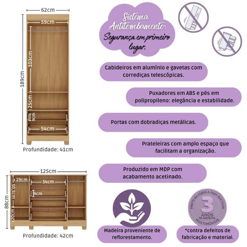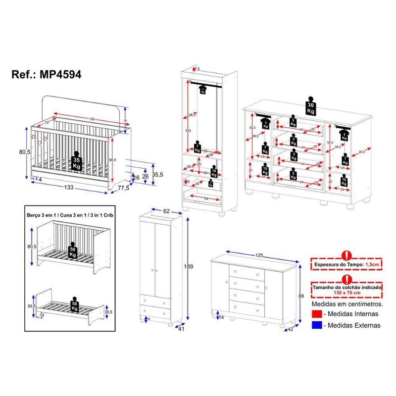 Quarto De Bebê Completo Com Berço Americano 3 Em 1 Allegra Multimóveis MP4594 MadeiradoO Quarto de Bebê Completo com Berço Americano 3 em 1 p/Colchão 130x70cm Multimóveis MP4594 une design moderno, praticidade e um toque de afeto para tornar o cantinho do seu bebê simplesmente encantador. Cada móvel reflete cuidado e proteção, criando o espaço perfeito para o amor crescer todos os dias.Diferenciais:- 3 anos de garantia contra defeitos de fabricação e material.- Conjunto produzido em madeira de reflorestamento (MDP 12/15mm) com acabamento acetinado (cerca de 20% de brilho): sustentabilidade e durabilidade.- Berço 3 em 1 que se transforma em sofá e minicama, acompanhando o crescimento do bebê.- Lastro em madeira com 3 regulagens de altura e suporte para mosquiteiro para noites mais tranquilas e protegidas.- Berço certificado pelo INMETRO (Selo nº 0000085/2018).- Padrão americano (tamanho do colchão indicado: 130x70cm). Colchão não incluso.- Grade Soft (PVC): ecologicamente correta, com matéria-prima livre de metais pesados, atóxica e com proteção antiamarelamento.- Guarda-roupa com 2 portas e 2 gavetas: amplo espaço para organizar roupinhas e acessórios.- Cômoda com 2 portas e 4 gavetas.- Corrediças telescópicas: abertura total e silenciosa das gavetas.- Cabideiro em alumínio: permite acomodar roupas longas e curtas para que não amassem.- Puxadores em ABS delicados e práticos.- Pés em polipropileno e rodapés: visual elegante e estabilidade para o guarda-roupa e a cômoda.- Sistema antitombamento no guarda-roupa e cômoda: proporciona segurança para o bebê e tranquilidade aos pais.Conteúdo da Embalagem:1 (um) Berço1 (um) Guarda-roupa1 (uma) CômodaManual de MontagemKit FerragemDimensões do Produto Montado:Berço - Altura: 80,5cm | Largura: 133cm | Profundidade: 77,5cmGuarda-roupa - Altura: 189cm | Largura: 62cm | Profundidade: 41cmCômoda - Altura: 88cm | Largura: 125cm | Profundidade: 42cm*Você pode consultar as medidas detalhadas na imagem técnica do produto.Observações Importantes:*As cores dos produtos podem sofrer variações de tonalidade de acordo com as configurações do seu dispositivo.*Aqui na Loja Multimóveis, você pode concluir sua compra facilmente com toda segurança. A entrega é garantida e você está em 1° lugar.*Imagens meramente ilustrativas (decoração não inclusa).*Os produtos serão entregues desmontados e não disponibilizamos o serviço de montagem. Acabamento: Finish Foil/Pintura UV | Tonalidade: Branco | Material: MDP | Referência do Modelo: MP4594 | Coleção: Allegra | Sistema de Montagem: O produto acompanha manual de montagem juntamente com kit ferragem. O produto será entregue desmontado e não disponibilizamos o serviço de montagem. | Instruções de Cuidado: Limpar com pano seco para retirar o pó. Não utilizar produtos químicos ou abrasivos. Não aplicar lustra móveis. | Produto Composto por: 1 berço, 1 guarda-roupa, 1 cômoda, manual de montagem e kit ferragem. | Altura Montado: 189 | Largura Montado: 62 | Profundidade Montado: 41 | Tamanho (L x A x P): 62 x 189 x 41 | Peso do Produto: 102 | Corrediça: Telescópica | Inclui Berço: Sim | Acompanha Colchão: Não | Inclui Guarda-Roupa: Sim | Inclui Gaveteiro: Sim | Material do Puxador: ABS | Quantidade de Portas: 4 | Quantidade de Gavetas: 6 | Quantidade de Puxadores: 16 | RBN: 17352335011 | Quantidade de Pés: 10 | Quantidade de Peças: 3 | Material dos Pés: Polipropileno | Produto: Conjunto de Quarto | Portátil: Não | Registro INMETRO: 0000085/2018 | Fabricante: Multimóveis | Regulamentado pelo INMETRO: Sim | Garantia do Fabricante: 3 | Requer Montagem: Sim | Tempo de Garantia: 3 meses | Descrição do Tamanho: (L x A x P): 62 x 189 x 41 cm | Tipo de cama: Berço | Marca: Multimóveis | Tamanho da cama: Berço | Quantidade de criados mudos: 0 | Tipo de madeira: N/A | Comprimento da cama: 77,5 cm | Altura da cama: 80,5 cm | É Kit de fábrica: Sim | Estilo: Moderno | Largura da cama: 133 cm | Idade recomendada: 0-24 meses | Idade: Bebê | Quantidade de caixas de embalagem: 05 | Destaque 1: Produzido em MDP com acabamento acetinado: durabilidade e resistência. | Destaque 2: Berço 3 em 1: transforma-se em sofá e minicama, acompanhando as fases da criança. | Destaque 3: Guarda-roupa com 2 portas, 2 gavetas e cabideiro de alumínio. | Destaque 4: Cômoda com 2 portas e 4 gavetas: amplo espaço interno. | Destaque 5: Corrediças telescópicas: abertura total e silenciosa das gavetas. | Baterias são necessárias?: Não | Certificação de teste externa: 0000085/2018 | Is Fragile: Não | Dimensões do item P x L x A: length#value=41;length#unit=centimeters;width#value=62;width#unit=centimeters;height#value=189;height#unit=centimeters | Quantidade de itens: 1 | Peso do item: unit=kilograms;value=102 | Número da peça: MP4594.697 | Inclui manual de montagem: Sim | Tipo de Garantia: Garantia do Fabricante | Montagem: Necessita Montagem | País de Origem: Brasil | Palavras-chave: berco com colchao, berco pequeno bercos moveis, berco que vira cama, berco mini cama, berco, quarto completo de bebe, berco e guarda roupa, kit quarto bebe, quarto de bebe completo, quarto de bebe, quarto bebe, jogo de quarto bebe, quarto completo bebe, kit quarto bebe moveis, quarto infantil bebe, kit quarto de bebe, berço e guarda roupa | Inclui cômoda trocador: Não | Cor: Madeirado