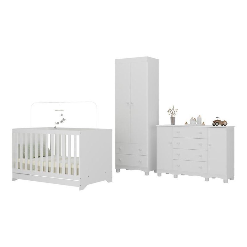 Quarto De Bebê Completo Com Berço Americano 3 Em 1 Dengo Multimóveis MP4596 BrancoO Quarto de Bebê Completo com Berço Americano 3 em 1 p/Colchão 130x70cm Multimóveis MP4596 une design moderno, praticidade e um toque de afeto para tornar o cantinho do seu bebê simplesmente encantador. Cada móvel reflete cuidado e proteção, criando o espaço perfeito para o amor crescer todos os dias.Diferenciais:- 3 anos de garantia contra defeitos de fabricação e material.- Conjunto produzido em madeira de reflorestamento (MDP 12/15mm) com acabamento acetinado (cerca de 20% de brilho): sustentabilidade e durabilidade.- Berço 3 em 1 que se transforma em sofá e minicama, acompanhando o crescimento do bebê.- Lastro em madeira com 3 regulagens de altura e suporte para mosquiteiro para noites mais tranquilas e protegidas.- Berço certificado pelo INMETRO (Selo nº 0000085/2018).- Padrão americano (tamanho do colchão indicado: 130x70cm). Colchão não incluso.- Grade Soft (PVC): ecologicamente correta, com matéria-prima livre de metais pesados, atóxica e com proteção antiamarelamento.- Guarda-roupa com 2 portas e 2 gavetas: amplo espaço para organizar roupinhas e acessórios.- Cômoda com 2 portas e 4 gavetas.- Corrediças telescópicas: abertura total e silenciosa das gavetas.- Cabideiro em alumínio: permite acomodar roupas longas e curtas para que não amassem.- Puxadores em ABS delicados e práticos.- Pés em polipropileno e rodapés usinados em MDF: visual elegante e estabilidade para o guarda-roupa e a cômoda.- Sistema antitombamento no guarda-roupa e cômoda: proporciona segurança para o bebê e tranquilidade aos pais.Conteúdo da Embalagem:1 (um) Berço1 (um) Guarda-roupa1 (uma) CômodaManual de MontagemKit FerragemDimensões do Produto Montado:Berço - Altura: 80,5cm | Largura: 133cm | Profundidade: 77,5cmGuarda-roupa - Altura: 189cm | Largura: 62cm | Profundidade: 41cmCômoda - Altura: 88cm | Largura: 125cm | Profundidade: 42cm*Você pode consultar as medidas detalhadas na imagem técnica do produto.Observações Importantes:*As cores dos produtos podem sofrer variações de tonalidade de acordo com as configurações do seu dispositivo.*Aqui na Loja Multimóveis, você pode concluir sua compra facilmente com toda segurança. A entrega é garantida e você está em 1° lugar.*Imagens meramente ilustrativas (decoração não inclusa).*Os produtos serão entregues desmontados e não disponibilizamos o serviço de montagem. Acabamento: Finish Foil/Pintura UV | Tonalidade: Branco | Material: MDP | Referência do Modelo: MP4596 | Coleção: Dengo | Sistema de Montagem: O produto acompanha manual de montagem juntamente com kit ferragem. O produto será entregue desmontado e não disponibilizamos o serviço de montagem. | Instruções de Cuidado: Limpar com pano seco para retirar o pó. Não utilizar produtos químicos ou abrasivos. Não aplicar lustra móveis. | Produto Composto por: 1 berço, 1 guarda-roupa, 1 cômoda, manual de montagem e kit ferragem. | Altura Montado: 189 | Largura Montado: 62 | Profundidade Montado: 41 | Tamanho (L x A x P): 62 x 189 x 41 | Peso do Produto: 102 | Corrediça: Telescópica | Inclui Berço: Sim | Acompanha Colchão: Não | Inclui Guarda-Roupa: Sim | Inclui Gaveteiro: Sim | Material do Puxador: ABS | Quantidade de Portas: 4 | Quantidade de Gavetas: 6 | Quantidade de Puxadores: 16 | RBN: 17352335011 | Quantidade de Pés: 10 | Quantidade de Peças: 3 | Material dos Pés: Polipropileno | Produto: Conjunto de Quarto | Portátil: Não | Registro INMETRO: 0000085/2018 | Fabricante: Multimóveis | Regulamentado pelo INMETRO: Sim | Garantia do Fabricante: 3 | Requer Montagem: Sim | Tempo de Garantia: 3 meses | Descrição do Tamanho: (L x A x P): 62 x 189 x 41 cm | Tipo de cama: Berço | Marca: Multimóveis | Tamanho da cama: Berço | Quantidade de criados mudos: 0 | Tipo de madeira: N/A | Comprimento da cama: 77,5 cm | Altura da cama: 80,5 cm | É Kit de fábrica: Sim | Estilo: Moderno | Largura da cama: 133 cm | Idade recomendada: 0-24 meses | Idade: Bebê | Quantidade de caixas de embalagem: 05 | Destaque 1: Produzido em MDP com acabamento acetinado: durabilidade e resistência. | Destaque 2: Berço 3 em 1: transforma-se em sofá e minicama, acompanhando as fases da criança. | Destaque 3: Guarda-roupa com 2 portas, 2 gavetas e cabideiro de alumínio. | Destaque 4: Cômoda com 2 portas e 4 gavetas: amplo espaço interno. | Destaque 5: Corrediças telescópicas: abertura total e silenciosa das gavetas. | Baterias são necessárias?: Não | Certificação de teste externa: 0000085/2018 | Is Fragile: Não | Dimensões do item P x L x A: length#value=41;length#unit=centimeters;width#value=62;width#unit=centimeters;height#value=189;height#unit=centimeters | Quantidade de itens: 1 | Peso do item: unit=kilograms;value=102 | Número da peça: MP4596.697 | Inclui manual de montagem: Sim | Tipo de Garantia: Garantia do Fabricante | Montagem: Necessita Montagem | País de Origem: Brasil | Palavras-chave: berco com colchao, berco pequeno bercos moveis, berco que vira cama, berco mini cama, berco, quarto completo de bebe, berco e guarda roupa, kit quarto bebe, quarto de bebe completo, quarto de bebe, quarto bebe, jogo de quarto bebe, quarto completo bebe, kit quarto bebe moveis, quarto infantil bebe, kit quarto de bebe, berço e guarda roupa | Inclui cômoda trocador: Não | Cor: Branco