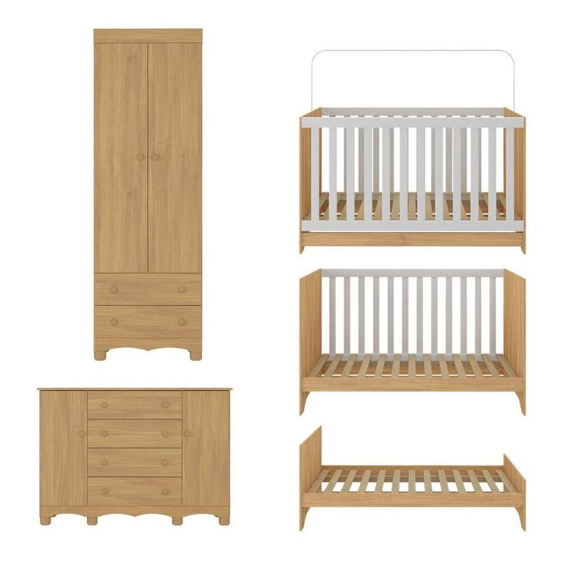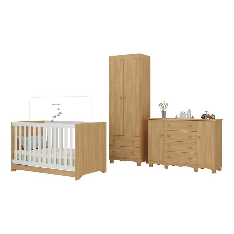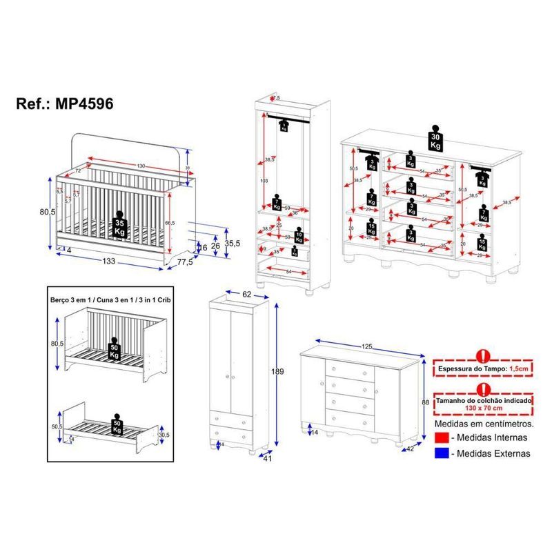 Quarto De Bebê Completo Com Berço Americano 3 Em 1 Dengo Multimóveis MP4596 MadeiradoO Quarto de Bebê Completo com Berço Americano 3 em 1 p/Colchão 130x70cm Multimóveis MP4596 une design moderno, praticidade e um toque de afeto para tornar o cantinho do seu bebê simplesmente encantador. Cada móvel reflete cuidado e proteção, criando o espaço perfeito para o amor crescer todos os dias.Diferenciais:- 3 anos de garantia contra defeitos de fabricação e material.- Conjunto produzido em madeira de reflorestamento (MDP 12/15mm) com acabamento acetinado (cerca de 20% de brilho): sustentabilidade e durabilidade.- Berço 3 em 1 que se transforma em sofá e minicama, acompanhando o crescimento do bebê.- Lastro em madeira com 3 regulagens de altura e suporte para mosquiteiro para noites mais tranquilas e protegidas.- Berço certificado pelo INMETRO (Selo nº 0000085/2018).- Padrão americano (tamanho do colchão indicado: 130x70cm). Colchão não incluso.- Grade Soft (PVC): ecologicamente correta, com matéria-prima livre de metais pesados, atóxica e com proteção antiamarelamento.- Guarda-roupa com 2 portas e 2 gavetas: amplo espaço para organizar roupinhas e acessórios.- Cômoda com 2 portas e 4 gavetas.- Corrediças telescópicas: abertura total e silenciosa das gavetas.- Cabideiro em alumínio: permite acomodar roupas longas e curtas para que não amassem.- Puxadores em ABS delicados e práticos.- Pés em polipropileno e rodapés usinados em MDF: visual elegante e estabilidade para o guarda-roupa e a cômoda.- Sistema antitombamento no guarda-roupa e cômoda: proporciona segurança para o bebê e tranquilidade aos pais.Conteúdo da Embalagem:1 (um) Berço1 (um) Guarda-roupa1 (uma) CômodaManual de MontagemKit FerragemDimensões do Produto Montado:Berço - Altura: 80,5cm | Largura: 133cm | Profundidade: 77,5cmGuarda-roupa - Altura: 189cm | Largura: 62cm | Profundidade: 41cmCômoda - Altura: 88cm | Largura: 125cm | Profundidade: 42cm*Você pode consultar as medidas detalhadas na imagem técnica do produto.Observações Importantes:*As cores dos produtos podem sofrer variações de tonalidade de acordo com as configurações do seu dispositivo.*Aqui na Loja Multimóveis, você pode concluir sua compra facilmente com toda segurança. A entrega é garantida e você está em 1° lugar.*Imagens meramente ilustrativas (decoração não inclusa).*Os produtos serão entregues desmontados e não disponibilizamos o serviço de montagem. Acabamento: Finish Foil/Pintura UV | Tonalidade: Branco | Material: MDP | Referência do Modelo: MP4596 | Coleção: Dengo | Sistema de Montagem: O produto acompanha manual de montagem juntamente com kit ferragem. O produto será entregue desmontado e não disponibilizamos o serviço de montagem. | Instruções de Cuidado: Limpar com pano seco para retirar o pó. Não utilizar produtos químicos ou abrasivos. Não aplicar lustra móveis. | Produto Composto por: 1 berço, 1 guarda-roupa, 1 cômoda, manual de montagem e kit ferragem. | Altura Montado: 189 | Largura Montado: 62 | Profundidade Montado: 41 | Tamanho (L x A x P): 62 x 189 x 41 | Peso do Produto: 102 | Corrediça: Telescópica | Inclui Berço: Sim | Acompanha Colchão: Não | Inclui Guarda-Roupa: Sim | Inclui Gaveteiro: Sim | Material do Puxador: ABS | Quantidade de Portas: 4 | Quantidade de Gavetas: 6 | Quantidade de Puxadores: 16 | RBN: 17352335011 | Quantidade de Pés: 10 | Quantidade de Peças: 3 | Material dos Pés: Polipropileno | Produto: Conjunto de Quarto | Portátil: Não | Registro INMETRO: 0000085/2018 | Fabricante: Multimóveis | Regulamentado pelo INMETRO: Sim | Garantia do Fabricante: 3 | Requer Montagem: Sim | Tempo de Garantia: 3 meses | Descrição do Tamanho: (L x A x P): 62 x 189 x 41 cm | Tipo de cama: Berço | Marca: Multimóveis | Tamanho da cama: Berço | Quantidade de criados mudos: 0 | Tipo de madeira: N/A | Comprimento da cama: 77,5 cm | Altura da cama: 80,5 cm | É Kit de fábrica: Sim | Estilo: Moderno | Largura da cama: 133 cm | Idade recomendada: 0-24 meses | Idade: Bebê | Quantidade de caixas de embalagem: 05 | Destaque 1: Produzido em MDP com acabamento acetinado: durabilidade e resistência. | Destaque 2: Berço 3 em 1: transforma-se em sofá e minicama, acompanhando as fases da criança. | Destaque 3: Guarda-roupa com 2 portas, 2 gavetas e cabideiro de alumínio. | Destaque 4: Cômoda com 2 portas e 4 gavetas: amplo espaço interno. | Destaque 5: Corrediças telescópicas: abertura total e silenciosa das gavetas. | Baterias são necessárias?: Não | Certificação de teste externa: 0000085/2018 | Is Fragile: Não | Dimensões do item P x L x A: length#value=41;length#unit=centimeters;width#value=62;width#unit=centimeters;height#value=189;height#unit=centimeters | Quantidade de itens: 1 | Peso do item: unit=kilograms;value=102 | Número da peça: MP4596.697 | Inclui manual de montagem: Sim | Tipo de Garantia: Garantia do Fabricante | Montagem: Necessita Montagem | País de Origem: Brasil | Palavras-chave: berco com colchao, berco pequeno bercos moveis, berco que vira cama, berco mini cama, berco, quarto completo de bebe, berco e guarda roupa, kit quarto bebe, quarto de bebe completo, quarto de bebe, quarto bebe, jogo de quarto bebe, quarto completo bebe, kit quarto bebe moveis, quarto infantil bebe, kit quarto de bebe, berço e guarda roupa | Inclui cômoda trocador: Não | Cor: Madeirado
