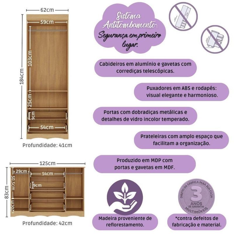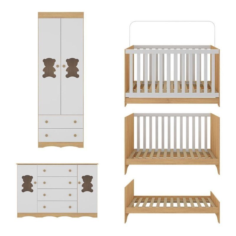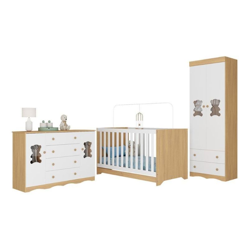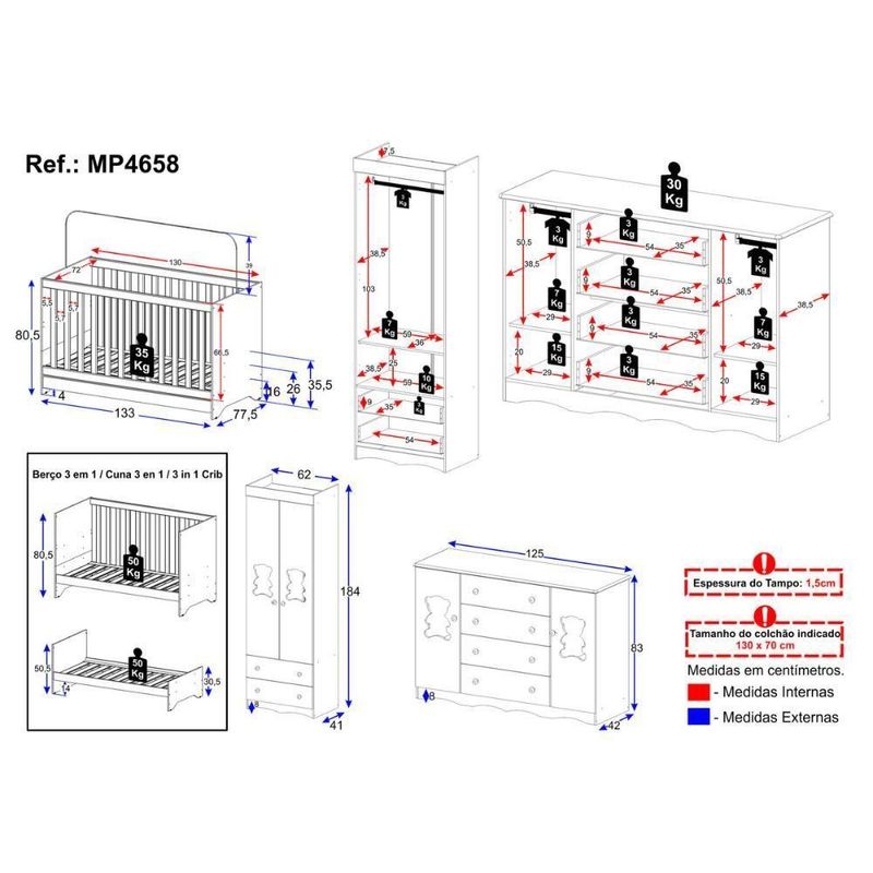 Quarto De Bebê Completo Com Berço Americano 3 Em 1 Doçura Multimóveis MP4658 Madeirado/brancoO Quarto de Bebê Completo com Berço Americano 3 em 1 p/Colchão 130x70cm Multimóveis MP4658 é cheio de carinho e significado! Pensado para acolher com amor, o conjunto transforma o cantinho do bebê em um espaço especial para os primeiros sorrisos e momentos inesquecíveis em família.Diferenciais:- 3 anos de garantia contra defeitos de fabricação e material.- Conjunto produzido em madeira de reflorestamento (MDP 12/15mm) com acabamento acetinado (cerca de 20% de brilho): sustentabilidade e durabilidade.- Berço 3 em 1 que se transforma em sofá e minicama, acompanhando o crescimento do bebê.- Lastro em madeira com 3 regulagens de altura e suporte para mosquiteiro para noites mais tranquilas e protegidas.- Berço certificado pelo INMETRO (Selo nº 0000085/2018).- Padrão americano (tamanho do colchão indicado: 130x70cm). Colchão não incluso.- Grade Soft (PVC): ecologicamente correta, com matéria-prima livre de metais pesados, atóxica e com proteção antiamarelamento.- Guarda-roupa com 2 portas e 2 gavetas: amplo espaço para organizar roupinhas e acessórios.- Cômoda com 2 portas e 4 gavetas.- Portas e gavetas produzidas em MDF.- Detalhes de vidro incolor temperado 3mm nas portas: toque charmoso que permite visualizar o interior dos móveis.- Corrediças telescópicas: abertura total e silenciosa das gavetas.- Cabideiro em alumínio: permite acomodar roupas longas e curtas para que não amassem.- Puxadores em ABS delicados e práticos.- Rodapés usinados em MDF: visual elegante para o guarda-roupa e a cômoda.- Sistema antitombamento no guarda-roupa e cômoda: proporciona segurança para o bebê e tranquilidade aos pais.Conteúdo da Embalagem:1 (um) Berço1 (um) Guarda-roupa1 (uma) CômodaManual de MontagemKit FerragemDimensões do Produto Montado:Berço - Altura: 80,5cm | Largura: 133cm | Profundidade: 77,5cmGuarda-roupa - Altura: 184cm | Largura: 62cm | Profundidade: 41cmCômoda - Altura: 83cm | Largura: 125cm | Profundidade: 42cm*Você pode consultar as medidas detalhadas na imagem técnica do produto.Observações Importantes:*As cores dos produtos podem sofrer variações de tonalidade de acordo com as configurações do seu dispositivo.*Aqui na Loja Multimóveis, você pode concluir sua compra facilmente com toda segurança. A entrega é garantida e você está em 1° lugar.*Imagens meramente ilustrativas (decoração não inclusa).*Os produtos serão entregues desmontados e não disponibilizamos o serviço de montagem. Acabamento: Finish Foil/Pintura UV | Tonalidade: Branco | Material: MDP | Referência do Modelo: MP4658 | Coleção: Doçura | Sistema de Montagem: O produto acompanha manual de montagem juntamente com kit ferragem. O produto será entregue desmontado e não disponibilizamos o serviço de montagem. | Instruções de Cuidado: Limpar com pano seco para retirar o pó. Não utilizar produtos químicos ou abrasivos. Não aplicar lustra móveis. | Produto Composto por: 1 berço, 1 guarda-roupa, 1 cômoda, manual de montagem e kit ferragem. | Altura Montado: 184 | Largura Montado: 62 | Profundidade Montado: 41 | Tamanho (L x A x P): 62 x 184 x 41 | Peso do Produto: 102 | Corrediça: Telescópica | Inclui Berço: Sim | Acompanha Colchão: Não | Inclui Guarda-Roupa: Sim | Inclui Gaveteiro: Sim | Material do Puxador: ABS | Quantidade de Portas: 4 | Quantidade de Gavetas: 6 | Quantidade de Puxadores: 16 | RBN: 17352335011 | Quantidade de Pés: 0 | Quantidade de Peças: 3 | Material dos Pés: N/A | Produto: Conjunto de Quarto | Portátil: Não | Registro INMETRO: 0000085/2018 | Fabricante: Multimóveis | Regulamentado pelo INMETRO: Sim | Garantia do Fabricante: 3 | Requer Montagem: Sim | Altura do Produto com Embalagem: 47 | Largura do Produto com Embalagem: 82 | Comprimento do Produto com Embalagem: 188 | Peso do Produto com Embalagem: 102 | Nome do Produto no Fornecedor: | Estado de Origem: RS | Produto precisa de Montagem?: Sim, sugerimos a contratação do nosso serviço de montagem (para os CEPs em que o serviço está disponível) ou de algum profissional experiente de sua preferência | Tempo de Garantia: 3 meses | Descrição do Tamanho: (L x A x P): 62 x 184 x 41 cm | Tipo de cama: Berço | Marca: Multimóveis | Tamanho da cama: Berço | Quantidade de criados mudos: 0 | Tipo de madeira: N/A | Comprimento da cama: 77,5 cm | Altura da cama: 80,5 cm | É Kit de fábrica: Sim | Estilo: Moderno | Largura da cama: 133 cm | Idade recomendada: 0-24 meses | Idade: Bebê | Quantidade de caixas de embalagem: 05 | Destaque 1: Produzido em MDP/MDF com acabamento acetinado: durabilidade e resistência. | Destaque 2: Berço 3 em 1: transforma-se em sofá e minicama, acompanhando as fases da criança. | Destaque 3: Guarda-roupa com 2 portas, 2 gavetas e cabideiro de alumínio. | Destaque 4: Cômoda com 2 portas e 4 gavetas: amplo espaço interno. | Destaque 5: Corrediças telescópicas: abertura total e silenciosa das gavetas. | Baterias são necessárias?: Não | Certificação de teste externa: 0000085/2018 | Is Fragile: Não | Dimensões do item P x L x A: length#value=41;length#unit=centimeters;width#value=62;width#unit=centimeters;height#value=184;height#unit=centimeters | Quantidade de itens: 1 | Peso do item: unit=kilograms;value=102 | Número da peça: MP4658.697 | Inclui manual de montagem: Sim | Tipo de Garantia: Garantia do Fabricante | Montagem: Necessita Montagem | País de Origem: Brasil | Palavras-chave: berco com colchao, berco pequeno bercos moveis, berco que vira cama, berco mini cama, berco, quarto completo de bebe, berco e guarda roupa, kit quarto bebe, quarto de bebe completo, quarto de bebe, quarto bebe, jogo de quarto bebe, quarto completo bebe, kit quarto bebe moveis, quarto infantil bebe, kit quarto de bebe, berço e guarda roupa | Inclui cômoda trocador: Não | Cor: Madeirado/Branco