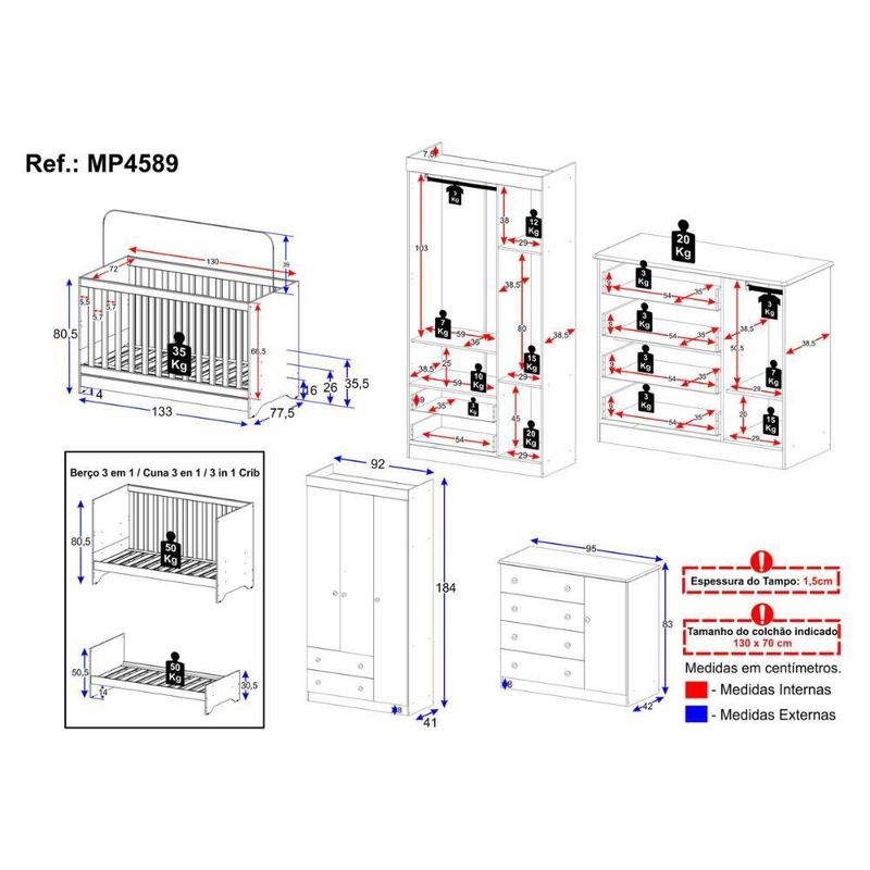 Quarto De Bebê Completo Com Berço Americano 3 Em 1 Encanto Multimóveis MP4589 Madeirado/off WhiteMais do que um conjunto de móveis, o Quarto de Bebê Completo com Berço Americano 3 em 1 p/Colchão 130x70cm Multimóveis MP4589 é um abraço em forma de ambiente. Feito para garantir segurança, conforto e funcionalidade, ele envolve o bebê com o carinho que todo início de vida merece.Diferenciais:- 3 anos de garantia contra defeitos de fabricação e material.- Conjunto produzido em madeira de reflorestamento (MDP 12/15mm) com acabamento acetinado (cerca de 20% de brilho): sustentabilidade e durabilidade.- Berço 3 em 1 que se transforma em sofá e minicama, acompanhando o crescimento do bebê.- Lastro em madeira com 3 regulagens de altura e suporte para mosquiteiro para noites mais tranquilas e protegidas.- Berço certificado pelo INMETRO (Selo nº 0000085/2018).- Padrão americano (tamanho do colchão indicado: 130x70cm). Colchão não incluso.- Grade Soft (PVC): ecologicamente correta, com matéria-prima livre de metais pesados, atóxica e com proteção antiamarelamento.- Guarda-roupa com 3 portas e 2 gavetas: amplo espaço para organizar roupinhas e acessórios.- Cômoda com 1 porta e 4 gavetas.- Corrediças telescópicas: abertura total e silenciosa das gavetas.- Cabideiro em alumínio: permite acomodar roupas longas e curtas para que não amassem.- Puxadores em ABS delicados e práticos.- Rodapés: visual elegante para o guarda-roupa e a cômoda.- Sistema antitombamento no guarda-roupa e cômoda: proporciona segurança para o bebê e tranquilidade aos pais.Conteúdo da Embalagem:1 (um) Berço1 (um) Guarda-roupa1 (uma) CômodaManual de MontagemKit FerragemDimensões do Produto Montado:Berço - Altura: 80,5cm | Largura: 133cm | Profundidade: 77,5cmGuarda-roupa - Altura: 184cm | Largura: 92cm | Profundidade: 41cmCômoda - Altura: 83cm | Largura: 95cm | Profundidade: 42cm*Você pode consultar as medidas detalhadas na imagem técnica do produto.Observações Importantes:*As cores dos produtos podem sofrer variações de tonalidade de acordo com as configurações do seu dispositivo.*Aqui na Loja Multimóveis, você pode concluir sua compra facilmente com toda segurança. A entrega é garantida e você está em 1° lugar.*Imagens meramente ilustrativas (decoração não inclusa).*Os produtos serão entregues desmontados e não disponibilizamos o serviço de montagem. Acabamento: Finish Foil/Pintura UV | Tonalidade: Branco | Material: MDP | Referência do Modelo: MP4589 | Coleção: Encanto | Sistema de Montagem: O produto acompanha manual de montagem juntamente com kit ferragem. O produto será entregue desmontado e não disponibilizamos o serviço de montagem. | Instruções de Cuidado: Limpar com pano seco para retirar o pó. Não utilizar produtos químicos ou abrasivos. Não aplicar lustra móveis. | Produto Composto por: 1 berço, 1 guarda-roupa, 1 cômoda, manual de montagem e kit ferragem. | Altura Montado: 184 | Largura Montado: 92 | Profundidade Montado: 41 | Tamanho (L x A x P): 92 x 184 x 41 | Peso do Produto: 107 | Corrediça: Telescópica | Inclui Berço: Sim | Acompanha Colchão: Não | Inclui Guarda-Roupa: Sim | Inclui Gaveteiro: Sim | Material do Puxador: ABS | Quantidade de Portas: 4 | Quantidade de Gavetas: 6 | Quantidade de Puxadores: 16 | RBN: 17352335011 | Quantidade de Pés: 0 | Quantidade de Peças: 3 | Material dos Pés: N/A | Produto: Conjunto de Quarto | Portátil: Não | Registro INMETRO: 0000085/2018 | Fabricante: Multimóveis | Regulamentado pelo INMETRO: Sim | Garantia do Fabricante: 3 | Requer Montagem: Sim | Tempo de Garantia: 3 meses | Descrição do Tamanho: (L x A x P): 92 x 184 x 41 cm | Tipo de cama: Berço | Marca: Multimóveis | Tamanho da cama: Berço | Quantidade de criados mudos: 0 | Tipo de madeira: N/A | Comprimento da cama: 77,5 cm | Altura da cama: 80,5 cm | É Kit de fábrica: Sim | Estilo: Moderno | Largura da cama: 133 cm | Idade recomendada: 0-24 meses | Idade: Bebê | Quantidade de caixas de embalagem: 05 | Destaque 1: Produzido em MDP com acabamento acetinado: durabilidade e resistência. | Destaque 2: Berço 3 em 1: transforma-se em sofá e minicama, acompanhando as fases da criança. | Destaque 3: Guarda-roupa com 3 portas, 2 gavetas e cabideiro de alumínio. | Destaque 4: Cômoda com 1 porta e 4 gavetas: amplo espaço interno. | Destaque 5: Corrediças telescópicas: abertura total e silenciosa das gavetas. | Baterias são necessárias?: Não | Certificação de teste externa: 0000085/2018 | Is Fragile: Não | Dimensões do item P x L x A: length#value=41;length#unit=centimeters;width#value=92;width#unit=centimeters;height#value=184;height#unit=centimeters | Quantidade de itens: 1 | Peso do item: unit=kilograms;value=107 | Número da peça: MP4589.697 | Inclui manual de montagem: Sim | Tipo de Garantia: Garantia do Fabricante | Montagem: Necessita Montagem | País de Origem: Brasil | Palavras-chave: berco com colchao, berco pequeno bercos moveis, berco que vira cama, berco mini cama, berco, quarto completo de bebe, berco e guarda roupa, kit quarto bebe, quarto de bebe completo, quarto de bebe, quarto bebe, jogo de quarto bebe, quarto completo bebe, kit quarto bebe moveis, quarto infantil bebe, kit quarto de bebe, berço e guarda roupa | Inclui cômoda trocador: Não | Cor: Madeirado/Off White