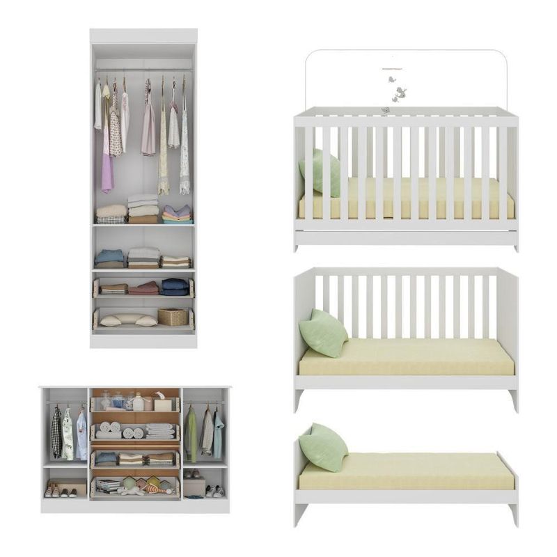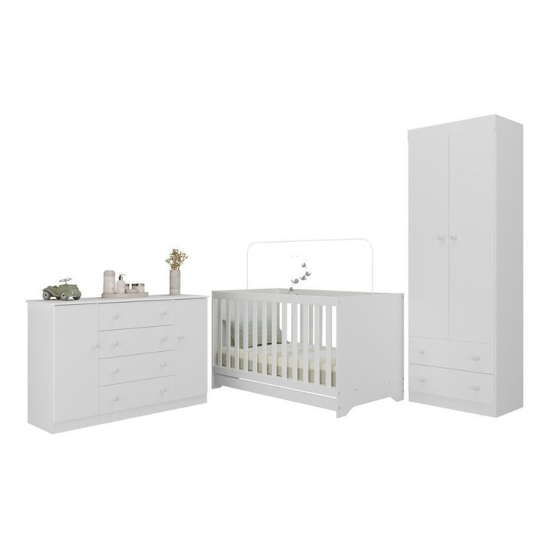 Quarto De Bebê Completo Com Berço Americano 3 Em 1 Encanto Multimóveis MP4593 BrancoO Quarto de Bebê Completo com Berço Americano 3 em 1 p/Colchão 130x70cm Multimóveis MP4593 une design moderno, praticidade e um toque de afeto para tornar o cantinho do seu bebê simplesmente encantador. Cada móvel reflete cuidado e proteção, criando o espaço perfeito para o amor crescer todos os dias.Diferenciais:- 3 anos de garantia contra defeitos de fabricação e material.- Conjunto produzido em madeira de reflorestamento (MDP 12/15mm) com acabamento acetinado (cerca de 20% de brilho): sustentabilidade e durabilidade.- Berço 3 em 1 que se transforma em sofá e minicama, acompanhando o crescimento do bebê.- Lastro em madeira com 3 regulagens de altura e suporte para mosquiteiro para noites mais tranquilas e protegidas.- Berço certificado pelo INMETRO (Selo nº 0000085/2018).- Padrão americano (tamanho do colchão indicado: 130x70cm). Colchão não incluso.- Grade Soft (PVC): ecologicamente correta, com matéria-prima livre de metais pesados, atóxica e com proteção antiamarelamento.- Guarda-roupa com 2 portas e 2 gavetas: amplo espaço para organizar roupinhas e acessórios.- Cômoda com 2 portas e 4 gavetas.- Corrediças telescópicas: abertura total e silenciosa das gavetas.- Cabideiro em alumínio: permite acomodar roupas longas e curtas para que não amassem.- Puxadores em ABS delicados e práticos.- Rodapés: visual elegante para o guarda-roupa e a cômoda.- Sistema antitombamento no guarda-roupa e cômoda: proporciona segurança para o bebê e tranquilidade aos pais.Conteúdo da Embalagem:1 (um) Berço1 (um) Guarda-roupa1 (uma) CômodaManual de MontagemKit FerragemDimensões do Produto Montado:Berço - Altura: 80,5cm | Largura: 133cm | Profundidade: 77,5cmGuarda-roupa - Altura: 184cm | Largura: 62cm | Profundidade: 41cmCômoda - Altura: 83cm | Largura: 125cm | Profundidade: 42cm*Você pode consultar as medidas detalhadas na imagem técnica do produto.Observações Importantes:*As cores dos produtos podem sofrer variações de tonalidade de acordo com as configurações do seu dispositivo.*Aqui na Loja Multimóveis, você pode concluir sua compra facilmente com toda segurança. A entrega é garantida e você está em 1° lugar.*Imagens meramente ilustrativas (decoração não inclusa).*Os produtos serão entregues desmontados e não disponibilizamos o serviço de montagem. Acabamento: Finish Foil/Pintura UV | Tonalidade: Branco | Material: MDP | Referência do Modelo: MP4593 | Coleção: Encanto | Sistema de Montagem: O produto acompanha manual de montagem juntamente com kit ferragem. O produto será entregue desmontado e não disponibilizamos o serviço de montagem. | Instruções de Cuidado: Limpar com pano seco para retirar o pó. Não utilizar produtos químicos ou abrasivos. Não aplicar lustra móveis. | Produto Composto por: 1 berço, 1 guarda-roupa, 1 cômoda, manual de montagem e kit ferragem. | Altura Montado: 184 | Largura Montado: 62 | Profundidade Montado: 41 | Tamanho (L x A x P): 62 x 184 x 41 | Peso do Produto: 102 | Corrediça: Telescópica | Inclui Berço: Sim | Acompanha Colchão: Não | Inclui Guarda-Roupa: Sim | Inclui Gaveteiro: Sim | Material do Puxador: ABS | Quantidade de Portas: 4 | Quantidade de Gavetas: 6 | Quantidade de Puxadores: 16 | RBN: 17352335011 | Quantidade de Pés: 0 | Quantidade de Peças: 3 | Material dos Pés: N/A | Produto: Conjunto de Quarto | Portátil: Não | Registro INMETRO: 0000085/2018 | Fabricante: Multimóveis | Regulamentado pelo INMETRO: Sim | Garantia do Fabricante: 3 | Requer Montagem: Sim | Tempo de Garantia: 3 meses | Descrição do Tamanho: (L x A x P): 62 x 184 x 41 cm | Tipo de cama: Berço | Marca: Multimóveis | Tamanho da cama: Berço | Quantidade de criados mudos: 0 | Tipo de madeira: N/A | Comprimento da cama: 77,5 cm | Altura da cama: 80,5 cm | É Kit de fábrica: Sim | Estilo: Moderno | Largura da cama: 133 cm | Idade recomendada: 0-24 meses | Idade: Bebê | Quantidade de caixas de embalagem: 05 | Destaque 1: Produzido em MDP com acabamento acetinado: durabilidade e resistência. | Destaque 2: Berço 3 em 1: transforma-se em sofá e minicama, acompanhando as fases da criança. | Destaque 3: Guarda-roupa com 2 portas, 2 gavetas e cabideiro de alumínio. | Destaque 4: Cômoda com 2 portas e 4 gavetas: amplo espaço interno. | Destaque 5: Corrediças telescópicas: abertura total e silenciosa das gavetas. | Baterias são necessárias?: Não | Certificação de teste externa: 0000085/2018 | Is Fragile: Não | Dimensões do item P x L x A: length#value=41;length#unit=centimeters;width#value=62;width#unit=centimeters;height#value=184;height#unit=centimeters | Quantidade de itens: 1 | Peso do item: unit=kilograms;value=102 | Número da peça: MP4593.697 | Inclui manual de montagem: Sim | Tipo de Garantia: Garantia do Fabricante | Montagem: Necessita Montagem | País de Origem: Brasil | Palavras-chave: berco com colchao, berco pequeno bercos moveis, berco que vira cama, berco mini cama, berco, quarto completo de bebe, berco e guarda roupa, kit quarto bebe, quarto de bebe completo, quarto de bebe, quarto bebe, jogo de quarto bebe, quarto completo bebe, kit quarto bebe moveis, quarto infantil bebe, kit quarto de bebe, berço e guarda roupa | Inclui cômoda trocador: Não | Cor: Branco