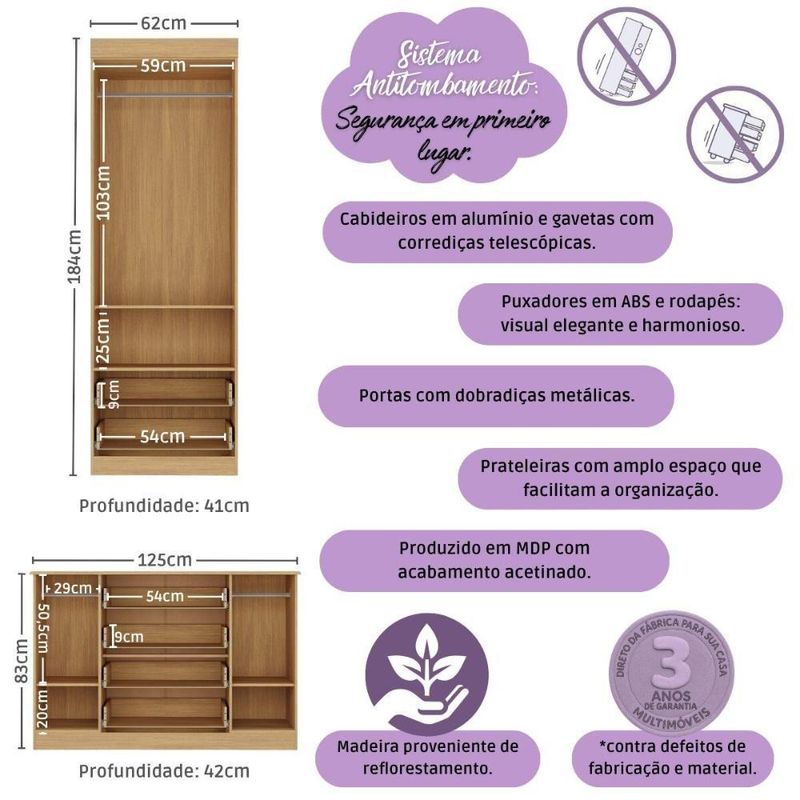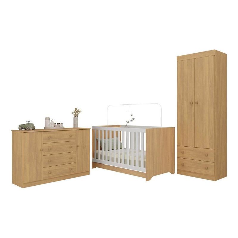 Quarto De Bebê Completo Com Berço Americano 3 Em 1 Encanto Multimóveis MP4593 MadeiradoO Quarto de Bebê Completo com Berço Americano 3 em 1 p/Colchão 130x70cm Multimóveis MP4593 une design moderno, praticidade e um toque de afeto para tornar o cantinho do seu bebê simplesmente encantador. Cada móvel reflete cuidado e proteção, criando o espaço perfeito para o amor crescer todos os dias.Diferenciais:- 3 anos de garantia contra defeitos de fabricação e material.- Conjunto produzido em madeira de reflorestamento (MDP 12/15mm) com acabamento acetinado (cerca de 20% de brilho): sustentabilidade e durabilidade.- Berço 3 em 1 que se transforma em sofá e minicama, acompanhando o crescimento do bebê.- Lastro em madeira com 3 regulagens de altura e suporte para mosquiteiro para noites mais tranquilas e protegidas.- Berço certificado pelo INMETRO (Selo nº 0000085/2018).- Padrão americano (tamanho do colchão indicado: 130x70cm). Colchão não incluso.- Grade Soft (PVC): ecologicamente correta, com matéria-prima livre de metais pesados, atóxica e com proteção antiamarelamento.- Guarda-roupa com 2 portas e 2 gavetas: amplo espaço para organizar roupinhas e acessórios.- Cômoda com 2 portas e 4 gavetas.- Corrediças telescópicas: abertura total e silenciosa das gavetas.- Cabideiro em alumínio: permite acomodar roupas longas e curtas para que não amassem.- Puxadores em ABS delicados e práticos.- Rodapés: visual elegante para o guarda-roupa e a cômoda.- Sistema antitombamento no guarda-roupa e cômoda: proporciona segurança para o bebê e tranquilidade aos pais.Conteúdo da Embalagem:1 (um) Berço1 (um) Guarda-roupa1 (uma) CômodaManual de MontagemKit FerragemDimensões do Produto Montado:Berço - Altura: 80,5cm | Largura: 133cm | Profundidade: 77,5cmGuarda-roupa - Altura: 184cm | Largura: 62cm | Profundidade: 41cmCômoda - Altura: 83cm | Largura: 125cm | Profundidade: 42cm*Você pode consultar as medidas detalhadas na imagem técnica do produto.Observações Importantes:*As cores dos produtos podem sofrer variações de tonalidade de acordo com as configurações do seu dispositivo.*Aqui na Loja Multimóveis, você pode concluir sua compra facilmente com toda segurança. A entrega é garantida e você está em 1° lugar.*Imagens meramente ilustrativas (decoração não inclusa).*Os produtos serão entregues desmontados e não disponibilizamos o serviço de montagem. Acabamento: Finish Foil/Pintura UV | Tonalidade: Branco | Material: MDP | Referência do Modelo: MP4593 | Coleção: Encanto | Sistema de Montagem: O produto acompanha manual de montagem juntamente com kit ferragem. O produto será entregue desmontado e não disponibilizamos o serviço de montagem. | Instruções de Cuidado: Limpar com pano seco para retirar o pó. Não utilizar produtos químicos ou abrasivos. Não aplicar lustra móveis. | Produto Composto por: 1 berço, 1 guarda-roupa, 1 cômoda, manual de montagem e kit ferragem. | Altura Montado: 184 | Largura Montado: 62 | Profundidade Montado: 41 | Tamanho (L x A x P): 62 x 184 x 41 | Peso do Produto: 102 | Corrediça: Telescópica | Inclui Berço: Sim | Acompanha Colchão: Não | Inclui Guarda-Roupa: Sim | Inclui Gaveteiro: Sim | Material do Puxador: ABS | Quantidade de Portas: 4 | Quantidade de Gavetas: 6 | Quantidade de Puxadores: 16 | RBN: 17352335011 | Quantidade de Pés: 0 | Quantidade de Peças: 3 | Material dos Pés: N/A | Produto: Conjunto de Quarto | Portátil: Não | Registro INMETRO: 0000085/2018 | Fabricante: Multimóveis | Regulamentado pelo INMETRO: Sim | Garantia do Fabricante: 3 | Requer Montagem: Sim | Tempo de Garantia: 3 meses | Descrição do Tamanho: (L x A x P): 62 x 184 x 41 cm | Tipo de cama: Berço | Marca: Multimóveis | Tamanho da cama: Berço | Quantidade de criados mudos: 0 | Tipo de madeira: N/A | Comprimento da cama: 77,5 cm | Altura da cama: 80,5 cm | É Kit de fábrica: Sim | Estilo: Moderno | Largura da cama: 133 cm | Idade recomendada: 0-24 meses | Idade: Bebê | Quantidade de caixas de embalagem: 05 | Destaque 1: Produzido em MDP com acabamento acetinado: durabilidade e resistência. | Destaque 2: Berço 3 em 1: transforma-se em sofá e minicama, acompanhando as fases da criança. | Destaque 3: Guarda-roupa com 2 portas, 2 gavetas e cabideiro de alumínio. | Destaque 4: Cômoda com 2 portas e 4 gavetas: amplo espaço interno. | Destaque 5: Corrediças telescópicas: abertura total e silenciosa das gavetas. | Baterias são necessárias?: Não | Certificação de teste externa: 0000085/2018 | Is Fragile: Não | Dimensões do item P x L x A: length#value=41;length#unit=centimeters;width#value=62;width#unit=centimeters;height#value=184;height#unit=centimeters | Quantidade de itens: 1 | Peso do item: unit=kilograms;value=102 | Número da peça: MP4593.697 | Inclui manual de montagem: Sim | Tipo de Garantia: Garantia do Fabricante | Montagem: Necessita Montagem | País de Origem: Brasil | Palavras-chave: berco com colchao, berco pequeno bercos moveis, berco que vira cama, berco mini cama, berco, quarto completo de bebe, berco e guarda roupa, kit quarto bebe, quarto de bebe completo, quarto de bebe, quarto bebe, jogo de quarto bebe, quarto completo bebe, kit quarto bebe moveis, quarto infantil bebe, kit quarto de bebe, berço e guarda roupa | Inclui cômoda trocador: Não | Cor: Madeirado