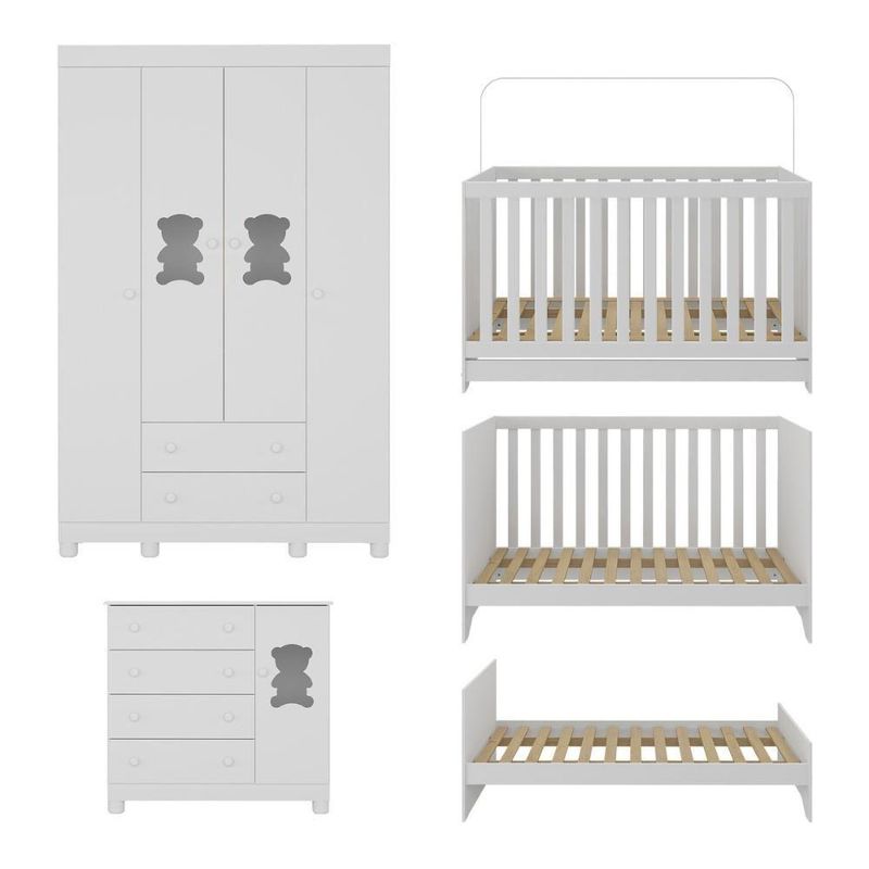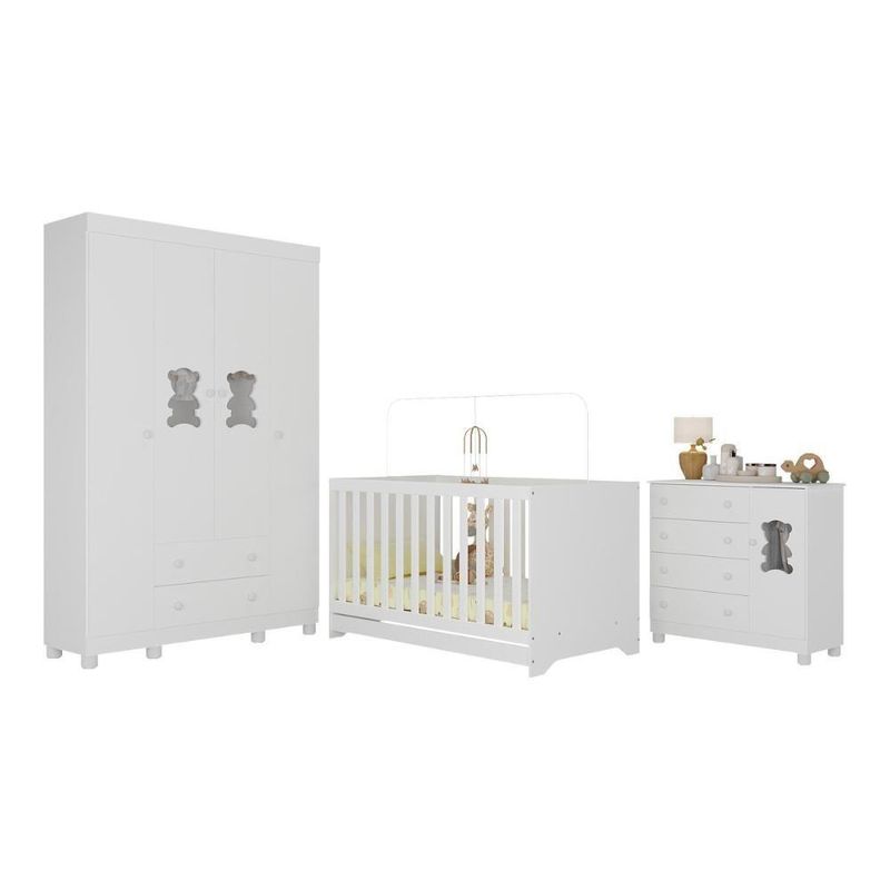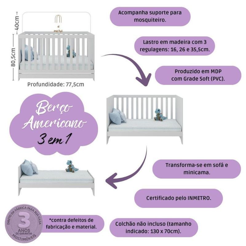 Quarto De Bebê Completo Com Berço Americano 3 Em 1 Fofura Multimóveis MP4645 BrancoCada detalhe do Quarto de Bebê Completo com Berço Americano 3 em 1 p/Colchão 130x70cm Multimóveis MP4645 foi criado para acolher o bebê com carinho. O design delicado e o visual encantador tornam o ambiente um verdadeiro abraço — ideal para viver os momentos mais doces da infância.Diferenciais:- 3 anos de garantia contra defeitos de fabricação e material.- Conjunto produzido em madeira de reflorestamento (MDP 12/15mm) com acabamento acetinado (cerca de 20% de brilho): sustentabilidade e durabilidade.- Berço 3 em 1 que se transforma em sofá e minicama, acompanhando o crescimento do bebê.- Lastro em madeira com 3 regulagens de altura e suporte para mosquiteiro para noites mais tranquilas e protegidas.- Berço certificado pelo INMETRO (Selo nº 0000085/2018).- Padrão americano (tamanho do colchão indicado: 130x70cm). Colchão não incluso.- Grade Soft (PVC): ecologicamente correta, com matéria-prima livre de metais pesados, atóxica e com proteção antiamarelamento.- Guarda-roupa com 4 portas e 2 gavetas: amplo espaço para organizar roupinhas e acessórios.- Cômoda com 1 porta e 4 gavetas.- Portas e gavetas produzidas em MDF.- Detalhes de vidro incolor temperado 3mm nas portas: toque charmoso que permite visualizar o interior dos móveis.- Corrediças telescópicas: abertura total e silenciosa das gavetas.- Cabideiro em alumínio: permite acomodar roupas longas e curtas para que não amassem.- Puxadores em ABS delicados e práticos.- Pés em polipropileno e rodapés: visual elegante e estabilidade para o guarda-roupa e a cômoda.- Sistema antitombamento no guarda-roupa e cômoda: proporciona segurança para o bebê e tranquilidade aos pais.Conteúdo da Embalagem:1 (um) Berço1 (um) Guarda-roupa1 (uma) CômodaManual de MontagemKit FerragemDimensões do Produto Montado:Berço - Altura: 80,5cm | Largura: 133cm | Profundidade: 77,5cmGuarda-roupa - Altura: 189cm | Largura: 122cm | Profundidade: 41cmCômoda - Altura: 88cm | Largura: 95cm | Profundidade: 42cm*Você pode consultar as medidas detalhadas na imagem técnica do produto.Observações Importantes:*As cores dos produtos podem sofrer variações de tonalidade de acordo com as configurações do seu dispositivo.*Aqui na Loja Multimóveis, você pode concluir sua compra facilmente com toda segurança. A entrega é garantida e você está em 1° lugar.*Imagens meramente ilustrativas (decoração não inclusa).*Os produtos serão entregues desmontados e não disponibilizamos o serviço de montagem. Acabamento: Finish Foil/Pintura UV | Tonalidade: Branco | Material: MDP | Referência do Modelo: MP4645 | Coleção: Fofura | Sistema de Montagem: O produto acompanha manual de montagem juntamente com kit ferragem. O produto será entregue desmontado e não disponibilizamos o serviço de montagem. | Instruções de Cuidado: Limpar com pano seco para retirar o pó. Não utilizar produtos químicos ou abrasivos. Não aplicar lustra móveis. | Produto Composto por: 1 berço, 1 guarda-roupa, 1 cômoda, manual de montagem e kit ferragem. | Altura Montado: 189 | Largura Montado: 122 | Profundidade Montado: 41 | Tamanho (L x A x P): 122 x 189 x 41 | Peso do Produto: 125 | Corrediça: Telescópica | Inclui Berço: Sim | Acompanha Colchão: Não | Inclui Guarda-Roupa: Sim | Inclui Gaveteiro: Sim | Material do Puxador: ABS | Quantidade de Portas: 5 | Quantidade de Gavetas: 6 | Quantidade de Puxadores: 17 | RBN: 17352335011 | Quantidade de Pés: 13 | Quantidade de Peças: 3 | Material dos Pés: Polipropileno | Produto: Conjunto de Quarto | Portátil: Não | Registro INMETRO: 0000085/2018 | Fabricante: Multimóveis | Regulamentado pelo INMETRO: Sim | Garantia do Fabricante: 3 | Requer Montagem: Sim | Altura do Produto com Embalagem: 54 | Largura do Produto com Embalagem: 82 | Comprimento do Produto com Embalagem: 188 | Peso do Produto com Embalagem: 125 | Nome do Produto no Fornecedor: | Estado de Origem: RS | Produto precisa de Montagem?: Sim, sugerimos a contratação do nosso serviço de montagem (para os CEPs em que o serviço está disponível) ou de algum profissional experiente de sua preferência | Tempo de Garantia: 3 meses | Descrição do Tamanho: (L x A x P): 122 x 189 x 41 cm | Tipo de cama: Berço | Marca: Multimóveis | Tamanho da cama: Berço | Quantidade de criados mudos: 0 | Tipo de madeira: N/A | Comprimento da cama: 77,5 cm | Altura da cama: 80,5 cm | É Kit de fábrica: Sim | Estilo: Moderno | Largura da cama: 133 cm | Idade recomendada: 0-24 meses | Idade: Bebê | Quantidade de caixas de embalagem: 06 | Destaque 1: Produzido em MDP/MDF com acabamento acetinado: durabilidade e resistência. | Destaque 2: Berço 3 em 1: transforma-se em sofá e minicama, acompanhando as fases da criança. | Destaque 3: Guarda-roupa com 4 portas, 2 gavetas e cabideiro de alumínio. | Destaque 4: Cômoda com 1 porta e 4 gavetas: amplo espaço interno. | Destaque 5: Corrediças telescópicas: abertura total e silenciosa das gavetas. | Baterias são necessárias?: Não | Certificação de teste externa: 0000085/2018 | Is Fragile: Não | Dimensões do item P x L x A: length#value=41;length#unit=centimeters;width#value=122;width#unit=centimeters;height#value=189;height#unit=centimeters | Quantidade de itens: 1 | Peso do item: unit=kilograms;value=125 | Número da peça: MP4645.697 | Inclui manual de montagem: Sim | Tipo de Garantia: Garantia do Fabricante | Montagem: Necessita Montagem | País de Origem: Brasil | Palavras-chave: berco com colchao, berco pequeno bercos moveis, berco que vira cama, berco mini cama, berco, quarto completo de bebe, berco e guarda roupa, kit quarto bebe, quarto de bebe completo, quarto de bebe, quarto bebe, jogo de quarto bebe, quarto completo bebe, kit quarto bebe moveis, quarto infantil bebe, kit quarto de bebe, berço e guarda roupa | Inclui cômoda trocador: Não | Cor: Branco