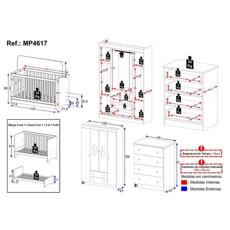 Quarto De Bebê Completo Com Berço Americano 3 Em 1 Pirulito Multimóveis MP4617 MadeiradoTudo o que o bebê precisa está aqui! O Quarto de Bebê Completo com Berço Americano 3 em 1 p/Colchão 130x70cm Multimóveis MP4617 garante funcionalidade, beleza e qualidade em um único conjunto. A solução ideal para quem quer montar um ambiente completo sem complicações.Diferenciais:- 3 anos de garantia contra defeitos de fabricação e material.- Conjunto produzido em madeira de reflorestamento (MDP 12/15mm) com acabamento acetinado (cerca de 20% de brilho): sustentabilidade e durabilidade.- Berço 3 em 1 que se transforma em sofá e minicama, acompanhando o crescimento do bebê.- Lastro em madeira com 3 regulagens de altura e suporte para mosquiteiro para noites mais tranquilas e protegidas.- Berço certificado pelo INMETRO (Selo nº 0000085/2018).- Padrão americano (tamanho do colchão indicado: 130x70cm). Colchão não incluso.- Grade Soft (PVC): ecologicamente correta, com matéria-prima livre de metais pesados, atóxica e com proteção antiamarelamento.- Guarda-roupa com 4 portas e 2 gavetas produzidas em MDF: amplo espaço para organizar roupinhas e acessórios.- Cômoda com 4 gavetas.- Detalhes de vidro incolor temperado 3mm nas portas: toque charmoso que permite visualizar o interior dos móveis.- Corrediças telescópicas: abertura total e silenciosa das gavetas.- Cabideiro em alumínio: permite acomodar roupas longas e curtas para que não amassem.- Puxadores em ABS delicados e práticos.- Rodapés: visual elegante para o guarda-roupa e a cômoda.- Sistema antitombamento no guarda-roupa e cômoda: proporciona segurança para o bebê e tranquilidade aos pais.Conteúdo da Embalagem:1 (um) Berço1 (um) Guarda-roupa1 (uma) CômodaManual de MontagemKit FerragemDimensões do Produto Montado:Berço - Altura: 80,5cm | Largura: 133cm | Profundidade: 77,5cmGuarda-roupa - Altura: 184cm | Largura: 122cm | Profundidade: 41cmCômoda - Altura: 83cm | Largura: 65cm | Profundidade: 42cm*Você pode consultar as medidas detalhadas na imagem técnica do produto.Observações Importantes:*As cores dos produtos podem sofrer variações de tonalidade de acordo com as configurações do seu dispositivo.*Aqui na Loja Multimóveis, você pode concluir sua compra facilmente com toda segurança. A entrega é garantida e você está em 1° lugar.*Imagens meramente ilustrativas (decoração não inclusa).*Os produtos serão entregues desmontados e não disponibilizamos o serviço de montagem. Acabamento: Finish Foil/Pintura UV | Tonalidade: Branco | Material: MDP/MDF | Referência do Modelo: MP4617 | Coleção: Pirulito | Sistema de Montagem: O produto acompanha manual de montagem juntamente com kit ferragem. O produto será entregue desmontado e não disponibilizamos o serviço de montagem. | Instruções de Cuidado: Limpar com pano seco para retirar o pó. Não utilizar produtos químicos ou abrasivos. Não aplicar lustra móveis. | Produto Composto por: 1 berço, 1 guarda-roupa, 1 cômoda, manual de montagem e kit ferragem. | Altura Montado: 184 | Largura Montado: 122 | Profundidade Montado: 41 | Tamanho (L x A x P): 122 x 184 x 41 | Peso do Produto: 116 | Corrediça: Telescópica | Inclui Berço: Sim | Acompanha Colchão: Não | Inclui Guarda-Roupa: Sim | Inclui Gaveteiro: Sim | Material do Puxador: ABS | Quantidade de Portas: 4 | Quantidade de Gavetas: 6 | Quantidade de Puxadores: 16 | RBN: 17352335011 | Quantidade de Pés: 0 | Quantidade de Peças: 3 | Material dos Pés: N/A | Produto: Conjunto de Quarto | Portátil: Não | Registro INMETRO: 0000085/2018 | Fabricante: Multimóveis | Regulamentado pelo INMETRO: Sim | Garantia do Fabricante: 3 | Requer Montagem: Sim | Altura do Produto com Embalagem: 54 | Largura do Produto com Embalagem: 82 | Comprimento do Produto com Embalagem: 188 | Peso do Produto com Embalagem: 116 | Nome do Produto no Fornecedor: | Estado de Origem: RS | Produto precisa de Montagem?: Sim, sugerimos a contratação do nosso serviço de montagem (para os CEPs em que o serviço está disponível) ou de algum profissional experiente de sua preferência | Tempo de Garantia: 3 meses | Descrição do Tamanho: (L x A x P): 122 x 184 x 41 cm | Tipo de cama: Berço | Marca: Multimóveis | Tamanho da cama: Berço | Quantidade de criados mudos: 0 | Tipo de madeira: N/A | Comprimento da cama: 77,5 cm | Altura da cama: 80,5 cm | É Kit de fábrica: Sim | Estilo: Moderno | Largura da cama: 133 cm | Idade recomendada: 0-24 meses | Idade: Bebê | Quantidade de caixas de embalagem: 06 | Destaque 1: Produzido em MDP/MDF com acabamento acetinado: durabilidade e resistência. | Destaque 2: Berço 3 em 1: transforma-se em sofá e minicama, acompanhando as fases da criança. | Destaque 3: Guarda-roupa com 4 portas, 2 gavetas e cabideiro de alumínio. | Destaque 4: Cômoda com 4 gavetas: amplo espaço interno. | Destaque 5: Corrediças telescópicas: abertura total e silenciosa das gavetas. | Baterias são necessárias?: Não | Certificação de teste externa: 0000085/2018 | Is Fragile: Não | Dimensões do item P x L x A: length#value=41;length#unit=centimeters;width#value=122;width#unit=centimeters;height#value=184;height#unit=centimeters | Quantidade de itens: 1 | Peso do item: unit=kilograms;value=116 | Número da peça: MP4617.499 | Inclui manual de montagem: Sim | Tipo de Garantia: Garantia do Fabricante | Montagem: Necessita Montagem | País de Origem: Brasil | Palavras-chave: berco com colchao, berco pequeno bercos moveis, berco que vira cama, berco mini cama, berco, quarto completo de bebe, berco e guarda roupa, kit quarto bebe, quarto de bebe completo, quarto de bebe, quarto bebe, jogo de quarto bebe, quarto completo bebe, kit quarto bebe moveis, quarto infantil bebe, kit quarto de bebe, berço e guarda roupa | Inclui cômoda trocador: Não | Cor: Madeirado