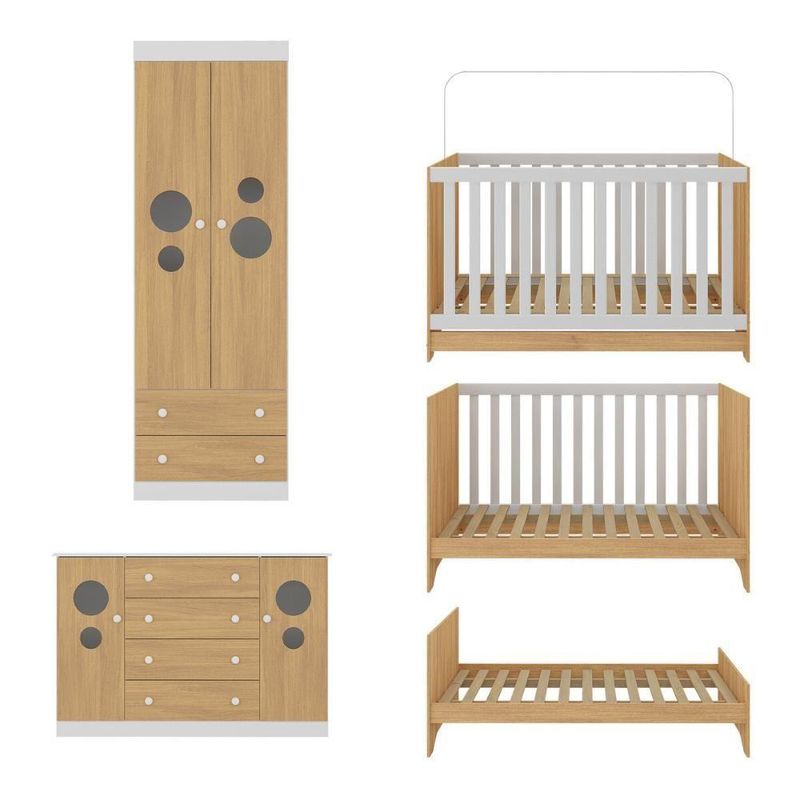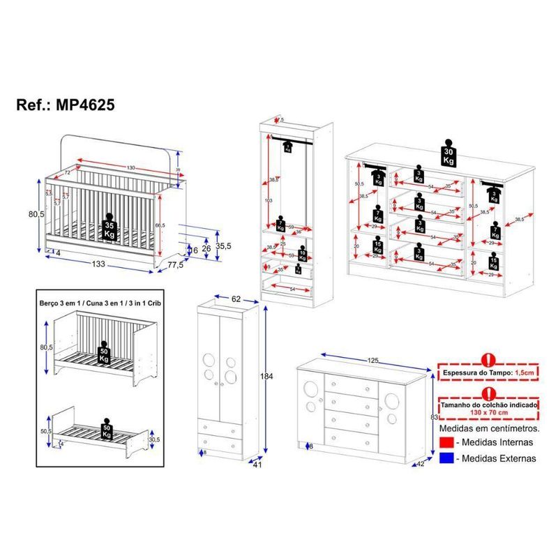 Quarto De Bebê Completo Com Berço Americano 3 Em 1 Pirulito Multimóveis MP4625 Branco/madeiradoSe você procura um ambiente sofisticado e funcional para seu filho, o Quarto de Bebê Completo com Berço Americano 3 em 1 p/Colchão 130x70cm Multimóveis MP4625 é a escolha certa. Com design atual e acabamento impecável, ele transforma o espaço do bebê em um ambiente moderno, seguro e cheio de estilo.Diferenciais:- 3 anos de garantia contra defeitos de fabricação e material.- Conjunto produzido em madeira de reflorestamento (MDP 12/15mm) com acabamento acetinado (cerca de 20% de brilho): sustentabilidade e durabilidade.- Berço 3 em 1 que se transforma em sofá e minicama, acompanhando o crescimento do bebê.- Lastro em madeira com 3 regulagens de altura e suporte para mosquiteiro para noites mais tranquilas e protegidas.- Berço certificado pelo INMETRO (Selo nº 0000085/2018).- Padrão americano (tamanho do colchão indicado: 130x70cm). Colchão não incluso.- Grade Soft (PVC): ecologicamente correta, com matéria-prima livre de metais pesados, atóxica e com proteção antiamarelamento.- Guarda-roupa com 2 portas e 2 gavetas: amplo espaço para organizar roupinhas e acessórios.- Cômoda com 2 portas e 4 gavetas.- Portas e gavetas produzidas em MDF.- Detalhes de vidro incolor temperado 3mm nas portas: toque charmoso que permite visualizar o interior dos móveis.- Corrediças telescópicas: abertura total e silenciosa das gavetas.- Cabideiro em alumínio: permite acomodar roupas longas e curtas para que não amassem.- Puxadores em ABS delicados e práticos.- Rodapés: visual elegante para o guarda-roupa e a cômoda.- Sistema antitombamento no guarda-roupa e cômoda: proporciona segurança para o bebê e tranquilidade aos pais.Conteúdo da Embalagem:1 (um) Berço1 (um) Guarda-roupa1 (uma) CômodaManual de MontagemKit FerragemDimensões do Produto Montado:Berço - Altura: 80,5cm | Largura: 133cm | Profundidade: 77,5cmGuarda-roupa - Altura: 184cm | Largura: 62cm | Profundidade: 41cmCômoda - Altura: 83cm | Largura: 125cm | Profundidade: 42cm*Você pode consultar as medidas detalhadas na imagem técnica do produto.Observações Importantes:*As cores dos produtos podem sofrer variações de tonalidade de acordo com as configurações do seu dispositivo.*Aqui na Loja Multimóveis, você pode concluir sua compra facilmente com toda segurança. A entrega é garantida e você está em 1° lugar.*Imagens meramente ilustrativas (decoração não inclusa).*Os produtos serão entregues desmontados e não disponibilizamos o serviço de montagem. Acabamento: Finish Foil/Pintura UV | Tonalidade: Branco | Material: MDP/MDF | Referência do Modelo: MP4625 | Coleção: Pirulito | Sistema de Montagem: O produto acompanha manual de montagem juntamente com kit ferragem. O produto será entregue desmontado e não disponibilizamos o serviço de montagem. | Instruções de Cuidado: Limpar com pano seco para retirar o pó. Não utilizar produtos químicos ou abrasivos. Não aplicar lustra móveis. | Produto Composto por: 1 berço, 1 guarda-roupa, 1 cômoda, manual de montagem e kit ferragem. | Altura Montado: 184 | Largura Montado: 62 | Profundidade Montado: 41 | Tamanho (L x A x P): 62 x 184 x 41 | Peso do Produto: 102 | Corrediça: Telescópica | Inclui Berço: Sim | Acompanha Colchão: Não | Inclui Guarda-Roupa: Sim | Inclui Gaveteiro: Sim | Material do Puxador: ABS | Quantidade de Portas: 4 | Quantidade de Gavetas: 6 | Quantidade de Puxadores: 16 | RBN: 17352335011 | Quantidade de Pés: 0 | Quantidade de Peças: 3 | Material dos Pés: N/A | Produto: Conjunto de Quarto | Portátil: Não | Registro INMETRO: 0000085/2018 | Fabricante: Multimóveis | Regulamentado pelo INMETRO: Sim | Garantia do Fabricante: 3 | Requer Montagem: Sim | Altura do Produto com Embalagem: 46 | Largura do Produto com Embalagem: 82 | Comprimento do Produto com Embalagem: 188 | Peso do Produto com Embalagem: 102 | Nome do Produto no Fornecedor: | Estado de Origem: RS | Produto precisa de Montagem?: Sim, sugerimos a contratação do nosso serviço de montagem (para os CEPs em que o serviço está disponível) ou de algum profissional experiente de sua preferência | Tempo de Garantia: 3 meses | Descrição do Tamanho: (L x A x P): 62 x 184 x 41 cm | Tipo de cama: Berço | Marca: Multimóveis | Tamanho da cama: Berço | Quantidade de criados mudos: 0 | Tipo de madeira: N/A | Comprimento da cama: 77,5 cm | Altura da cama: 80,5 cm | É Kit de fábrica: Sim | Estilo: Moderno | Largura da cama: 133 cm | Idade recomendada: 0-24 meses | Idade: Bebê | Quantidade de caixas de embalagem: 05 | Destaque 1: Produzido em MDP/MDF com acabamento acetinado: durabilidade e resistência. | Destaque 2: Berço 3 em 1: transforma-se em sofá e minicama, acompanhando as fases da criança. | Destaque 3: Guarda-roupa com 2 portas, 2 gavetas e cabideiro de alumínio. | Destaque 4: Cômoda com 2 portas e 4 gavetas: amplo espaço interno. | Destaque 5: Corrediças telescópicas: abertura total e silenciosa das gavetas. | Baterias são necessárias?: Não | Certificação de teste externa: 0000085/2018 | Is Fragile: Não | Dimensões do item P x L x A: length#value=41;length#unit=centimeters;width#value=62;width#unit=centimeters;height#value=184;height#unit=centimeters | Quantidade de itens: 1 | Peso do item: unit=kilograms;value=102 | Número da peça: MP4625.499 | Inclui manual de montagem: Sim | Tipo de Garantia: Garantia do Fabricante | Montagem: Necessita Montagem | País de Origem: Brasil | Palavras-chave: berco com colchao, berco pequeno bercos moveis, berco que vira cama, berco mini cama, berco, quarto completo de bebe, berco e guarda roupa, kit quarto bebe, quarto de bebe completo, quarto de bebe, quarto bebe, jogo de quarto bebe, quarto completo bebe, kit quarto bebe moveis, quarto infantil bebe, kit quarto de bebe, berço e guarda roupa | Inclui cômoda trocador: Não | Cor: Branco/Madeirado