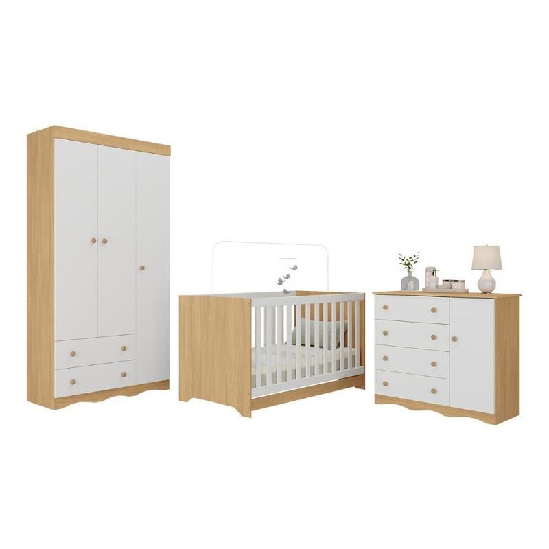 Quarto De Bebê Completo Com Berço Americano 3 Em 1 Realeza Multimóveis MP4591 Madeirado/brancoMais do que um conjunto de móveis, o Quarto de Bebê Completo com Berço Americano 3 em 1 p/Colchão 130x70cm Multimóveis MP4591 é um abraço em forma de ambiente. Feito para garantir segurança, conforto e funcionalidade, ele envolve o bebê com o carinho que todo início de vida merece.Diferenciais:- 3 anos de garantia contra defeitos de fabricação e material.- Conjunto produzido em madeira de reflorestamento (MDP 12/15mm) com acabamento acetinado (cerca de 20% de brilho): sustentabilidade e durabilidade.- Berço 3 em 1 que se transforma em sofá e minicama, acompanhando o crescimento do bebê.- Lastro em madeira com 3 regulagens de altura e suporte para mosquiteiro para noites mais tranquilas e protegidas.- Berço certificado pelo INMETRO (Selo nº 0000085/2018).- Padrão americano (tamanho do colchão indicado: 130x70cm). Colchão não incluso.- Grade Soft (PVC): ecologicamente correta, com matéria-prima livre de metais pesados, atóxica e com proteção antiamarelamento.- Guarda-roupa com 3 portas e 2 gavetas: amplo espaço para organizar roupinhas e acessórios.- Cômoda com 1 porta e 4 gavetas.- Corrediças telescópicas: abertura total e silenciosa das gavetas.- Cabideiro em alumínio: permite acomodar roupas longas e curtas para que não amassem.- Puxadores em ABS delicados e práticos.- Rodapés usinados em MDF: visual elegante para o guarda-roupa e a cômoda.- Sistema antitombamento no guarda-roupa e cômoda: proporciona segurança para o bebê e tranquilidade aos pais.Conteúdo da Embalagem:1 (um) Berço1 (um) Guarda-roupa1 (uma) CômodaManual de MontagemKit FerragemDimensões do Produto Montado:Berço - Altura: 80,5cm | Largura: 133cm | Profundidade: 77,5cmGuarda-roupa - Altura: 184cm | Largura: 92cm | Profundidade: 41cmCômoda - Altura: 83cm | Largura: 95cm | Profundidade: 42cm*Você pode consultar as medidas detalhadas na imagem técnica do produto.Observações Importantes:*As cores dos produtos podem sofrer variações de tonalidade de acordo com as configurações do seu dispositivo.*Aqui na Loja Multimóveis, você pode concluir sua compra facilmente com toda segurança. A entrega é garantida e você está em 1° lugar.*Imagens meramente ilustrativas (decoração não inclusa).*Os produtos serão entregues desmontados e não disponibilizamos o serviço de montagem. Acabamento: Finish Foil/Pintura UV | Tonalidade: Branco | Material: MDP | Referência do Modelo: MP4591 | Coleção: Realeza | Sistema de Montagem: O produto acompanha manual de montagem juntamente com kit ferragem. O produto será entregue desmontado e não disponibilizamos o serviço de montagem. | Instruções de Cuidado: Limpar com pano seco para retirar o pó. Não utilizar produtos químicos ou abrasivos. Não aplicar lustra móveis. | Produto Composto por: 1 berço, 1 guarda-roupa, 1 cômoda, manual de montagem e kit ferragem. | Altura Montado: 184 | Largura Montado: 92 | Profundidade Montado: 41 | Tamanho (L x A x P): 92 x 184 x 41 | Peso do Produto: 107 | Corrediça: Telescópica | Inclui Berço: Sim | Acompanha Colchão: Não | Inclui Guarda-Roupa: Sim | Inclui Gaveteiro: Sim | Material do Puxador: ABS | Quantidade de Portas: 4 | Quantidade de Gavetas: 6 | Quantidade de Puxadores: 16 | RBN: 17352335011 | Quantidade de Pés: 0 | Quantidade de Peças: 3 | Material dos Pés: N/A | Produto: Conjunto de Quarto | Portátil: Não | Registro INMETRO: 0000085/2018 | Fabricante: Multimóveis | Regulamentado pelo INMETRO: Sim | Garantia do Fabricante: 3 | Requer Montagem: Sim | Tempo de Garantia: 3 meses | Descrição do Tamanho: (L x A x P): 92 x 184 x 41 cm | Tipo de cama: Berço | Marca: Multimóveis | Tamanho da cama: Berço | Quantidade de criados mudos: 0 | Tipo de madeira: N/A | Comprimento da cama: 77,5 cm | Altura da cama: 80,5 cm | É Kit de fábrica: Sim | Estilo: Moderno | Largura da cama: 133 cm | Idade recomendada: 0-24 meses | Idade: Bebê | Quantidade de caixas de embalagem: 05 | Destaque 1: Produzido em MDP com acabamento acetinado: durabilidade e resistência. | Destaque 2: Berço 3 em 1: transforma-se em sofá e minicama, acompanhando as fases da criança. | Destaque 3: Guarda-roupa com 3 portas, 2 gavetas e cabideiro de alumínio. | Destaque 4: Cômoda com 1 porta e 4 gavetas: amplo espaço interno. | Destaque 5: Corrediças telescópicas: abertura total e silenciosa das gavetas. | Baterias são necessárias?: Não | Certificação de teste externa: 0000085/2018 | Is Fragile: Não | Dimensões do item P x L x A: length#value=41;length#unit=centimeters;width#value=92;width#unit=centimeters;height#value=184;height#unit=centimeters | Quantidade de itens: 1 | Peso do item: unit=kilograms;value=107 | Número da peça: MP4591.697 | Inclui manual de montagem: Sim | Tipo de Garantia: Garantia do Fabricante | Montagem: Necessita Montagem | País de Origem: Brasil | Palavras-chave: berco com colchao, berco pequeno bercos moveis, berco que vira cama, berco mini cama, berco, quarto completo de bebe, berco e guarda roupa, kit quarto bebe, quarto de bebe completo, quarto de bebe, quarto bebe, jogo de quarto bebe, quarto completo bebe, kit quarto bebe moveis, quarto infantil bebe, kit quarto de bebe, berço e guarda roupa | Inclui cômoda trocador: Não | Cor: Madeirado/Branco
