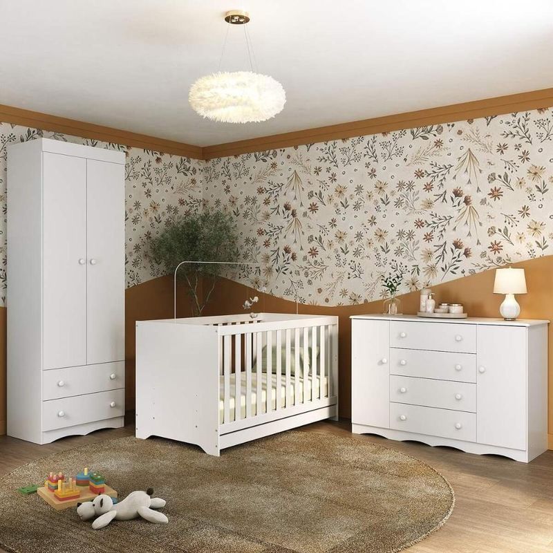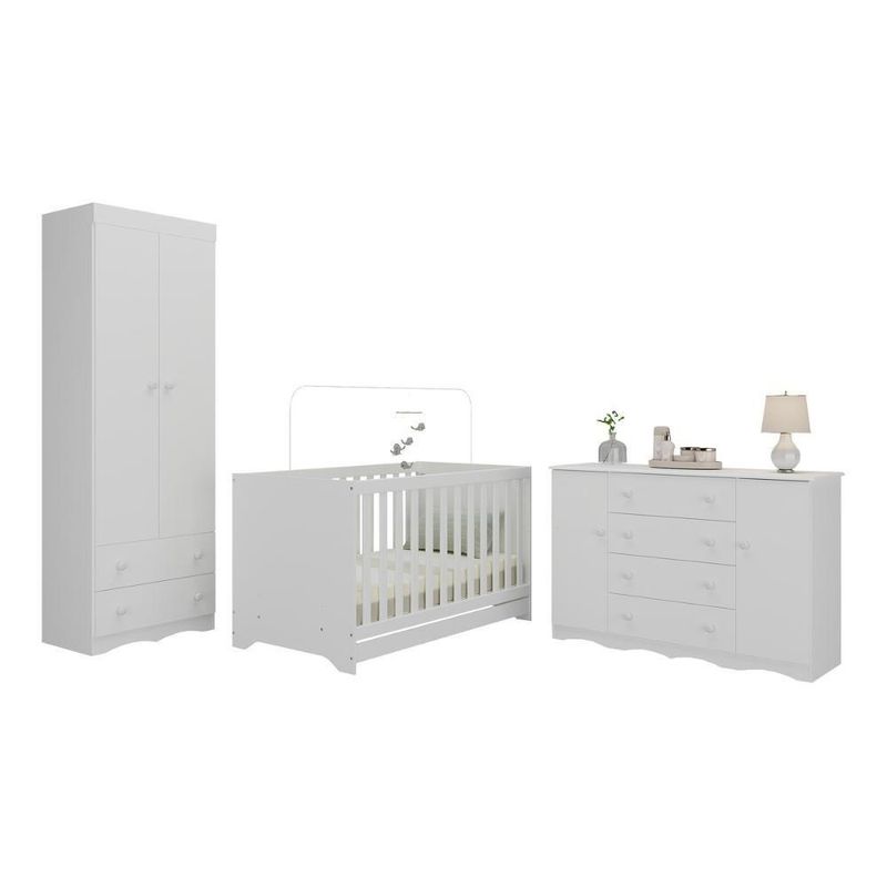 Quarto De Bebê Completo Com Berço Americano 3 Em 1 Realeza Multimóveis MP4595 BrancoO Quarto de Bebê Completo com Berço Americano 3 em 1 p/Colchão 130x70cm Multimóveis MP4595 une design moderno, praticidade e um toque de afeto para tornar o cantinho do seu bebê simplesmente encantador. Cada móvel reflete cuidado e proteção, criando o espaço perfeito para o amor crescer todos os dias.Diferenciais:- 3 anos de garantia contra defeitos de fabricação e material.- Conjunto produzido em madeira de reflorestamento (MDP 12/15mm) com acabamento acetinado (cerca de 20% de brilho): sustentabilidade e durabilidade.- Berço 3 em 1 que se transforma em sofá e minicama, acompanhando o crescimento do bebê.- Lastro em madeira com 3 regulagens de altura e suporte para mosquiteiro para noites mais tranquilas e protegidas.- Berço certificado pelo INMETRO (Selo nº 0000085/2018).- Padrão americano (tamanho do colchão indicado: 130x70cm). Colchão não incluso.- Grade Soft (PVC): ecologicamente correta, com matéria-prima livre de metais pesados, atóxica e com proteção antiamarelamento.- Guarda-roupa com 2 portas e 2 gavetas: amplo espaço para organizar roupinhas e acessórios.- Cômoda com 2 portas e 4 gavetas.- Corrediças telescópicas: abertura total e silenciosa das gavetas.- Cabideiro em alumínio: permite acomodar roupas longas e curtas para que não amassem.- Puxadores em ABS delicados e práticos.- Rodapés usinados em MDF: visual elegante para o guarda-roupa e a cômoda.- Sistema antitombamento no guarda-roupa e cômoda: proporciona segurança para o bebê e tranquilidade aos pais.Conteúdo da Embalagem:1 (um) Berço1 (um) Guarda-roupa1 (uma) CômodaManual de MontagemKit FerragemDimensões do Produto Montado:Berço - Altura: 80,5cm | Largura: 133cm | Profundidade: 77,5cmGuarda-roupa - Altura: 184cm | Largura: 62cm | Profundidade: 41cmCômoda - Altura: 83cm | Largura: 125cm | Profundidade: 42cm*Você pode consultar as medidas detalhadas na imagem técnica do produto.Observações Importantes:*As cores dos produtos podem sofrer variações de tonalidade de acordo com as configurações do seu dispositivo.*Aqui na Loja Multimóveis, você pode concluir sua compra facilmente com toda segurança. A entrega é garantida e você está em 1° lugar.*Imagens meramente ilustrativas (decoração não inclusa).*Os produtos serão entregues desmontados e não disponibilizamos o serviço de montagem. Acabamento: Finish Foil/Pintura UV | Tonalidade: Branco | Material: MDP | Referência do Modelo: MP4595 | Coleção: Realeza | Sistema de Montagem: O produto acompanha manual de montagem juntamente com kit ferragem. O produto será entregue desmontado e não disponibilizamos o serviço de montagem. | Instruções de Cuidado: Limpar com pano seco para retirar o pó. Não utilizar produtos químicos ou abrasivos. Não aplicar lustra móveis. | Produto Composto por: 1 berço, 1 guarda-roupa, 1 cômoda, manual de montagem e kit ferragem. | Altura Montado: 184 | Largura Montado: 62 | Profundidade Montado: 41 | Tamanho (L x A x P): 62 x 184 x 41 | Peso do Produto: 102 | Corrediça: Telescópica | Inclui Berço: Sim | Acompanha Colchão: Não | Inclui Guarda-Roupa: Sim | Inclui Gaveteiro: Sim | Material do Puxador: ABS | Quantidade de Portas: 4 | Quantidade de Gavetas: 6 | Quantidade de Puxadores: 16 | RBN: 17352335011 | Quantidade de Pés: 0 | Quantidade de Peças: 3 | Material dos Pés: N/A | Produto: Conjunto de Quarto | Portátil: Não | Registro INMETRO: 0000085/2018 | Fabricante: Multimóveis | Regulamentado pelo INMETRO: Sim | Garantia do Fabricante: 3 | Requer Montagem: Sim | Tempo de Garantia: 3 meses | Descrição do Tamanho: (L x A x P): 62 x 184 x 41 cm | Tipo de cama: Berço | Marca: Multimóveis | Tamanho da cama: Berço | Quantidade de criados mudos: 0 | Tipo de madeira: N/A | Comprimento da cama: 77,5 cm | Altura da cama: 80,5 cm | É Kit de fábrica: Sim | Estilo: Moderno | Largura da cama: 133 cm | Idade recomendada: 0-24 meses | Idade: Bebê | Quantidade de caixas de embalagem: 05 | Destaque 1: Produzido em MDP com acabamento acetinado: durabilidade e resistência. | Destaque 2: Berço 3 em 1: transforma-se em sofá e minicama, acompanhando as fases da criança. | Destaque 3: Guarda-roupa com 2 portas, 2 gavetas e cabideiro de alumínio. | Destaque 4: Cômoda com 2 portas e 4 gavetas: amplo espaço interno. | Destaque 5: Corrediças telescópicas: abertura total e silenciosa das gavetas. | Baterias são necessárias?: Não | Certificação de teste externa: 0000085/2018 | Is Fragile: Não | Dimensões do item P x L x A: length#value=41;length#unit=centimeters;width#value=62;width#unit=centimeters;height#value=184;height#unit=centimeters | Quantidade de itens: 1 | Peso do item: unit=kilograms;value=102 | Número da peça: MP4595.697 | Inclui manual de montagem: Sim | Tipo de Garantia: Garantia do Fabricante | Montagem: Necessita Montagem | País de Origem: Brasil | Palavras-chave: berco com colchao, berco pequeno bercos moveis, berco que vira cama, berco mini cama, berco, quarto completo de bebe, berco e guarda roupa, kit quarto bebe, quarto de bebe completo, quarto de bebe, quarto bebe, jogo de quarto bebe, quarto completo bebe, kit quarto bebe moveis, quarto infantil bebe, kit quarto de bebe, berço e guarda roupa | Inclui cômoda trocador: Não | Cor: Branco