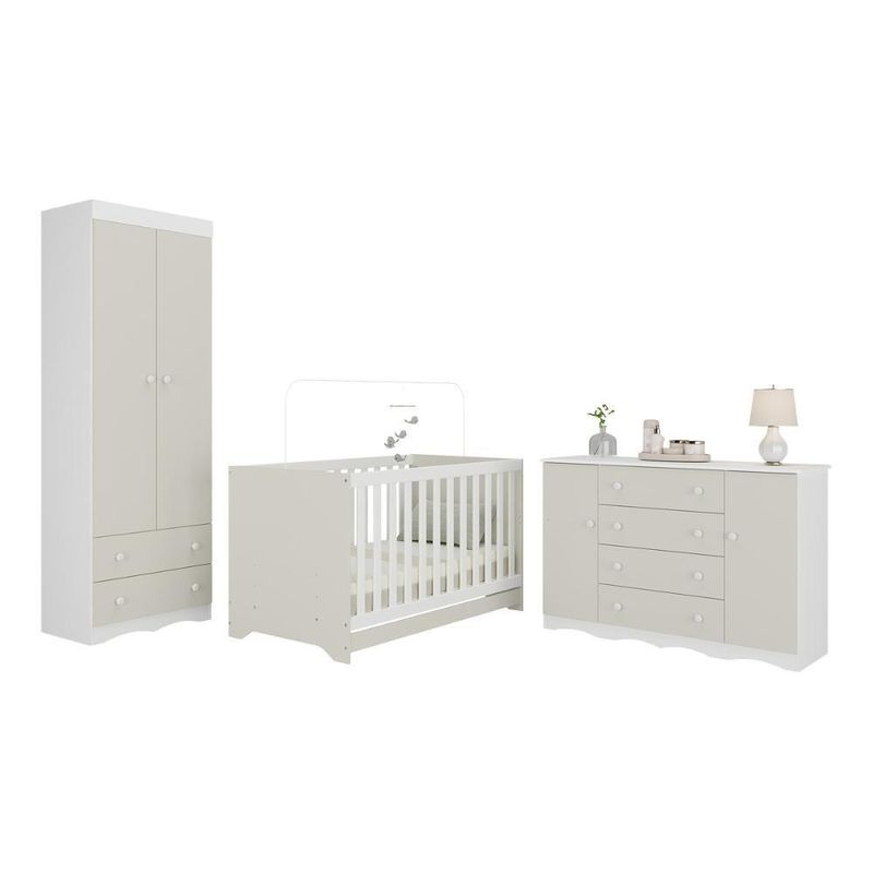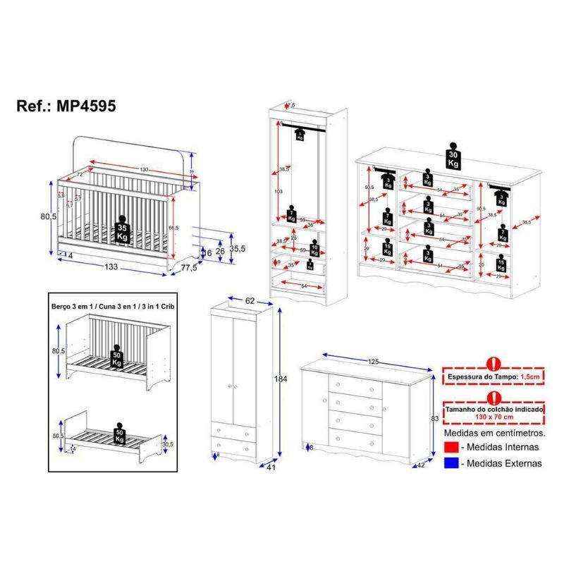Quarto De Bebê Completo Com Berço Americano 3 Em 1 Realeza Multimóveis MP4595 Branco/off WhiteO Quarto de Bebê Completo com Berço Americano 3 em 1 p/Colchão 130x70cm Multimóveis MP4595 une design moderno, praticidade e um toque de afeto para tornar o cantinho do seu bebê simplesmente encantador. Cada móvel reflete cuidado e proteção, criando o espaço perfeito para o amor crescer todos os dias.Diferenciais:- 3 anos de garantia contra defeitos de fabricação e material.- Conjunto produzido em madeira de reflorestamento (MDP 12/15mm) com acabamento acetinado (cerca de 20% de brilho): sustentabilidade e durabilidade.- Berço 3 em 1 que se transforma em sofá e minicama, acompanhando o crescimento do bebê.- Lastro em madeira com 3 regulagens de altura e suporte para mosquiteiro para noites mais tranquilas e protegidas.- Berço certificado pelo INMETRO (Selo nº 0000085/2018).- Padrão americano (tamanho do colchão indicado: 130x70cm). Colchão não incluso.- Grade Soft (PVC): ecologicamente correta, com matéria-prima livre de metais pesados, atóxica e com proteção antiamarelamento.- Guarda-roupa com 2 portas e 2 gavetas: amplo espaço para organizar roupinhas e acessórios.- Cômoda com 2 portas e 4 gavetas.- Corrediças telescópicas: abertura total e silenciosa das gavetas.- Cabideiro em alumínio: permite acomodar roupas longas e curtas para que não amassem.- Puxadores em ABS delicados e práticos.- Rodapés usinados em MDF: visual elegante para o guarda-roupa e a cômoda.- Sistema antitombamento no guarda-roupa e cômoda: proporciona segurança para o bebê e tranquilidade aos pais.Conteúdo da Embalagem:1 (um) Berço1 (um) Guarda-roupa1 (uma) CômodaManual de MontagemKit FerragemDimensões do Produto Montado:Berço - Altura: 80,5cm | Largura: 133cm | Profundidade: 77,5cmGuarda-roupa - Altura: 184cm | Largura: 62cm | Profundidade: 41cmCômoda - Altura: 83cm | Largura: 125cm | Profundidade: 42cm*Você pode consultar as medidas detalhadas na imagem técnica do produto.Observações Importantes:*As cores dos produtos podem sofrer variações de tonalidade de acordo com as configurações do seu dispositivo.*Aqui na Loja Multimóveis, você pode concluir sua compra facilmente com toda segurança. A entrega é garantida e você está em 1° lugar.*Imagens meramente ilustrativas (decoração não inclusa).*Os produtos serão entregues desmontados e não disponibilizamos o serviço de montagem. Acabamento: Finish Foil/Pintura UV | Tonalidade: Branco | Material: MDP | Referência do Modelo: MP4595 | Coleção: Realeza | Sistema de Montagem: O produto acompanha manual de montagem juntamente com kit ferragem. O produto será entregue desmontado e não disponibilizamos o serviço de montagem. | Instruções de Cuidado: Limpar com pano seco para retirar o pó. Não utilizar produtos químicos ou abrasivos. Não aplicar lustra móveis. | Produto Composto por: 1 berço, 1 guarda-roupa, 1 cômoda, manual de montagem e kit ferragem. | Altura Montado: 184 | Largura Montado: 62 | Profundidade Montado: 41 | Tamanho (L x A x P): 62 x 184 x 41 | Peso do Produto: 102 | Corrediça: Telescópica | Inclui Berço: Sim | Acompanha Colchão: Não | Inclui Guarda-Roupa: Sim | Inclui Gaveteiro: Sim | Material do Puxador: ABS | Quantidade de Portas: 4 | Quantidade de Gavetas: 6 | Quantidade de Puxadores: 16 | RBN: 17352335011 | Quantidade de Pés: 0 | Quantidade de Peças: 3 | Material dos Pés: N/A | Produto: Conjunto de Quarto | Portátil: Não | Registro INMETRO: 0000085/2018 | Fabricante: Multimóveis | Regulamentado pelo INMETRO: Sim | Garantia do Fabricante: 3 | Requer Montagem: Sim | Tempo de Garantia: 3 meses | Descrição do Tamanho: (L x A x P): 62 x 184 x 41 cm | Tipo de cama: Berço | Marca: Multimóveis | Tamanho da cama: Berço | Quantidade de criados mudos: 0 | Tipo de madeira: N/A | Comprimento da cama: 77,5 cm | Altura da cama: 80,5 cm | É Kit de fábrica: Sim | Estilo: Moderno | Largura da cama: 133 cm | Idade recomendada: 0-24 meses | Idade: Bebê | Quantidade de caixas de embalagem: 05 | Destaque 1: Produzido em MDP com acabamento acetinado: durabilidade e resistência. | Destaque 2: Berço 3 em 1: transforma-se em sofá e minicama, acompanhando as fases da criança. | Destaque 3: Guarda-roupa com 2 portas, 2 gavetas e cabideiro de alumínio. | Destaque 4: Cômoda com 2 portas e 4 gavetas: amplo espaço interno. | Destaque 5: Corrediças telescópicas: abertura total e silenciosa das gavetas. | Baterias são necessárias?: Não | Certificação de teste externa: 0000085/2018 | Is Fragile: Não | Dimensões do item P x L x A: length#value=41;length#unit=centimeters;width#value=62;width#unit=centimeters;height#value=184;height#unit=centimeters | Quantidade de itens: 1 | Peso do item: unit=kilograms;value=102 | Número da peça: MP4595.697 | Inclui manual de montagem: Sim | Tipo de Garantia: Garantia do Fabricante | Montagem: Necessita Montagem | País de Origem: Brasil | Palavras-chave: berco com colchao, berco pequeno bercos moveis, berco que vira cama, berco mini cama, berco, quarto completo de bebe, berco e guarda roupa, kit quarto bebe, quarto de bebe completo, quarto de bebe, quarto bebe, jogo de quarto bebe, quarto completo bebe, kit quarto bebe moveis, quarto infantil bebe, kit quarto de bebe, berço e guarda roupa | Inclui cômoda trocador: Não | Cor: Branco/Off White