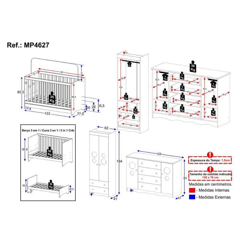 Quarto De Bebê Completo Com Berço Americano 3 Em 1 Sonho Multimóveis MP4627 MadeiradoSe você procura um ambiente sofisticado e funcional para seu filho, o Quarto de Bebê Completo com Berço Americano 3 em 1 p/Colchão 130x70cm Multimóveis MP4627 é a escolha certa. Com design atual e acabamento impecável, ele transforma o espaço do bebê em um ambiente moderno, seguro e cheio de estilo.Diferenciais:- 3 anos de garantia contra defeitos de fabricação e material.- Conjunto produzido em madeira de reflorestamento (MDP 12/15mm) com acabamento acetinado (cerca de 20% de brilho): sustentabilidade e durabilidade.- Berço 3 em 1 que se transforma em sofá e minicama, acompanhando o crescimento do bebê.- Lastro em madeira com 3 regulagens de altura e suporte para mosquiteiro para noites mais tranquilas e protegidas.- Berço certificado pelo INMETRO (Selo nº 0000085/2018).- Padrão americano (tamanho do colchão indicado: 130x70cm). Colchão não incluso.- Grade Soft (PVC): ecologicamente correta, com matéria-prima livre de metais pesados, atóxica e com proteção antiamarelamento.- Guarda-roupa com 2 portas e 2 gavetas: amplo espaço para organizar roupinhas e acessórios.- Cômoda com 2 portas e 4 gavetas.- Portas e gavetas produzidas em MDF.- Detalhes de vidro incolor temperado 3mm nas portas: toque charmoso que permite visualizar o interior dos móveis.- Corrediças telescópicas: abertura total e silenciosa das gavetas.- Cabideiro em alumínio: permite acomodar roupas longas e curtas para que não amassem.- Puxadores em ABS delicados e práticos.- Rodapés usinados em MDF: visual elegante para o guarda-roupa e a cômoda.- Sistema antitombamento no guarda-roupa e cômoda: proporciona segurança para o bebê e tranquilidade aos pais.Conteúdo da Embalagem:1 (um) Berço1 (um) Guarda-roupa1 (uma) CômodaManual de MontagemKit FerragemDimensões do Produto Montado:Berço - Altura: 80,5cm | Largura: 133cm | Profundidade: 77,5cmGuarda-roupa - Altura: 184cm | Largura: 62cm | Profundidade: 41cmCômoda - Altura: 83cm | Largura: 125cm | Profundidade: 42cm*Você pode consultar as medidas detalhadas na imagem técnica do produto.Observações Importantes:*As cores dos produtos podem sofrer variações de tonalidade de acordo com as configurações do seu dispositivo.*Aqui na Loja Multimóveis, você pode concluir sua compra facilmente com toda segurança. A entrega é garantida e você está em 1° lugar.*Imagens meramente ilustrativas (decoração não inclusa).*Os produtos serão entregues desmontados e não disponibilizamos o serviço de montagem. Acabamento: Finish Foil/Pintura UV | Tonalidade: Branco | Material: MDP/MDF | Referência do Modelo: MP4627 | Coleção: Sonho | Sistema de Montagem: O produto acompanha manual de montagem juntamente com kit ferragem. O produto será entregue desmontado e não disponibilizamos o serviço de montagem. | Instruções de Cuidado: Limpar com pano seco para retirar o pó. Não utilizar produtos químicos ou abrasivos. Não aplicar lustra móveis. | Produto Composto por: 1 berço, 1 guarda-roupa, 1 cômoda, manual de montagem e kit ferragem. | Altura Montado: 184 | Largura Montado: 62 | Profundidade Montado: 41 | Tamanho (L x A x P): 62 x 184 x 41 | Peso do Produto: 102 | Corrediça: Telescópica | Inclui Berço: Sim | Acompanha Colchão: Não | Inclui Guarda-Roupa: Sim | Inclui Gaveteiro: Sim | Material do Puxador: ABS | Quantidade de Portas: 4 | Quantidade de Gavetas: 6 | Quantidade de Puxadores: 16 | RBN: 17352335011 | Quantidade de Pés: 0 | Quantidade de Peças: 3 | Material dos Pés: N/A | Produto: Conjunto de Quarto | Portátil: Não | Registro INMETRO: 0000085/2018 | Fabricante: Multimóveis | Regulamentado pelo INMETRO: Sim | Garantia do Fabricante: 3 | Requer Montagem: Sim | Altura do Produto com Embalagem: 46 | Largura do Produto com Embalagem: 82 | Comprimento do Produto com Embalagem: 188 | Peso do Produto com Embalagem: 102 | Nome do Produto no Fornecedor: | Estado de Origem: RS | Produto precisa de Montagem?: Sim, sugerimos a contratação do nosso serviço de montagem (para os CEPs em que o serviço está disponível) ou de algum profissional experiente de sua preferência | Tempo de Garantia: 3 meses | Descrição do Tamanho: (L x A x P): 62 x 184 x 41 cm | Tipo de cama: Berço | Marca: Multimóveis | Tamanho da cama: Berço | Quantidade de criados mudos: 0 | Tipo de madeira: N/A | Comprimento da cama: 77,5 cm | Altura da cama: 80,5 cm | É Kit de fábrica: Sim | Estilo: Moderno | Largura da cama: 133 cm | Idade recomendada: 0-24 meses | Idade: Bebê | Quantidade de caixas de embalagem: 05 | Destaque 1: Produzido em MDP/MDF com acabamento acetinado: durabilidade e resistência. | Destaque 2: Berço 3 em 1: transforma-se em sofá e minicama, acompanhando as fases da criança. | Destaque 3: Guarda-roupa com 2 portas, 2 gavetas e cabideiro de alumínio. | Destaque 4: Cômoda com 2 portas e 4 gavetas: amplo espaço interno. | Destaque 5: Corrediças telescópicas: abertura total e silenciosa das gavetas. | Baterias são necessárias?: Não | Certificação de teste externa: 0000085/2018 | Is Fragile: Não | Dimensões do item P x L x A: length#value=41;length#unit=centimeters;width#value=62;width#unit=centimeters;height#value=184;height#unit=centimeters | Quantidade de itens: 1 | Peso do item: unit=kilograms;value=102 | Número da peça: MP4627.499 | Inclui manual de montagem: Sim | Tipo de Garantia: Garantia do Fabricante | Montagem: Necessita Montagem | País de Origem: Brasil | Palavras-chave: berco com colchao, berco pequeno bercos moveis, berco que vira cama, berco mini cama, berco, quarto completo de bebe, berco e guarda roupa, kit quarto bebe, quarto de bebe completo, quarto de bebe, quarto bebe, jogo de quarto bebe, quarto completo bebe, kit quarto bebe moveis, quarto infantil bebe, kit quarto de bebe, berço e guarda roupa | Inclui cômoda trocador: Não | Cor: Madeirado
