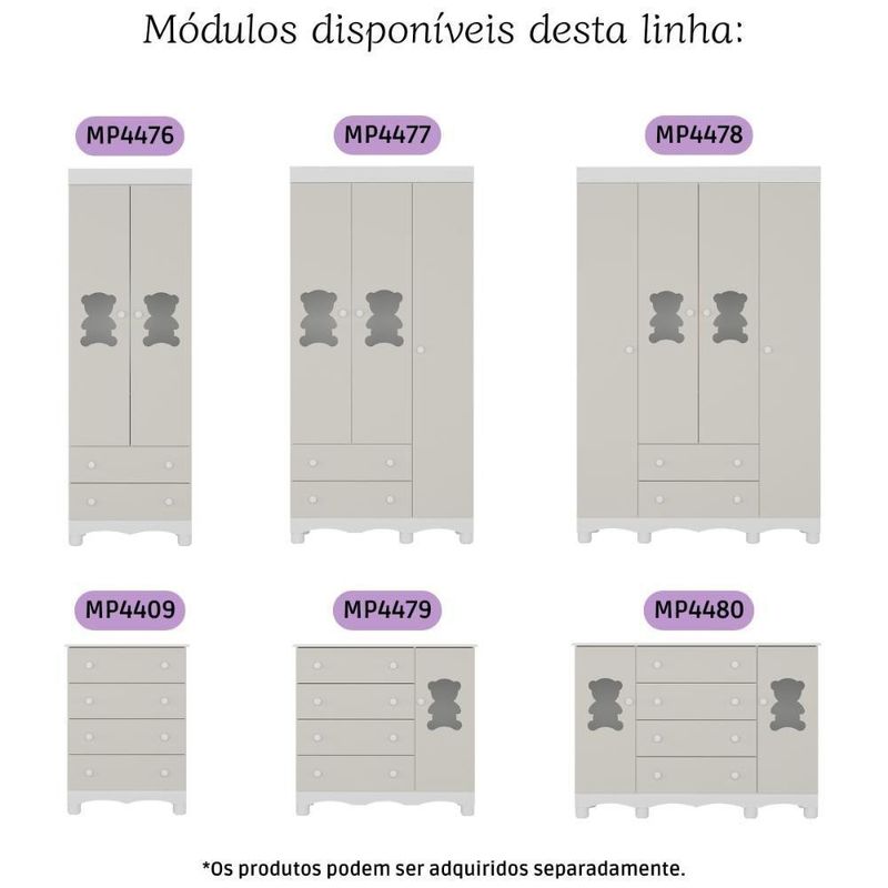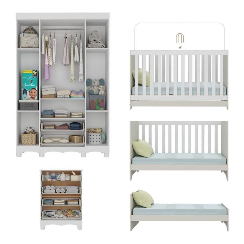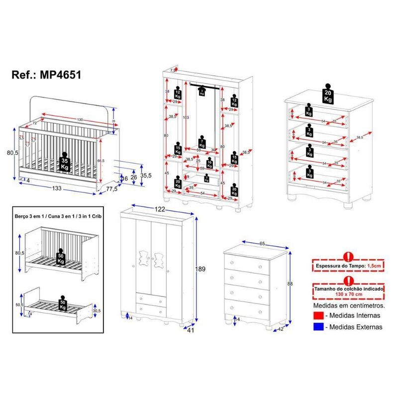 Quarto De Bebê Completo Com Berço Americano 3 Em 1 Ternura Multimóveis MP4651 Branco/off WhiteMais segurança, beleza e praticidade em um só conjunto! O Quarto de Bebê Completo com Berço Americano 3 em 1 p/Colchão 130x70cm Multimóveis MP4651 é ideal para famílias que não abrem mão de um ambiente confiável e bem planejado para o bebê — unindo durabilidade e conforto em cada detalhe.Diferenciais:- 3 anos de garantia contra defeitos de fabricação e material.- Conjunto produzido em madeira de reflorestamento (MDP 12/15mm) com acabamento acetinado (cerca de 20% de brilho): sustentabilidade e durabilidade.- Berço 3 em 1 que se transforma em sofá e minicama, acompanhando o crescimento do bebê.- Lastro em madeira com 3 regulagens de altura e suporte para mosquiteiro para noites mais tranquilas e protegidas.- Berço certificado pelo INMETRO (Selo nº 0000085/2018).- Padrão americano (tamanho do colchão indicado: 130x70cm). Colchão não incluso.- Grade Soft (PVC): ecologicamente correta, com matéria-prima livre de metais pesados, atóxica e com proteção antiamarelamento.- Guarda-roupa com 4 portas e 2 gavetas produzidas em MDF: amplo espaço para organizar roupinhas e acessórios.- Cômoda com 4 gavetas.- Detalhes de vidro incolor temperado 3mm nas portas: toque charmoso que permite visualizar o interior dos móveis.- Corrediças telescópicas: abertura total e silenciosa das gavetas.- Cabideiro em alumínio: permite acomodar roupas longas e curtas para que não amassem.- Puxadores em ABS delicados e práticos.- Pés em polipropileno e rodapés usinados em MDF: visual elegante e estabilidade para o guarda-roupa e a cômoda.- Sistema antitombamento no guarda-roupa e cômoda: proporciona segurança para o bebê e tranquilidade aos pais.Conteúdo da Embalagem:1 (um) Berço1 (um) Guarda-roupa1 (uma) CômodaManual de MontagemKit FerragemDimensões do Produto Montado:Berço - Altura: 80,5cm | Largura: 133cm | Profundidade: 77,5cmGuarda-roupa - Altura: 189cm | Largura: 122cm | Profundidade: 41cmCômoda - Altura: 88cm | Largura: 65cm | Profundidade: 42cm*Você pode consultar as medidas detalhadas na imagem técnica do produto.Observações Importantes:*As cores dos produtos podem sofrer variações de tonalidade de acordo com as configurações do seu dispositivo.*Aqui na Loja Multimóveis, você pode concluir sua compra facilmente com toda segurança. A entrega é garantida e você está em 1° lugar.*Imagens meramente ilustrativas (decoração não inclusa).*Os produtos serão entregues desmontados e não disponibilizamos o serviço de montagem. Acabamento: Finish Foil/Pintura UV | Tonalidade: Branco | Material: MDP | Referência do Modelo: MP4651 | Coleção: Ternura | Sistema de Montagem: O produto acompanha manual de montagem juntamente com kit ferragem. O produto será entregue desmontado e não disponibilizamos o serviço de montagem. | Instruções de Cuidado: Limpar com pano seco para retirar o pó. Não utilizar produtos químicos ou abrasivos. Não aplicar lustra móveis. | Produto Composto por: 1 berço, 1 guarda-roupa, 1 cômoda, manual de montagem e kit ferragem. | Altura Montado: 189 | Largura Montado: 122 | Profundidade Montado: 41 | Tamanho (L x A x P): 122 x 189 x 41 | Peso do Produto: 116 | Corrediça: Telescópica | Inclui Berço: Sim | Acompanha Colchão: Não | Inclui Guarda-Roupa: Sim | Inclui Gaveteiro: Sim | Material do Puxador: ABS | Quantidade de Portas: 4 | Quantidade de Gavetas: 6 | Quantidade de Puxadores: 16 | RBN: 17352335011 | Quantidade de Pés: 12 | Quantidade de Peças: 3 | Material dos Pés: Polipropileno | Produto: Conjunto de Quarto | Portátil: Não | Registro INMETRO: 0000085/2018 | Fabricante: Multimóveis | Regulamentado pelo INMETRO: Sim | Garantia do Fabricante: 3 | Requer Montagem: Sim | Altura do Produto com Embalagem: 54 | Largura do Produto com Embalagem: 82 | Comprimento do Produto com Embalagem: 188 | Peso do Produto com Embalagem: 116 | Nome do Produto no Fornecedor: | Estado de Origem: RS | Produto precisa de Montagem?: Sim, sugerimos a contratação do nosso serviço de montagem (para os CEPs em que o serviço está disponível) ou de algum profissional experiente de sua preferência | Tempo de Garantia: 3 meses | Descrição do Tamanho: (L x A x P): 122 x 189 x 41 cm | Tipo de cama: Berço | Marca: Multimóveis | Tamanho da cama: Berço | Quantidade de criados mudos: 0 | Tipo de madeira: N/A | Comprimento da cama: 77,5 cm | Altura da cama: 80,5 cm | É Kit de fábrica: Sim | Estilo: Moderno | Largura da cama: 133 cm | Idade recomendada: 0-24 meses | Idade: Bebê | Quantidade de caixas de embalagem: 06 | Destaque 1: Produzido em MDP/MDF com acabamento acetinado: durabilidade e resistência. | Destaque 2: Berço 3 em 1: transforma-se em sofá e minicama, acompanhando as fases da criança. | Destaque 3: Guarda-roupa com 4 portas, 2 gavetas e cabideiro de alumínio. | Destaque 4: Cômoda com 4 gavetas: amplo espaço interno. | Destaque 5: Corrediças telescópicas: abertura total e silenciosa das gavetas. | Baterias são necessárias?: Não | Certificação de teste externa: 0000085/2018 | Is Fragile: Não | Dimensões do item P x L x A: length#value=41;length#unit=centimeters;width#value=122;width#unit=centimeters;height#value=189;height#unit=centimeters | Quantidade de itens: 1 | Peso do item: unit=kilograms;value=116 | Número da peça: MP4651.697 | Inclui manual de montagem: Sim | Tipo de Garantia: Garantia do Fabricante | Montagem: Necessita Montagem | País de Origem: Brasil | Palavras-chave: berco com colchao, berco pequeno bercos moveis, berco que vira cama, berco mini cama, berco, quarto completo de bebe, berco e guarda roupa, kit quarto bebe, quarto de bebe completo, quarto de bebe, quarto bebe, jogo de quarto bebe, quarto completo bebe, kit quarto bebe moveis, quarto infantil bebe, kit quarto de bebe, berço e guarda roupa | Inclui cômoda trocador: Não | Cor: Branco/Off White