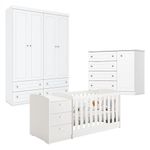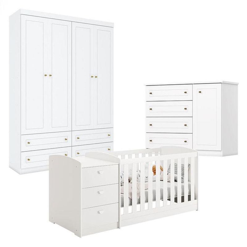 Quarto Infantil 4 Portas Mississipi E Berço Multifuncional Atlanta Branco Fosco - RellerQuarto Infantil 4 Portas Mississipi e Berço Multifuncional Atlanta Branco Fosco - RellerNa hora de decorar o quartinho do bebê escolha móveis que vão unir conforto e praticidade! Apresentamos o Berço Multifuncional Atlanta da Reller, o Guarda Roupa e a Cômoda Infantil Mississipi desenvolvido pela Henn. Berço padrão Americano, cômoda acoplada, gavetas com corrediças telescópicas e com 3 opções diferentes de montagem de mini cama podendo acompanhar o desenvolvimento da criança e utilizar por muito tempo. A cômoda conta com 4 gavetas, 1 porta com usinagem em baixo relevo, corrediças telescópicas e prateleiras internas. O Guarda Roupa Mississipi possui um design robusto, cabideiros em alumínio e puxadores em ABS na cor bronze. Confira mais detalhes abaixo e não deixe de adquirir produtos fabricados com a mais alta qualidade! Características Técnicas Berço Multifuncional Atlanta: - Pintura na cor Branco - Acabamento UV fosco - Sistema de pintura atóxica que não faz mal ao bebê - Berço padrão americano - Grade fixa - 3 opções de mini cama - Cômoda podendo ser montada em ambos os lados - Gavetas com corrediças telescópicas - Puxadores em PVC - Possui travas de segurança - Possui 3 gavetas - Utiliza colchão 130x70cm (vendido separadamente) - Lindo designDimensões:Altura: 85 cm Largura: 185 cm Profundidade: 77 cm Cômoda Infantil Mississipi: - Desenvolvido em MDP/ MDF - Frentes em MDF com usinagem em baixo relevo - Pintura na cor Branco HP - Acabamento em U.V Fosco - 1 Porta - 4 Gavetas com corrediças telescópicas - Prateleiras internas - Puxadores na cor bronze - Lindo design Dimensões: Altura: 101 cm Largura: 126 cm Profundidade: 51 cm Guarda Roupa Mississipi 4 Portas: - Desenvolvido em MDP/ MDF - Frentes em MDF - Acabamento em U.V Fosco - 4 Portas - 4 Gavetas com corrediças telescópicas - Portas e gavetas com usinagem em baixo relevo - Puxadores em ABS na cor bronze - Cabideiro em alumínio - Lindo design Dimensões: Altura: 218 cm Largura: 155 cm Profundidade: 49 cm Informações importantes: - Nossas cargas possuem seguro, portanto, no ato da entrega, confira a quantidade de volumes recebida, e também o estado da embalagem. Se houver qualquer inconsistência, não assine o comprovante de entrega; - O armazenamento do produto no endereço de entrega é de responsabilidade do comprador. Evite apoiar o produto na vertical, bem como evite áreas que deixem o produto exposto a chuva ou umidade excessiva; - Pequenas variações de tonalidade são possíveis, em razão da diferença de resolução da tela onde o anúncio está sendo visualizado. Se notar diferença expressiva, comunicar a empresa antes de efetuar a montagem; - O serviço de entrega contratado contempla a entrega até a primeira área coberta ou portaria, não sendo coberto o ato de subir escadas/elevadores ou adentrar nas residências; - Não nos responsabilizamos pela montagem, desmontagem ou instalação do produto.