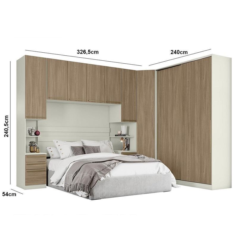 Quarto Modulado Casal Seletto 5 Peças 2 Portas Deslizante Areia/jequitibá - Móveis Henn Areia/jequitibáQuarto Modulado Casal Seletto 5 Peças 2 Portas Deslizante - Móveis Henn O Quarto Modulado Seletto é completo e foi desenvolvido para atender as mais diversas necessidades de uso e espaço. Com ele, você tem muitas possibilidades de combinações e pode montar o quarto dos seus sonhos. Ele é composto por 5 módulos que podem ser montados de acordo com seu espaço. O modulado Seletto tem 240,5 cm de altura, 2 opções de cores e mais de 10 módulos disponíveis, permitindo criar composições únicas.ESPECIFICAÇÕES: - Estrutura MDP - Pintura UV - 7 Portas de giro em BP - 2 Portas de correr em BP - 3 Gavetas internas - 6 Gavetas externas - Dobradiças 35mm com amortecimento - Corrediças telescópicas - Cabideiros em alumínio - Puxador alça em alumínio - Detalhe ripado no painel - Compatível com cama até 165cm - Amplo espaço interno O ambiente é composto por (L x A x P): 2x MC02-184 Mesa de Cabeceira 1 Porta 3 Gavetas: 40 x 240,5 x 54 cm 1x MC11-184 Ponte Casal 4 Portas: 165 x 185 x 54 cm 1x MC07-184 Guarda-Roupa Canto Oblíquo 1 Porta: 81,5 x 240,5 x 81,5 cm 1x MC10-184 Guarda-Roupa 2 Portas Deslizante: 158,5 x 240,5 x 54,5 cm * Não acompanha cama e colchão Dimensões do Produto Montado: Altura: 240,5 cm Largura: 326,5 cm x 240 cm Profundidade Maior: 81,5 cm Profundidade Menor: 54 cm Garantia: 3 meses Montagem: O Produto vai desmontado com manual e todos acessórios. Recomendamos que a montagem seja feita por um profissional Recomendação de Limpeza: Utilize pano levemente úmido Observações: - A LOJA se responsabilizará pela entrega dos produtos até aonde as rodovias alcançam, entregas fluviais ou aéreas devem ser cotadas a parte. - As imagens são ilustrativas, não acompanham objetos de decoração. - Pode haver alguma diferença de tonalidade entre a imagem e o produto, por conta do tratamento de imagens e a calibração de cores da sua tela. - A montagem será de responsabilidade do comprador. Entregamos até a porta de entrada da residência ou até a portaria do condomínio. Não nos responsabilizamos, no ato da entrega, por subir escadas/elevadores ou transporte por guincho em apartamentos. Eventuais despesas são de responsabilidade do comprador. - Confira as dimensões do produto no momento da compra e certifique-se de que passará normalmente por supostos elevadores, portas, escadas e/ou corredores de sua residência. Para mais informações, acesse nossa Central de Atendimento. Tipo de Guarda Roupa: Modulado | Tonalidade: Multicolorido | Quantidade de Portas: 9 | Fabricante: Henn Cor: Areia/Jequitibá
