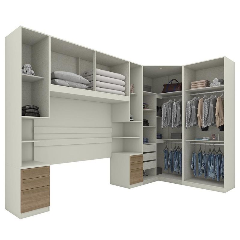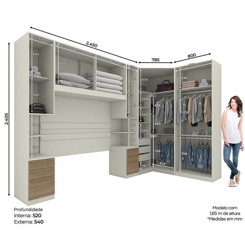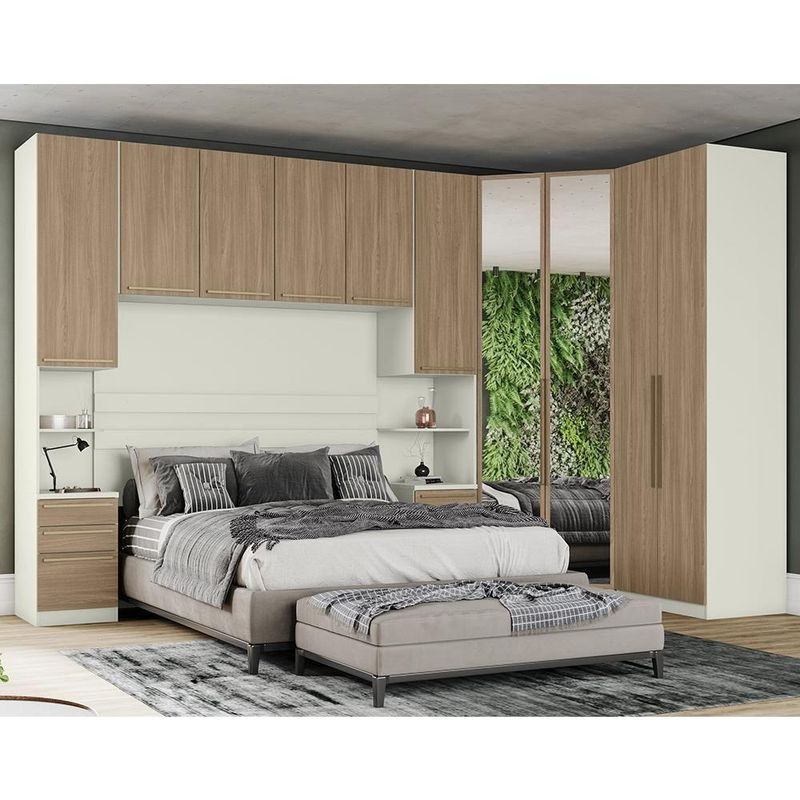 Quarto Modulado Casal Seletto 5 Peças Com Closet Areia/jequitibá - Móveis Henn Areia/jequitibáQuarto Modulado Casal Seletto 5 Peças com Closet - Móveis Henn O Quarto Modulado Seletto é completo e foi desenvolvido para atender as mais diversas necessidades de uso e espaço. Com ele, você tem muitas possibilidades de combinações e pode montar o quarto dos seus sonhos. Ele é composto por 5 módulos que podem ser montados de acordo com seu espaço. O modulado Seletto tem 240,5 cm de altura, 2 opções de cores e mais de 10 módulos disponíveis, permitindo criar composições únicas.ESPECIFICAÇÕES: - Estrutura MDP - Pintura UV - 10 Portas de giro em BP - 3 Gavetas internas - 6 Gavetas externas - Dobradiças 35mm com amortecimento - Corrediças telescópicas - Cabideiros em alumínio - Puxador alça em alumínio - Detalhe ripado no painel - Espelho - Compatível com cama até 165cm - Amplo espaço interno O ambiente é composto por (L x A x P): 2x MC02-184 Mesa de Cabeceira 1 Porta 3 Gavetas: 40 x 240,5 x 54 cm 1x MC11-184 Ponte Casal 4 Portas: 165 x 185 x 54 cm 1x MC06-184 Guarda-Roupa Canto Closet 2 Portas com Espelho: 109,5 x 240,5 x 109,5 cm 1x MC08-133 Guarda-Roupa 2 Portas: 80 x 240,5 x 54 cm * Não acompanha cama e colchão Dimensões do Produto Montado: Altura: 240,5 cm Largura: 354,5 cm x 189,5 cm Profundidade Maior: 81,5 cm Profundidade Menor: 54 cm Garantia: 3 meses Montagem: O Produto vai desmontado com manual e todos acessórios. Recomendamos que a montagem seja feita por um profissional Recomendação de Limpeza: Utilize pano levemente úmido Observações: - A LOJA se responsabilizará pela entrega dos produtos até aonde as rodovias alcançam, entregas fluviais ou aéreas devem ser cotadas a parte. - As imagens são ilustrativas, não acompanham objetos de decoração. - Pode haver alguma diferença de tonalidade entre a imagem e o produto, por conta do tratamento de imagens e a calibração de cores da sua tela. - A montagem será de responsabilidade do comprador. Entregamos até a porta de entrada da residência ou até a portaria do condomínio. Não nos responsabilizamos, no ato da entrega, por subir escadas/elevadores ou transporte por guincho em apartamentos. Eventuais despesas são de responsabilidade do comprador. - Confira as dimensões do produto no momento da compra e certifique-se de que passará normalmente por supostos elevadores, portas, escadas e/ou corredores de sua residência. Para mais informações, acesse nossa Central de Atendimento. Tipo de Guarda Roupa: Modulado | Tonalidade: Multicolorido | Quantidade de Portas: 10 | Fabricante: Henn Cor: Areia/Jequitibá
