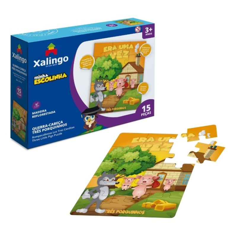 "O quebra-cabeça Três Porquinhos da Linha Minha Escolinha da Xalingo Brinquedos é composto por 15 peças em madeira que monta uma imagem. As peças são duráveis e de fácil manuseio. O objetivo do jogo é que a criança encontre e monte as peças de acordo com o modelo impresso na caixa. O jogo desenvolve a atenção, a coordenação motora e o pensamento lógico, enquanto apresenta uma figura divertida. Entretenimento e socialização. Estimulador da criatividade e da motricidade fina. Indicado para crianças a partir dos 3 anos de idade."