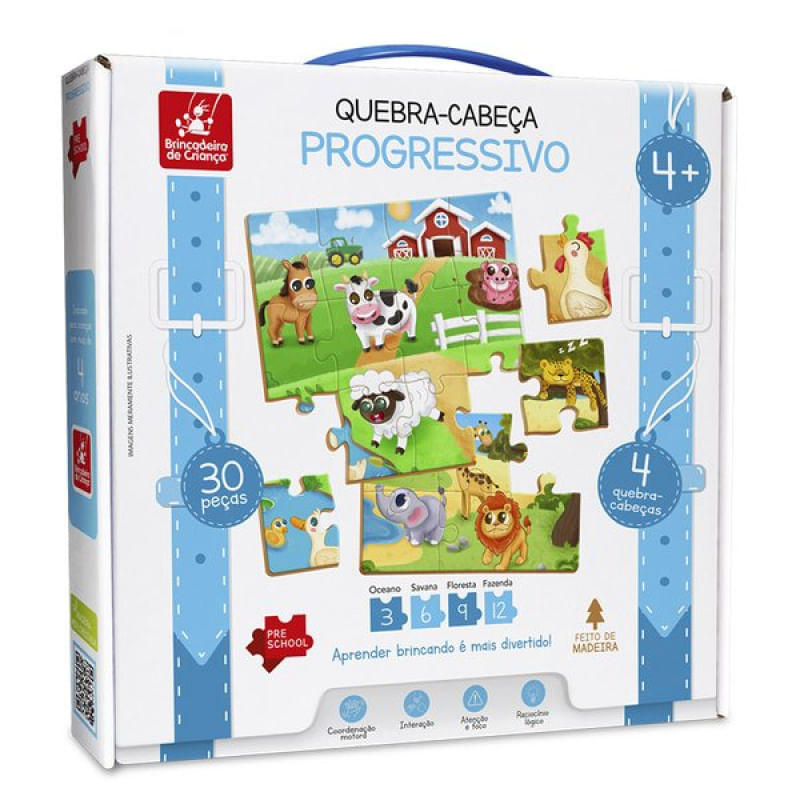Quebra Cabeça Progressivo - Material didático para crianças em fase escolar. São 4 quebra-cabeças progressivos, ou seja, seguem uma sequência: 3, 6, 9 e 12 peças, e cada um apresenta animais em habitats diferentes. São 30 peças em madeira, coloridas e divertidas que auxiliam em diversos aspectos no desenvolvimento da criança, entre eles: Interação, coordenação motora, atenção e foco. Características Gerais do Produto: • Faixa Etária: +4 • Faixa Etária: 1 a 5 anos de idade • Marca: Brincadeira de Criança • Material: Madeira MDF Acompanha o produto: • 4 Quebra-cabeças 30 peças em madeira. Garantia: • 7 dias de garantia