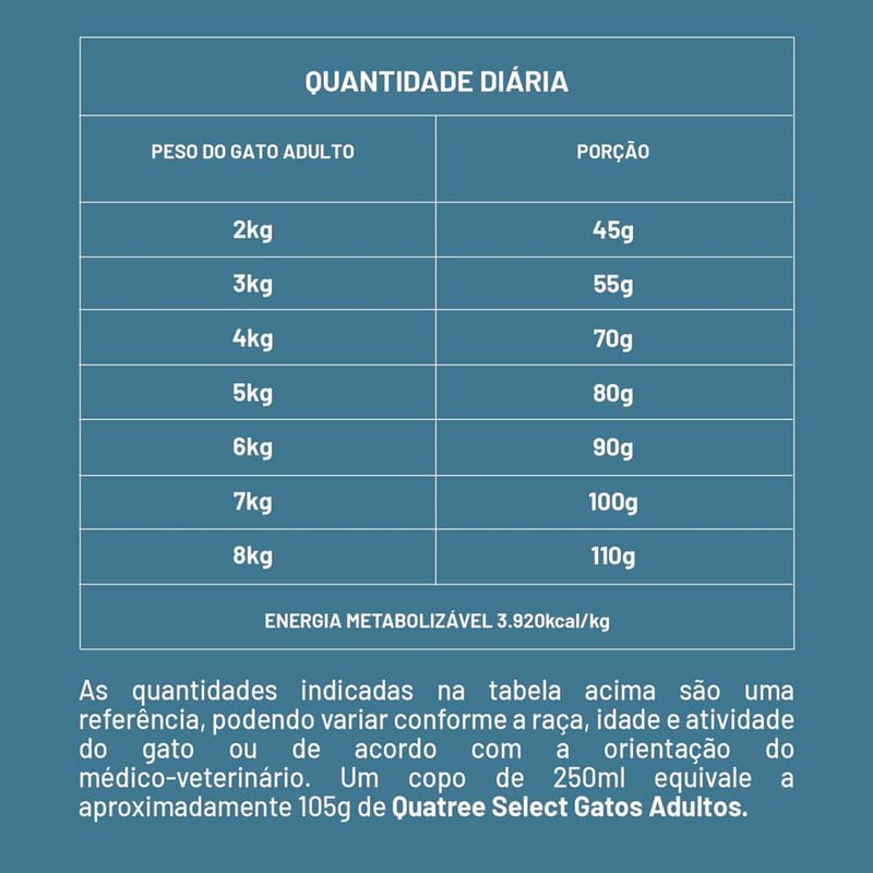 Ração Quatree Select Gatos Adultos 3kgO que é a Ração Quatree Select Gatos Adultos?A Ração Quatree Select Gatos Adultos é um alimento premium especialmente formulado para atender às necessidades nutricionais dos gatos adultos. Desenvolvida com ingredientes selecionados, ela proporciona uma alimentação equilibrada, saborosa e que contribui para a saúde e o bem-estar dos felinos.Para que serve a Ração Quatree Select Gatos Adultos?Manutenção da saúde urinária: Possui níveis controlados de minerais para ajudar na prevenção de problemas urinários.Pelos saudáveis: Rica em ômega 3 e 6, promovendo pelos brilhantes e pele saudável.Digestão facilitada: Contém prebióticos e fibras que auxiliam no bom funcionamento do trato intestinal.Saúde geral: Fórmula enriquecida com vitaminas e minerais essenciais para a vitalidade do seu gato.Como funciona a Ração Quatree Select Gatos Adultos?A Quatree Select Gatos Adultos combina nutrientes de alta qualidade com aditivos funcionais que garantem uma nutrição completa. Sua fórmula balanceada contribui para o fortalecimento do sistema imunológico, saúde do trato urinário e manutenção de um peso saudável, além de promover maior sabor para agradar o paladar exigente dos gatos.Como oferecer a Ração Quatree Select Gatos Adultos?Ofereça a quantidade diária recomendada na embalagem, dividida em pelo menos duas porções ao longo do dia.Certifique-se de que seu gato tenha sempre água fresca e limpa à disposição.Adapte a quantidade de ração conforme as necessidades do seu gato, considerando idade, peso, nível de atividade e orientação do veterinário. Benefícios da Ração Quatree Select Gatos AdultosControle do pH urinário: Ajuda a evitar cálculos urinários.Pelagem sedosa: Enriquecida com ácidos graxos para a saúde da pele e do pelo.Alta digestibilidade: Fórmula leve e de fácil absorção.Sabor irresistível: Desenvolvida para agradar até os gatos mais seletivos.