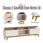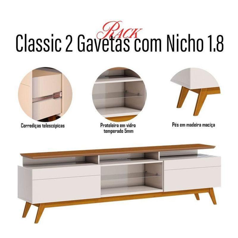 Rack Bancada Classic 2 Gavetas Com Nicho Off White Freijó Touch - ImcalRack Bancada Classic 2 Gavetas com Nicho Off White Freijó Touch - ImcalO rack da linha Classic é um móvel elegante e funcional que combina design clássico com praticidade. Desenvolvido em MDP/ MDF, é fabricado pela Imcal com materiais de alta qualidade garantindo mais durabilidade e resistência. Apresentando uma prateleira em vidro, proporciona um toque refinado permitindo que você coloque seus itens ou aparelhos eletrônicos. Além disso, possui três nichos espaçosos, ideais para acomodar seus aparelhos eletrônicos. Com duas gavetas equipadas com corrediças telescópicas, oferece espaço adicional para guardar seus acessórios. As corrediças telescópicas garantem um deslizamento suave e silencioso, tornando o acesso mais prático. Os pés em madeira maciça oferece mais estabilidade. Com suas linhas clássicas e detalhes cuidadosamente trabalhados, é a escolha perfeita para quem busca estilo, praticidade e qualidade superior. Confira e garanta o seu!Características técnicas:- Produzido em MDP/ MDF - Pintura na cor Off White Freijó Touch - Acabamento em UV fosco brilho - Possui 2 gavetas - Possui 3 nichos - Possui 1 prateleira em vidro temperado 5mm - Ideal para TVs de até 75 polegadas - Tampo em MDF de 25mm - Corrediças telescópicas - Pés e travessas em madeira maciça - Lindo designDimensões:Altura: 65,5 cm Largura: 180,2 cm Profundidade: 40,3 cm Informações importantes:*Não realizamos a montagem ou instalação do produto, porém acompanha manual de instruções. *Toda mercadoria segue segurada contra qualquer sinistro, em caso de anormalidade, recuse. *As caixas ou pacotes possuem identificação com o nome, cidade e quantidades de volumes relativos à compra para conferencia do recebedor. Largura: | Formato do móvel: | Marca: | Requer montagem: | Modelo: | Altura: | Profundidade: | Principais Características do Produto 0: | Principais Características do Produto 1: | Principais Características do Produto 2: | Fabricante: | Baterias são necessárias?: | do modelo: | Certificação de teste externa: | Is Fragile: | Dimensões do artigo: | Cor: | Componentes incluídos: | de caixas: | Quantidade de itens: | da peça: | Peso do item: