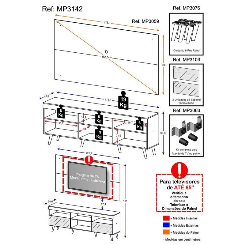 A sala de estar é o melhor lugar para receber a família e amigos, por isso ter um ambiente bonito e aconchegante é fundamental. O Rack com Painel e Suporte para 65" com Espelho e Pés Retrô Flórida Multimóveis é uma ótima opção para aproveitar seu espaço de maneira inteligente. Produzido em MDP com pintura UV, que garante maior durabilidade e facilidade na limpeza, possui espaço para os equipamentos eletrônicos e nichos para objetos decorativos, além de duas portas articuladas com espelho e um amplo espaço interno para manter seus pertences organizados. O painel para de até 65” possui espaçamento para passagem dos fios, que permite deixar os cabos mais organizados. Para facilitar a sua vida, este produto acompanha também o kit para fixação da . Muito prático e de fácil instalação, pode ser utilizado para ’s LCD, LED e plasma de 14” a 71”. Totalmente sobreposto, acompanha gabarito de montagem que auxilia na instalação. Conta com um sistema de encaixe rápido, possui 16mm de deslocamento que permite o ajuste do encaixe das peças. Os espelhos são de vidro (o que evita que a imagem fique distorcida) e lapidados, ou seja, passam por um processo para que as bordas não fiquem cortantes, o que garante maior . Os pés palito, estilo retrô, em polipropileno, dão um charme especial ao móvel deixando-o com um visual leve e permitindo você compor um ambiente com ar vintage e moderno ao mesmo tempo.Conteúdo da Embalagem:1 (um) painel1 (um) rack1 (um) kit com suporte para 1 (um) kit com 2 espelhos1 (um) kit com 6 pés retrôDimensões do produto montado:Altura: 181cm | Largura: 175cm | Profundidade: 34,6cmPainel Altura: 90cm | Largura: 175cm | Profundidade: 2,5cmRack Altura: 63,6cm | Largura: 175cm | Profundidade: 34,6cm*Você pode consultar as medidas internas na imagem técnica do produto.*Devido as variações de tamanho dos televisores no mercado, sugerimos que verifique as medidas da sua e compare com o painel antes de efetuar a compra.*As cores do produto podem sofrer variações de tonalidade de acordo com as configurações do seu dispositivo.Imagem meramente ilustrativa. Decoração e eletros não acompanham o produto. O produto será entregue desmontado e não disponibilizamos o de montagem.