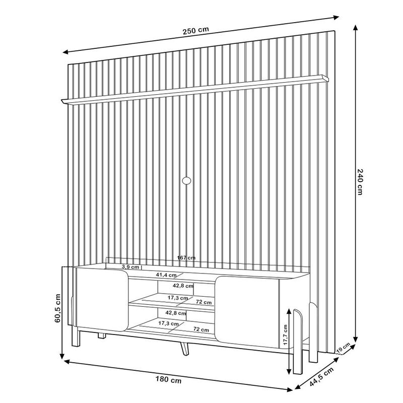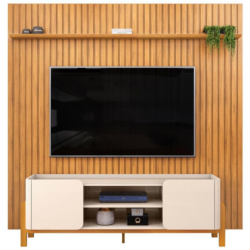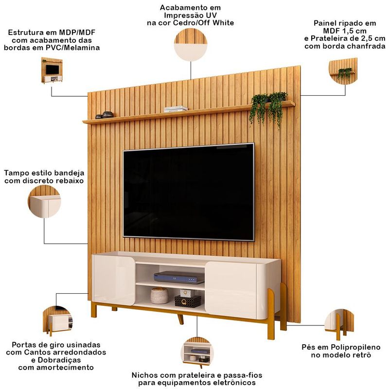 Transforme sua sala de estar em um verdadeiro oásis de elegância e conforto com o exclusivo, Rack Para Sala Chelsea com o Painel Ripado para TV Lexa, a combinação perfeita que faltava na sua decoração! Com um design que reflete as tendências mais atuais do universo do design, esse painel não é apenas um suporte para sua TV de até 75 polegadas - ele é a verdadeira estrela do seu espaço. Feito com peças ripadas de MDF de 15mm, cada detalhe foi pensado para trazer elegância e modernidade ao seu lar. Já o rack bancada com cantos arredondados e design orgânico agrega um toque suave e acolhedor para qualquer ambiente, ao passo que os pés em madeira maciça não só garantem resistência e durabilidade, como também conferem um charme rústico que harmoniza perfeitamente com diferentes estilos de decoração! Não perca a chance de ter essa peça incrível em sua casa! Clique e descubra como esse rack com painel pode ser o complemento perfeito para o seu lar! Dimensões total do Painel (L x A x P) 250x 240 x 19 cm Medidas Internas Painel Espaço livre para a TV: 249 x 200 cm Características Painel: Estrutura em MDP/MDF com acabamento das bordas em PVC/Melamina. Peças na cor Off White com impressão ultravioleta alto brilho e cor Cedro texturizada fosca. Painel ideal para TV de até 75 polegadas. 01 prateleira de 25mm com borda chanfrada, pode ser instalada acima ou abaixo da TV. Painel ripado em MDF 15mm, pode ser aproveitado em diversos ambientes. Possui furação para passagem de cabos. Suporta até 40 kg. Dimensões total do Rack (L x A x P) 180 x 60,5 x 44,5 cm Medidas Internas Rack Nichos (L x A x P): 72 x 42,8 x 17,3 cm Altura dos Pés: 17,7 cm Tampo interno livre (L x A x P): 167 x 3,9 x 41,4 cm Características Rack: Estrutura e prateleiras em MDP, portas em MDF e acabamento das bordas em Melamina. Peças na cor Off White com impressão ultravioleta alto brilho e cor Cedro texturizada fosca. Ideal para TV de até 65 polegadas sobre o tampo. 02 portas de giro usinadas com cantos arredondados e dobradiças com amortecimento. Pés de madeira maciça com sapatas. 02 Nichos com prateleira e passa-fios para equipamentos eletrônicos. Tampo estilo bandeja, com discreto rebaixo. Suporta até 40 kg no tampo, 2 kg na prateleira e 5 kg na base. - Produto entregue desmontado, acompanha manual de montagem. Sistema de montagem: Cavilhas e parafusos. - Este produto deve ser limpo com pano macio e seco. Não utilize produtos abrasivos como álcool e detergente, assim como esponjas rígidas ou palha de aço. - Proteja a superfície do móvel de objetos que transmitam calor ou umidade. Observações importantes: - Produto para uso residencial em ambiente interno, não devendo ficar exposto diretamente ao sol, calor e umidade excessivos. - Pode haver alguma diferença de tonalidade entre a imagem e o produto real, por conta do tratamento de imagens e a calibração de cores do seu monitor. - As imagens são meramente ilustrativas, não acompanham objetos de decoração e eletrônicos. - Ao receber a mercadoria, o cliente deve verificar as condições da embalagem, caso haja alguma avaria não assine o comprovante de recebimento. - Montagem, desmontagem e outras instalações serão de responsabilidade do cliente. Não nos responsabilizamos, no ato da entrega, por subir escadas/elevadores ou pelo transporte por guincho em apartamentos. Eventuais despesas são de responsabilidade do comprador. - Confira as dimensões do produto e certifique-se de que passará normalmente por supostos elevadores, portas, escadas e/ou corredores de sua residência.