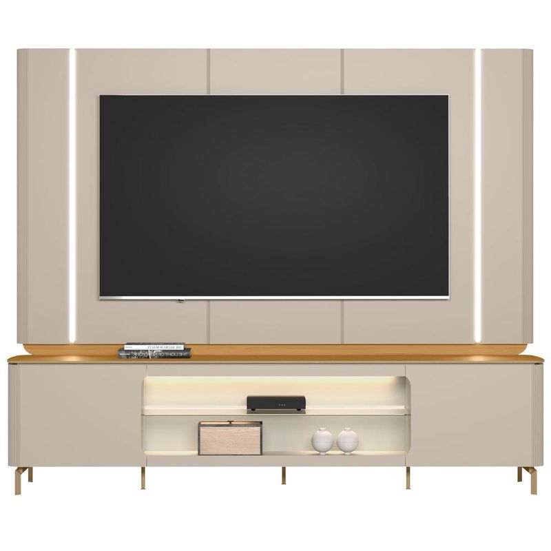 Descubra a harmonia perfeita entre modernidade e estilo orgânico com o Rack Para Sala com Painel Para TV Elysia, da Lyam Decor. Esse conjunto é a escolha ideal para quem busca beleza, funcionalidade e uma sala de estar moderna e completa. O painel para TV, com seus detalhes curvos canelados, suporta TVs de até 85 polegadas. Já o rack bancada, com tampo em MDF e pés metálicos dourados que evocam o charme industrial, complementa a elegância do ambiente. Os nichos centrais são ideais para organizar aparelhos eletrônicos e itens decorativos, enquanto as fitas de LED nas laterais do painel trazem um toque mágico à sua sala, criando um espaço acolhedor para momentos especiais. Juntos, esse rack com painel elevam sua decoração a um novo nível, unindo praticidade e beleza em qualquer ambiente da sua casa! Confira mais detalhes a seguir e garanta já o seu! Dimensões total do Rack (L x A x P) 240 x 59 x 45 cm Medidas Internas Rack Espaço para TV (L x P): 240 x 45 cm Nicho Superior (L x A x P): 121 x 17 x 39 cm Nicho Inferior (L x A x P): 122 x 20 x 41 cm Características do Rack: Estrutura em MDP e MDF. Peças na tonalidade Tauari e Off White com acabamento em pintura fosca. 02 portas de abrir em MDF 15mm com detalhe arredondado e chanfrado. Dobradiças metálicas com amortecedor caneca 35mm, para um fechar mais suave. 02 nichos centrais para aparelhos eletrônicos e/ou objetos decorativos. Tampo em MDF 9mm com detalhe arredondado. Cantos com moldura curva revestida canelada. 01 prateleira de vidro 4mm. Ideal para TVs de até 85 polegadas. Pés metálicos dourado, estilo industrial. Suporta até 45 kg distribuídos. Dimensões total do Painel (L x A x P) 240 x 141 x 6 cm Medidas Internas Painel Espaço para TV (L x A): 227 x 136 cm Características do Painel: Estrutura em MDP e MDF. Peças na tonalidade Tauari e Off White com acabamento em pintura fosca. Painel com detalhe chanfrado e moldura curva revestida canelada, estilo orgânico. Ideal para TVs de até 85 polegadas. ~ Acompanha fita de LED. Possui passa fios para melhor organização. Suporta até 40 kg distribuídos. - Produto entregue desmontado, acompanha manual de montagem. Sistema de montagem: Cavilhas, parafusos e girofix. - Este produto deve ser limpo com pano macio e seco. Não utilize produtos abrasivos como álcool e detergente, assim como esponjas rígidas ou palha de aço. - Proteja a superfície do móvel de objetos que transmitam calor ou umidade. Observações importantes: - Produto para uso residencial em ambiente interno, não devendo ficar exposto diretamente ao sol, calor e umidade excessivos. - Pode haver alguma diferença de tonalidade entre a imagem e o produto real, por conta do tratamento de imagens e a calibração de cores do seu monitor. - As imagens são meramente ilustrativas, não acompanham objetos de decoração e eletrônicos. - Ao receber a mercadoria, o cliente deve verificar as condições da embalagem, caso haja alguma avaria não assine o comprovante de recebimento. - Montagem, desmontagem e outras instalações serão de responsabilidade do cliente. Não nos responsabilizamos, no ato da entrega, por subir escadas/elevadores ou pelo transporte por guincho em apartamentos. Eventuais despesas são de responsabilidade do comprador. - Confira as dimensões do produto e certifique-se de que passará normalmente por supostos elevadores, portas, escadas e/ou corredores de sua residência.