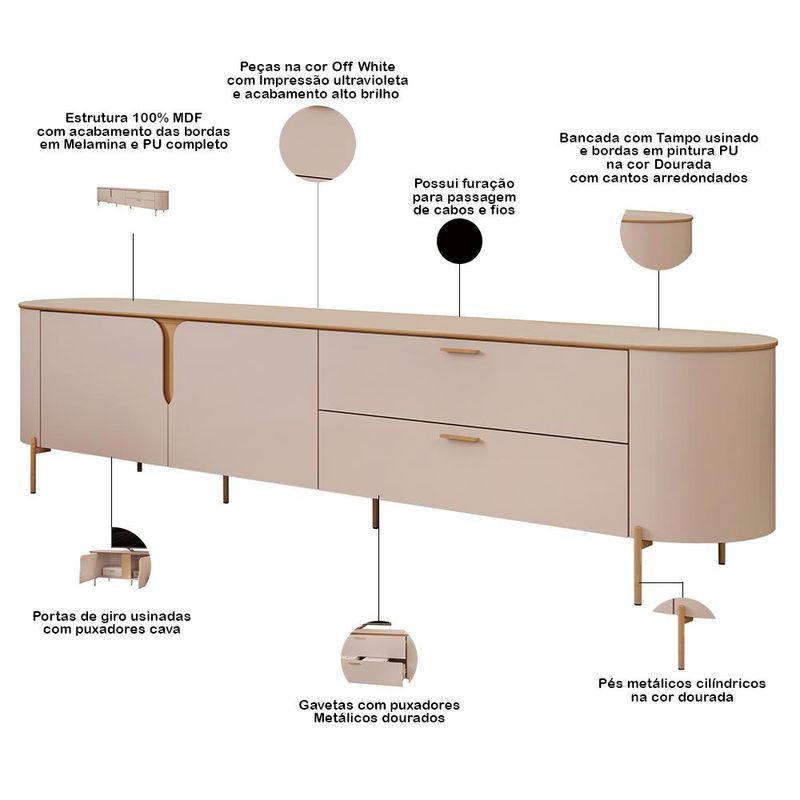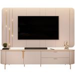 Transforme sua sala de estar em um verdadeiro oásis de estilo e conforto com o incrível conjunto de Rack para Sala com Painel para TV de 75 polegadas Dion, da Lyam Decor. Esse móvel foi cuidadosamente projetado para unir a elegância do design orgânico com a modernidade do estilo industrial, criando um ambiente acolhedor e sofisticado. Os contornos suaves e os cantos arredondados do painel e rack não apenas conferem um visual harmônico, mas também garantem que a estética orgânica se destaque em qualquer decoração, trazendo um ar de tranquilidade e beleza natural para sua sala. Já os pés metálicos na cor dourada proporcionam um contraste perfeito, adicionando um elemento de robustez e confere estabilidade ao móvel, ao passo que a tonalidade dourada traz um toque de glamour, que combina com qualquer paleta de cores. Para completar essa experiência visual, o painel para TV conta com iluminação LED que valoriza ainda mais a sua TV, criando uma atmosfera acolhedora, ideal para momentos de lazer e entretenimento com a família e amigos. Invista em um móvel que não seja somente funcional, mas também transforma a sua sala de em um espaço estiloso e convidativo. Garanta já o seu! Dimensões total do produto (L x A x P) 241 x 189 x 47 cm. Dimensões do Painel (L x A x P) 240 x 132 x 5 cm. Dimensões do Rack (L x A x P) 241 x 57 x 47 cm. Medidas Internas Espaço para TV no Painel (L x A): 203,3 x 132 cm Espaço para TV na Bancada (L x A): 241 x 45 cm Características: Estrutura 100% MDF com acabamento das bordas em Melamina e PU completo. Peças na cor Off White com impressão ultravioleta e acabamento alto brilho. Painel com frisos chanfrados e luminárias na cor dourada. Ideal para TV de até 75 polegadas em ambas as peças. Suporta até 40 kg no Painel e 40 kg na Bancada, ambos distribuídos. Bancada com tampo usinado e bordas em pintura PU na cor dourada. 02 portas de giro usinadas com puxadores cava. 02 gavetas com puxadores metálicos dourados. Pés metálicos cilíndricos na cor dourada. Possui furação para passagem de cabos e fios. Painel e Bancada com cantos arredondados, estilo orgânico. - Produto entregue desmontado, acompanha manual de montagem. Sistema de montagem: Cavilhas, parafusos e minifix. - Este produto deve ser limpo com pano macio e seco. Não utilize produtos abrasivos como álcool e detergente, assim como esponjas rígidas ou palha de aço. - Proteja a superfície do móvel de objetos que transmitam calor ou umidade. Observações importantes: - Produto para uso residencial em ambiente interno, não devendo ficar exposto diretamente ao sol, calor e umidade excessivos. - Pode haver alguma diferença de tonalidade entre a imagem e o produto real, por conta do tratamento de imagens e a calibração de cores do seu monitor. - As imagens são meramente ilustrativas, não acompanham objetos de decoração e eletrônicos. - Ao receber a mercadoria, o cliente deve verificar as condições da embalagem, caso haja alguma avaria não assine o comprovante de recebimento. - Montagem, desmontagem e outras instalações serão de responsabilidade do cliente. Não nos responsabilizamos, no ato da entrega, por subir escadas/elevadores ou pelo transporte por guincho em apartamentos. Eventuais despesas são de responsabilidade do comprador. - Confira as dimensões do produto e certifique-se de que passará normalmente por supostos elevadores, portas, escadas e/ou corredores de sua residência.
