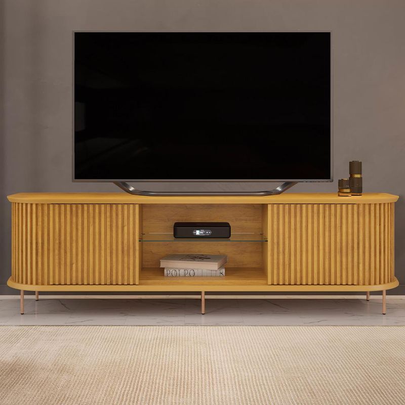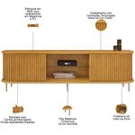 Se você busca sofisticação e elegância para sua sala de estar, o Rack Para Sala de Estar TV 75 Pol Atlantis D05 Cedro é a escolha perfeita. O design orgânico com cantos curvos harmoniza com as portas ripadas e os pés metálicos, trazendo um toque de contemporaneidade e seguindo as últimas tendências de decoração. Mais que o quesito estético, esse rack para TV ainda proporciona funcionalidade ímpar, já possui duas portas deslizantes para armazenar objetos, além de dois nichos para aparelhos eletrônicos e prateleira de vidro. Para completar o visual, o passa-fios facilita a organização dos cabos e mantém a bancada sempre em ordem. Adicione um toque de sofisticação a sua sala de estar com o rack bancada Atlantis. Você vai se surpreender. Dimensões do produto (L x A x P) 218 x 62,5 x 45 cm. Medidas dos nichos (L x A x P): 70,5 x 38,3 x 20,4 cm | 70,5 x 30 x 20,4 cm. Características: Estrutura em MDF com acabamento em Melamina e PU. Peças na cor Cedro Impressão texturizada fosca. Tampo e base em MDF 25mm chanfradas com pintura PU. Bancada com cantos arredondados e pés metálicos cilíndricos na cor dourada. 01 Prateleira de Vidro de 6mm. 02 portas deslizantes ripadas. Suporta TV de até 75 polegadas. Peso máximo suportado 40 kg distribuídos?. - Produto entregue desmontado, acompanha manual de montagem. Sistema de montagem: Minifix, Cavilhas e Parafusos. - Este produto deve ser limpo com pano macio e seco. Não utilize produtos abrasivos como álcool e detergente, assim como esponjas rígidas ou palha de aço. - Proteja a superfície do móvel de objetos que transmitam calor ou umidade. Observações importantes: - Produto para uso residencial em ambiente interno, não devendo ficar exposto diretamente ao sol, calor e umidade excessivos. - Pode haver alguma diferença de tonalidade entre a imagem e o produto real, por conta do tratamento de imagens e a calibração de cores do seu monitor. - As imagens são meramente ilustrativas, não acompanham objetos de decoração e eletrônicos. - Ao receber a mercadoria, o cliente deve verificar as condições da embalagem, caso haja alguma avaria não assine o comprovante de recebimento. - Montagem, desmontagem e outras instalações serão de responsabilidade do cliente. Não nos responsabilizamos, no ato da entrega, por subir escadas/elevadores ou pelo transporte por guincho em apartamentos. Eventuais despesas são de responsabilidade do comprador. - Confira as dimensões do produto e certifique-se de que passará normalmente por supostos elevadores, portas, escadas e/ou corredores de sua residência.