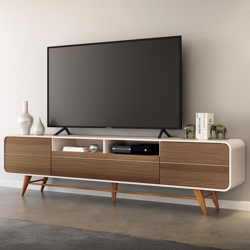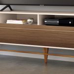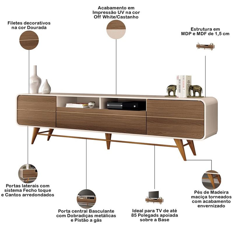 Descubra o Rack Para Sala Erah, da Lyam Decor, uma peça que transcende a funcionalidade e se transforma em uma verdadeira obra de arte para o seu espaço. Com um design moderno e orgânico, esse rack bancada é a escolha perfeita para quem busca um toque sofisticado e contemporâneo na decoração. Com um tampo espaçoso, o Rack Erah é ideal para suportar TVs de grandes dimensões, ou seja, até 85 polegadas, tornando-se o centro de entretenimento da sua casa, enquanto portas oferecem espaço suficiente para armazenar os mais diversos itens, mantendo tudo organizado e ao seu alcance. Já os nichos centrais são ideais para dispor os aparelhos eletrônicos. Para completar, os pés em madeira maciça não apenas garantem estabilidade, como também conferem um charme rústico que complementa o design moderno. Cada detalhe foi pensado para criar uma peça que é ao mesmo tempo prática e cheia de personalidade. Enfim, esse rack moderno é, sem dúvida, uma peça-chave para quem deseja transformar a sala de estar em um espaço aconchegante e estiloso. Aproveite! Dimensões total do produto (L x A x P) 220 x 57 x 40 cm Medidas Internas Espaço livre para TV (L x P): 160 x 32,5 cm Nichos (L x A): 51,5 x 12 cm Características: Estrutura em MDP e MDF de 15mm. Peças na cor Off White em impressão UV Alto Brilho e peças na cor Castanho com acabamento em impressão UV Texturizada. Ideal para TV de até 85 polegadas apoiada sobre a base. 02 portas laterais com sistema fecho toque e cantos arredondados. 01 porta central basculante com dobradiças metálicas e pistão a gás. Filetes decorativos na cor dourada. Pés de madeira maciça torneados com acabamento envernizado. Suporta até 40 kg distribuídos. - Produto entregue desmontado, acompanha manual de montagem. Sistema de montagem: Cavilhas, parafusos e girofix. - Este produto deve ser limpo com pano macio e seco. Não utilize produtos abrasivos como álcool e detergente, assim como esponjas rígidas ou palha de aço. - Proteja a superfície do móvel de objetos que transmitam calor ou umidade. Observações importantes: - Produto para uso residencial em ambiente interno, não devendo ficar exposto diretamente ao sol, calor e umidade excessivos. - Pode haver alguma diferença de tonalidade entre a imagem e o produto real, por conta do tratamento de imagens e a calibração de cores do seu monitor. - As imagens são meramente ilustrativas, não acompanham objetos de decoração e eletrônicos. - Ao receber a mercadoria, o cliente deve verificar as condições da embalagem, caso haja alguma avaria não assine o comprovante de recebimento. - Montagem, desmontagem e outras instalações serão de responsabilidade do cliente. Não nos responsabilizamos, no ato da entrega, por subir escadas/elevadores ou pelo transporte por guincho em apartamentos. Eventuais despesas são de responsabilidade do comprador. - Confira as dimensões do produto e certifique-se de que passará normalmente por supostos elevadores, portas, escadas e/ou corredores de sua residência.